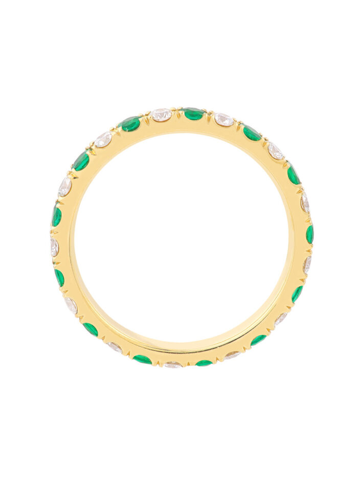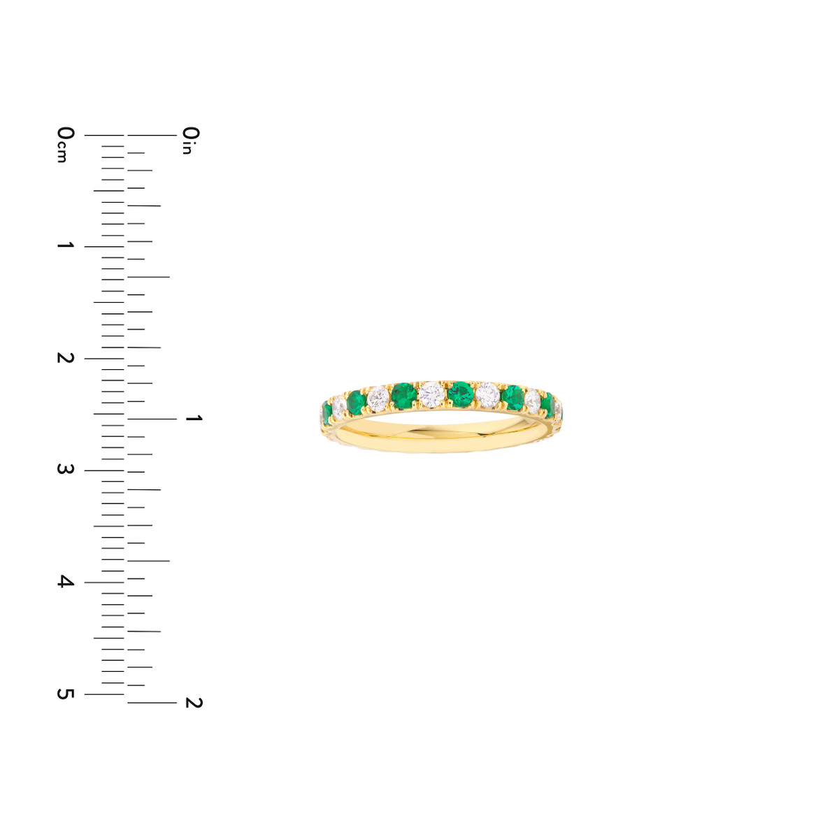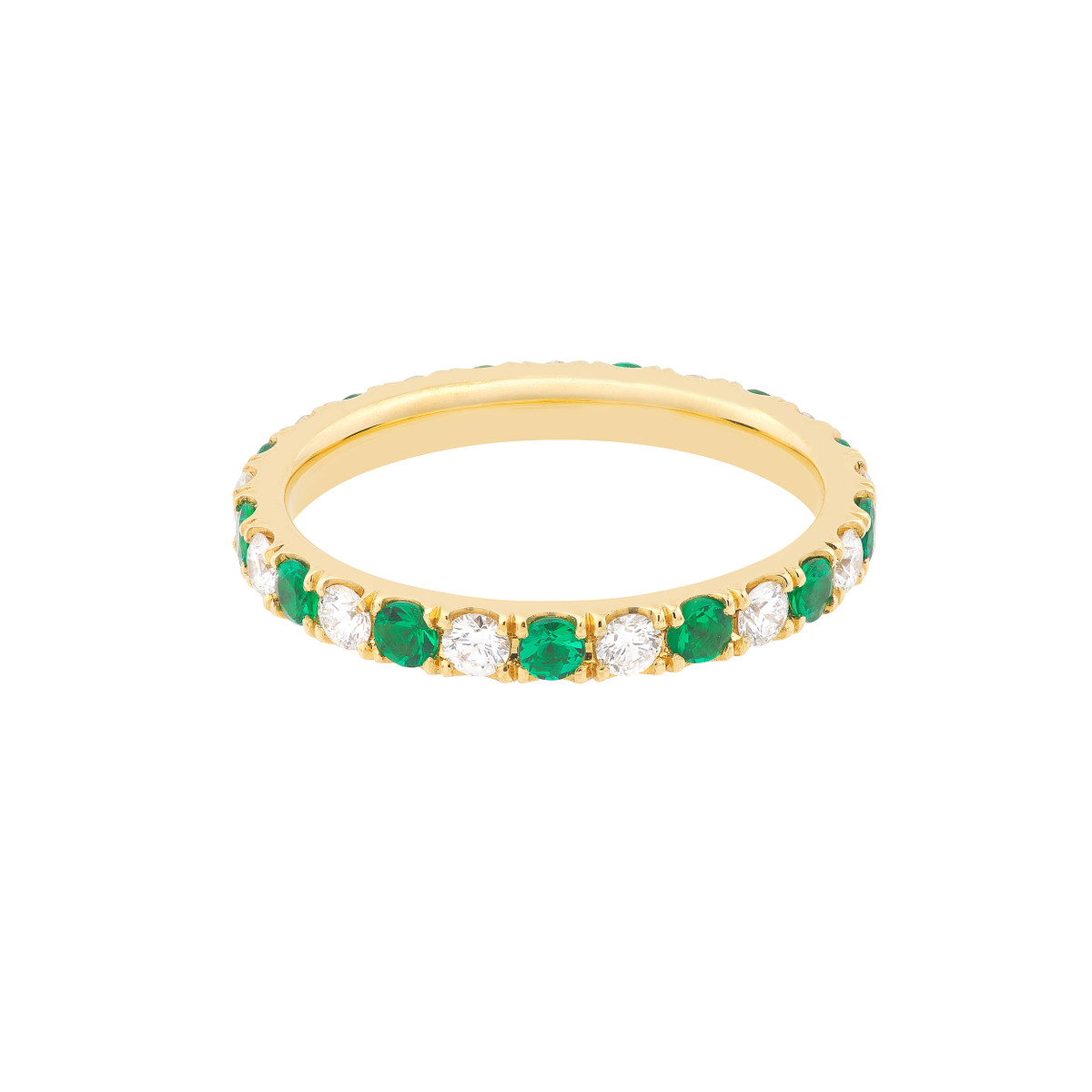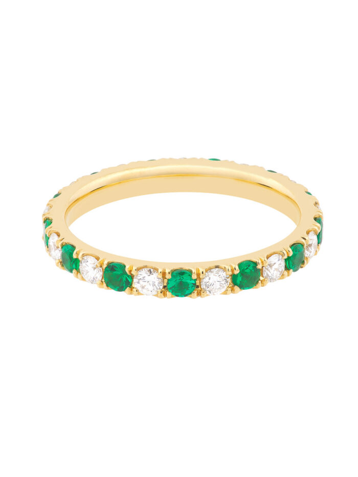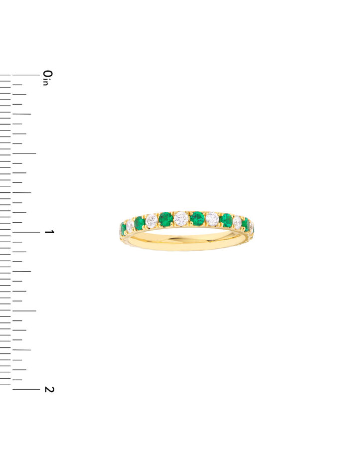Experience the timeless allure of the Emerald & Diamond Eternity Band. This classic ring is a symbol of enduring commitment, beautifully crafted with 1/2tcw of vibrant emeralds and sparkling diamonds in lustrous 14K yellow gold. Made-to-order with meticulous care, this band radiates elegance and sophistication, making it the perfect choice for celebrating your special day.
