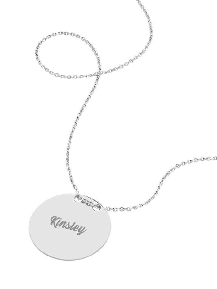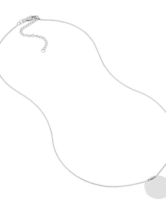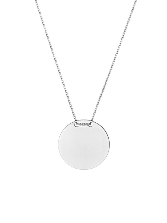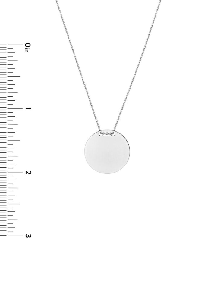 Make a statement with this exquisite 14K white gold engravable circle plate necklace. Perfect for adding a personal touch, you can have a special name, date, or message engraved on the plate, making it a truly unique and meaningful piece. The adjustable lobster clasp closure ensures a comfortable and secure fit. At 18 inches in length, this necklace is the ideal complement to any outfit.