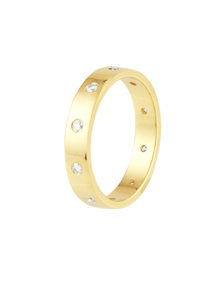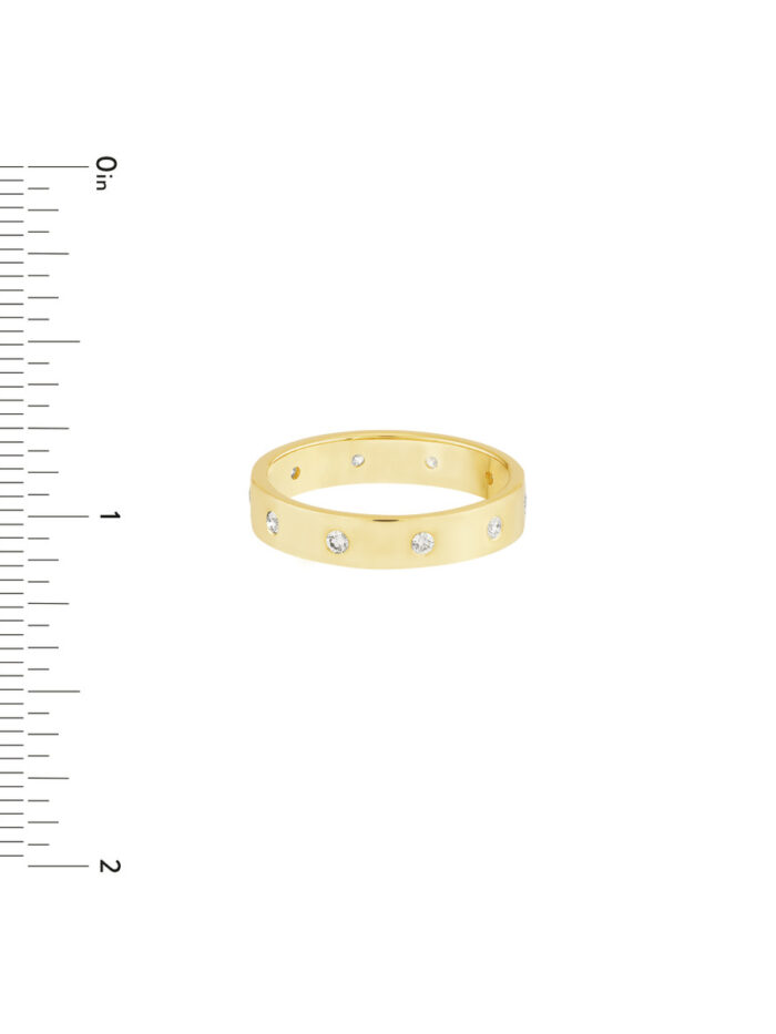 Make a timeless statement with our Flush Set Diamond Band. This elegant 4mm band features a row of beautifully set diamonds, creating a captivating sparkle that will catch the eye. Crafted in 14K yellow gold, it exudes both luxury and durability. This stunning band is perfect for celebrating your love story.