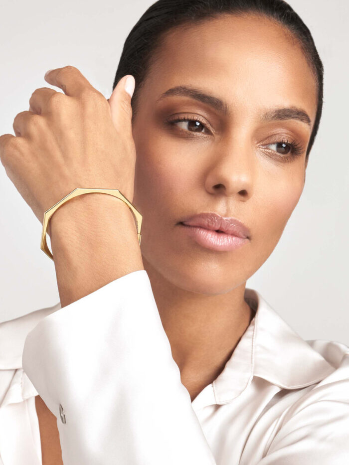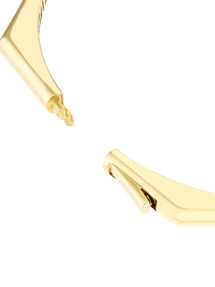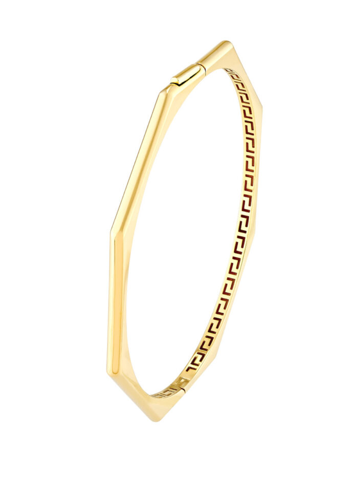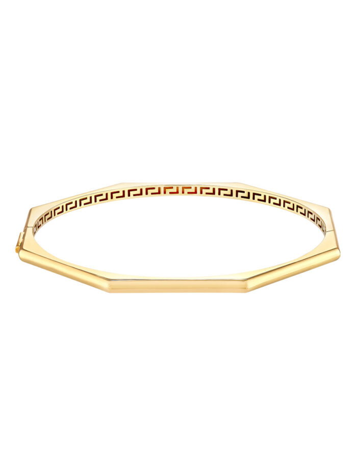Make a statement with this eye-catching geometric octagon bangle bracelet crafted in shimmering 10K yellow gold. This bangle features a unique octagon shape with an intricate Greek key design on the interior, adding a touch of timeless elegance. The hinged clasp ensures a secure and comfortable fit.