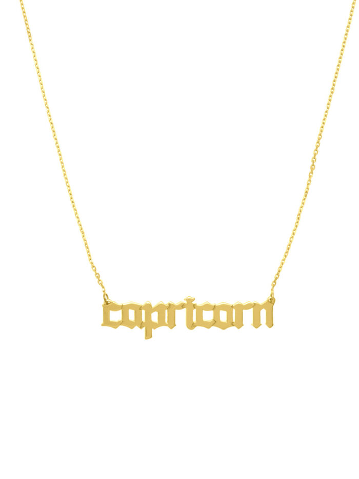 Embrace your astrological spirit with this captivating Gothic Capricorn Nameplate Necklace. Crafted from gleaming 14K yellow gold, the pendant showcases the name “Capricorn” in a striking gothic font, embodying your proud, focused, and motivated nature. The 18-inch link chain adds a touch of classic elegance, allowing the pendant to shine. This necklace is a sophisticated and stylish way to express your zodiac sign.
