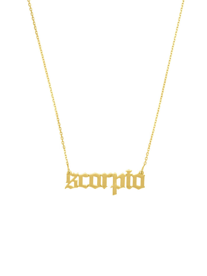 Ignite your passion with this captivating Gothic Scorpio Nameplate Necklace. Forged from lustrous 14K yellow gold, the pendant features the name “Scorpio” in a captivating gothic font, embodying your loyal, devoted, and passionate nature. The 18-inch link chain provides a graceful base for the pendant, creating a timeless and elegant look. This necklace is a powerful symbol of your zodiac sign.