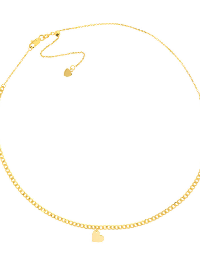 Make a statement with this versatile sideways heart dangle choker necklace. Crafted from 14K yellow gold, the open curb chain adds a touch of vintage charm, while the delicate heart pendant brings a feminine touch. The adjustable chain lets you customize the fit for a perfect look every time. Change your look as much as you’d like.
