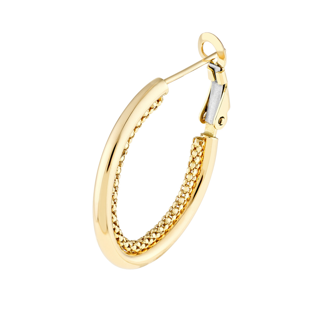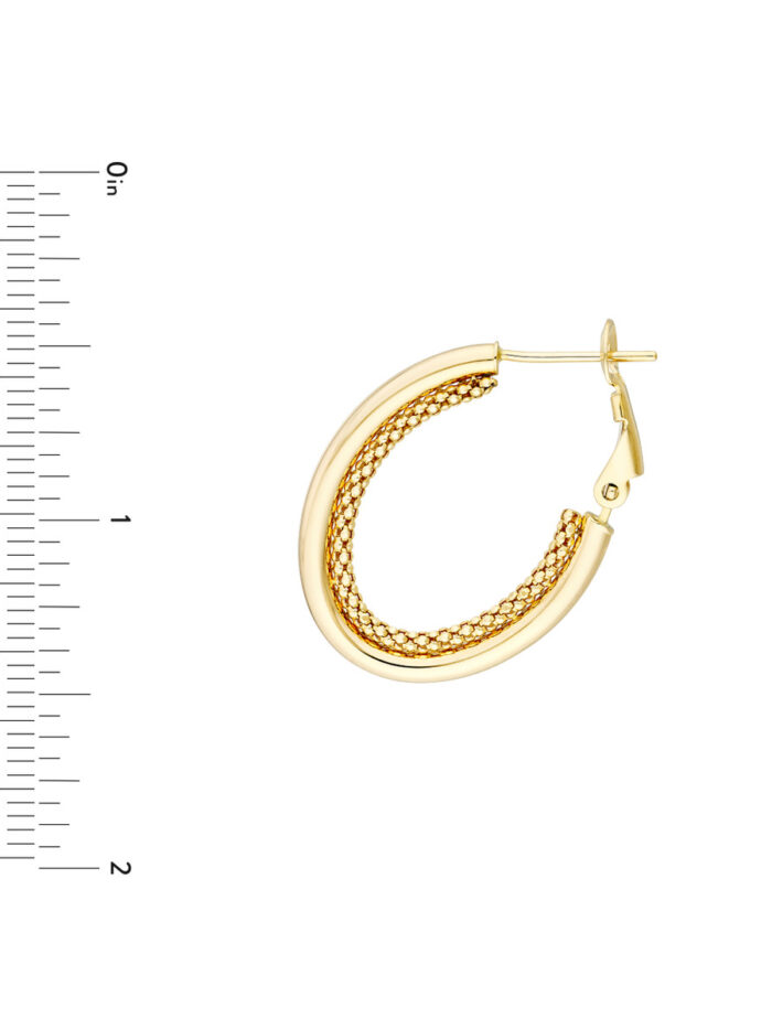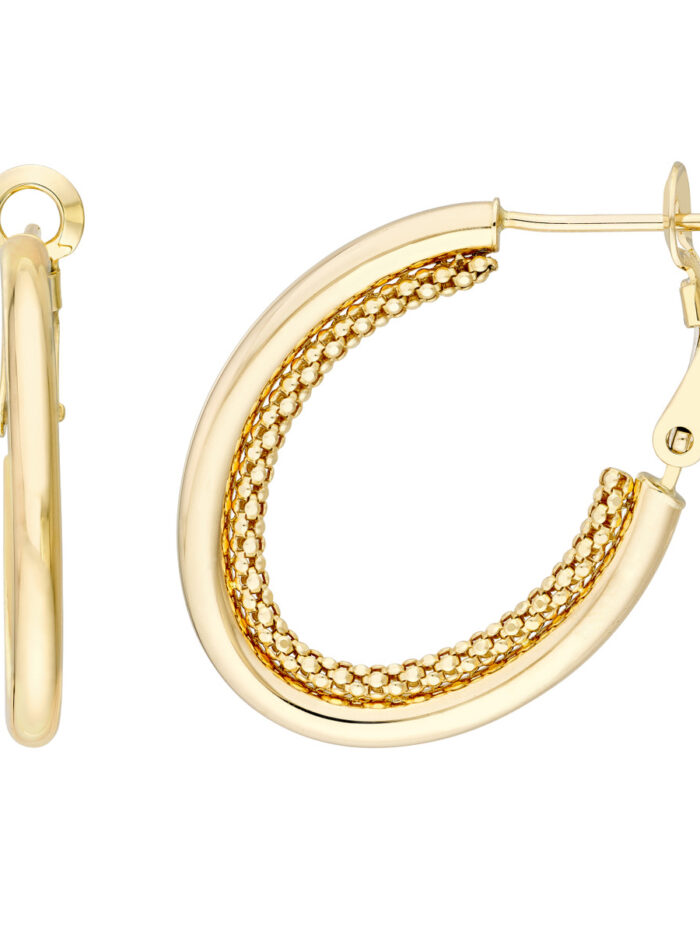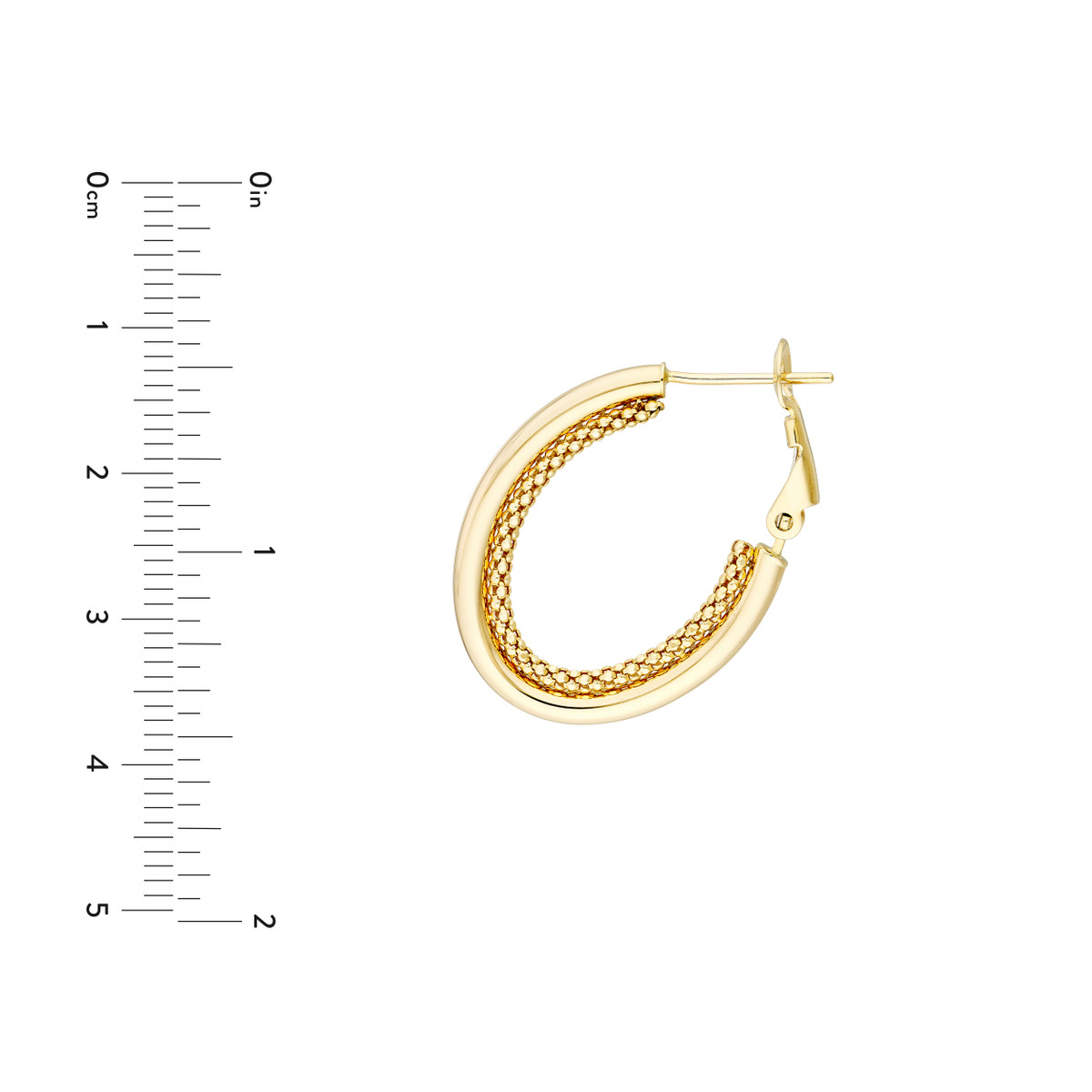 Add a touch of playful sophistication to your style with these high polish popcorn double hoop earrings. Crafted from lustrous 14K yellow gold, the popcorn design adds a unique and eye-catching texture. The double hoop silhouette offers a modern and trendy look. The secure omega back closure ensures they stay comfortably in place.