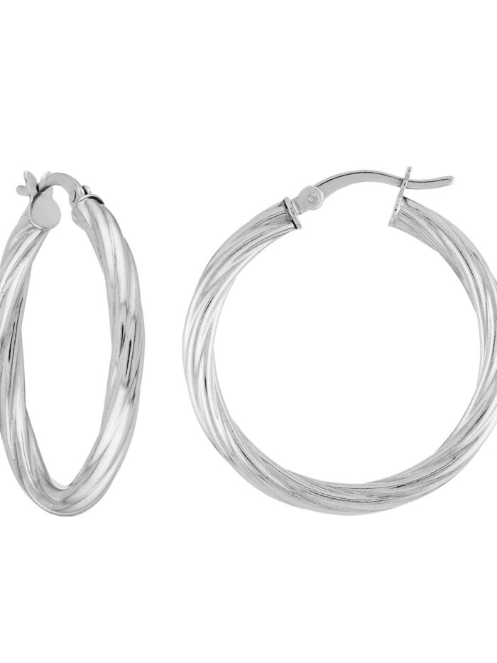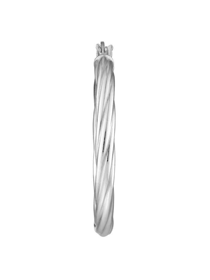 These sophisticated high-polished twist sterling silver hoop earrings offer a timeless and elegant look. Rhodium plating adds a layer of protection and enhances the silver’s brilliance. The tightly twisted design creates a striking visual appeal.