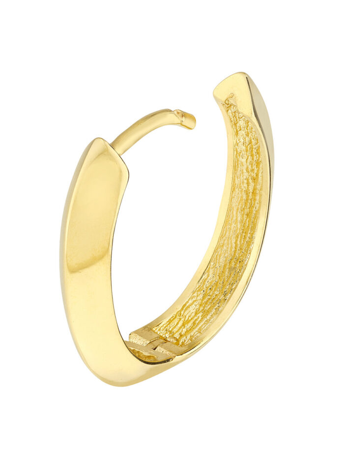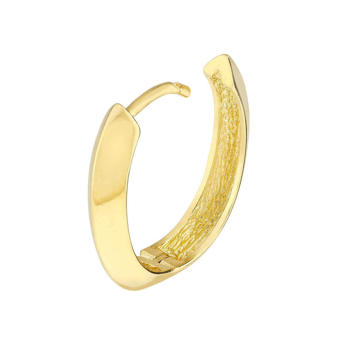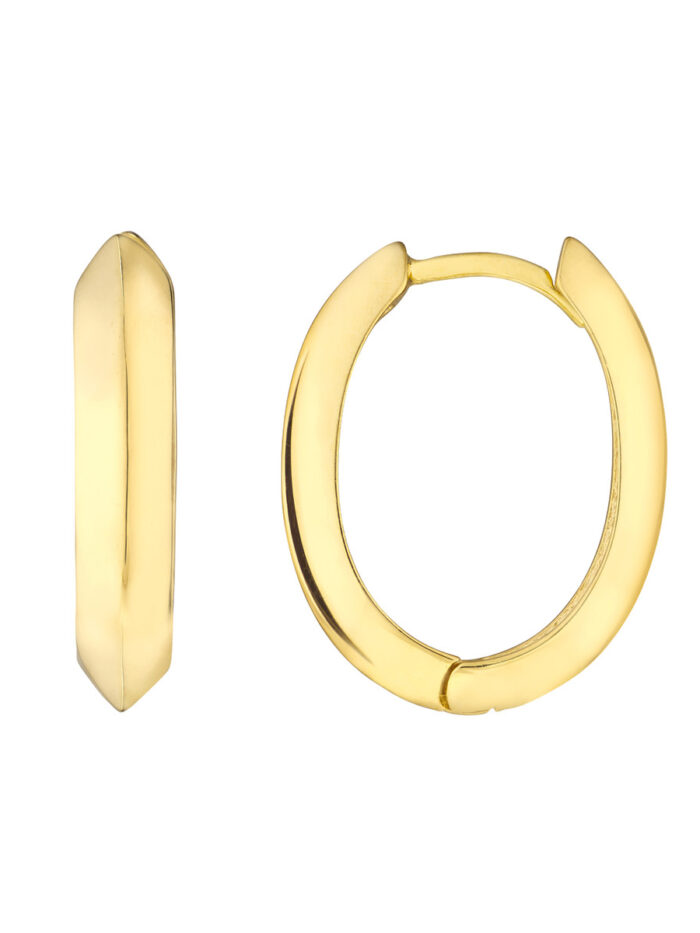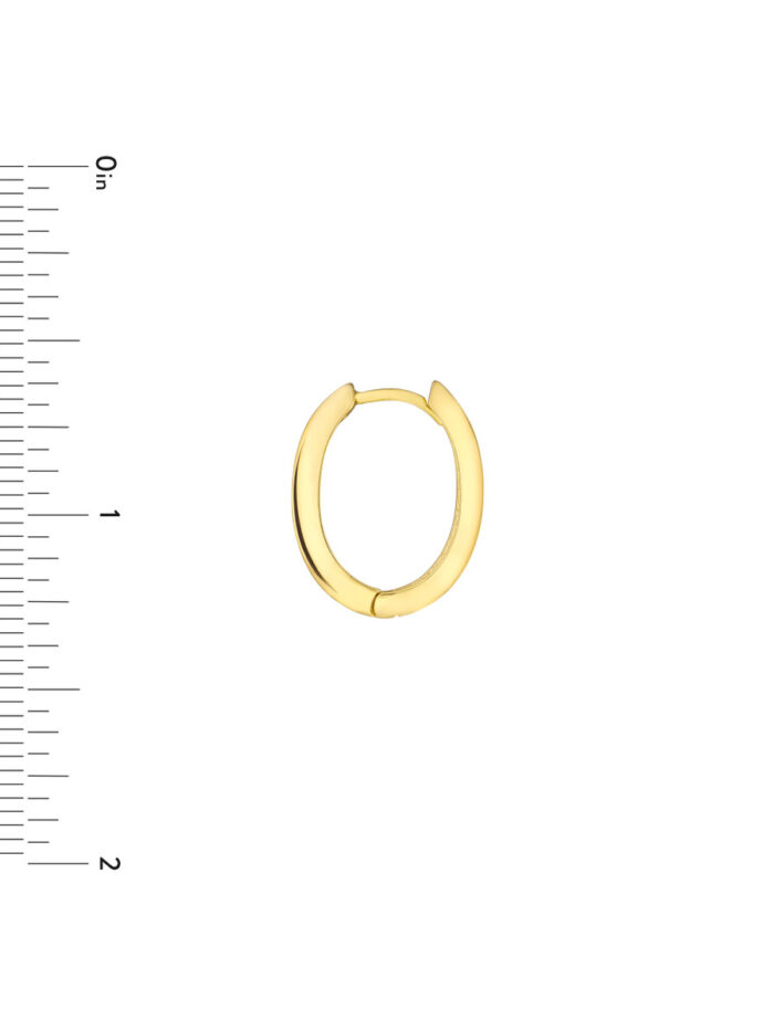These 9.5mm x 13.3mm x 3.3mm knife edge oval huggie earrings are designed to make a subtle yet stylish statement. Crafted in 10K yellow gold, they offer a sleek and modern look that complements any outfit. The hinge closure ensures a secure and comfortable fit, making them perfect for everyday wear.