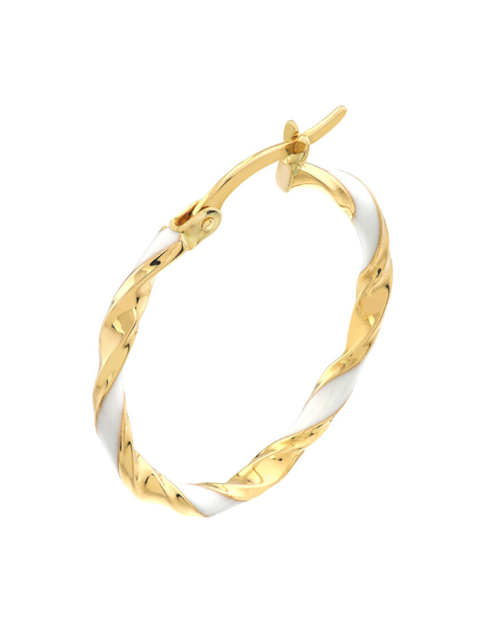 Make a bold statement with these Large White Enamel Round Twist Hoops. Made from 14K yellow gold, these earrings feature a classic round shape with a modern twist design and a lustrous white enamel finish. The hinge closure ensures a secure and comfortable fit. These earrings are the perfect way to add a touch of glamour to any outfit.