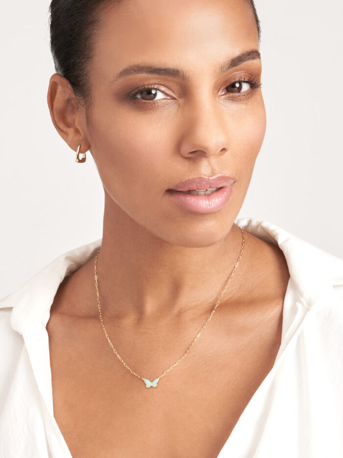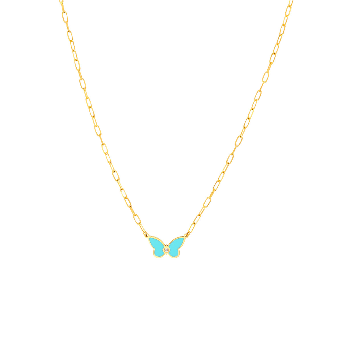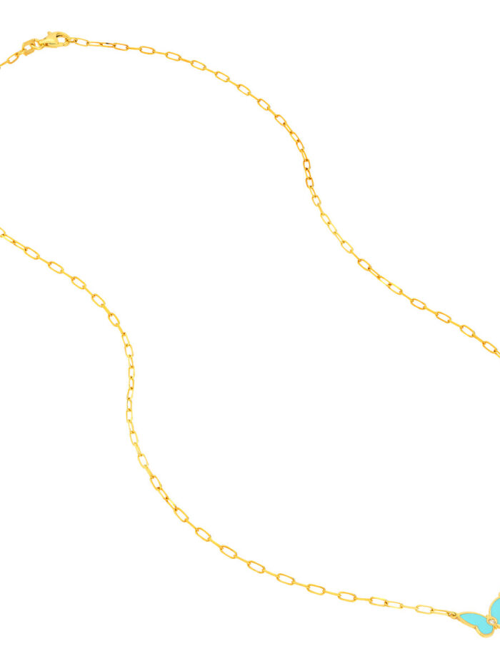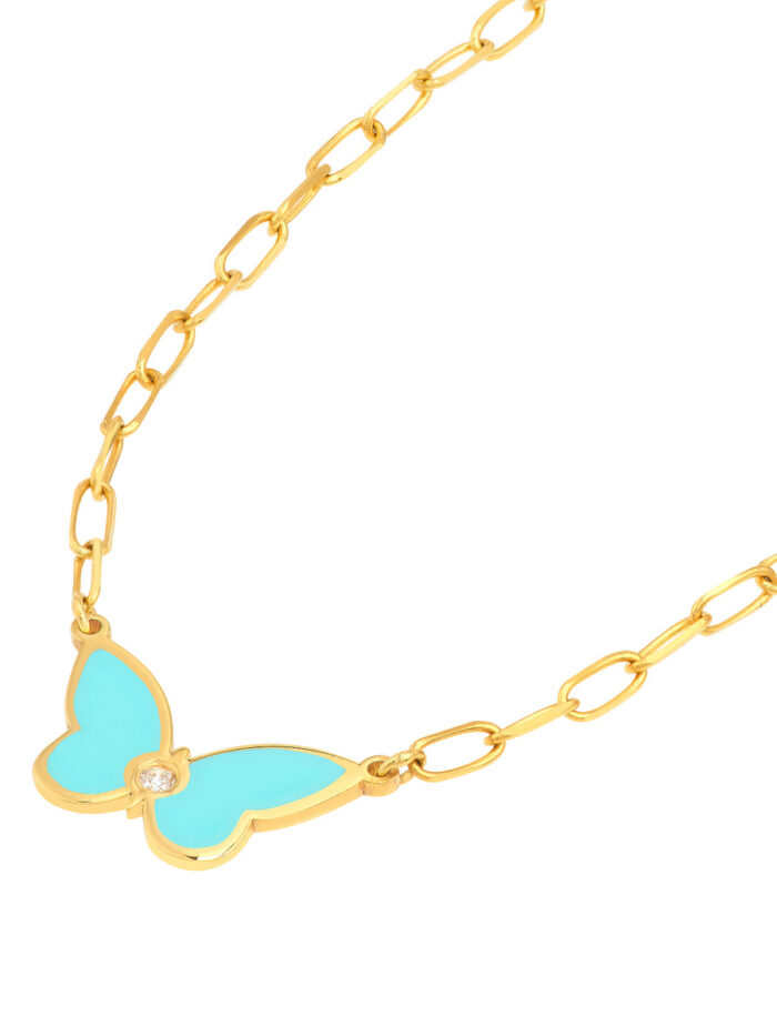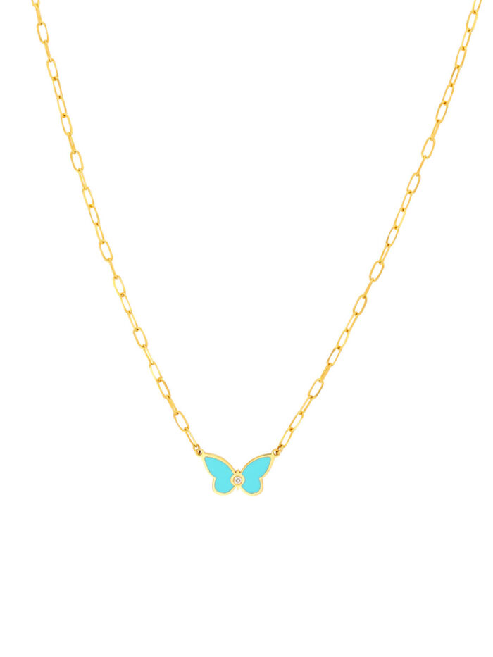 Embrace your delicate side with this enchanting light turquoise enamel butterfly necklace. The butterfly pendant, adorned with a sparkling diamond accent, symbolizes transformation and beauty. Crafted from lustrous 14K yellow gold, this necklace hangs gracefully from a classic cable chain, known for its smooth, interlocking links.