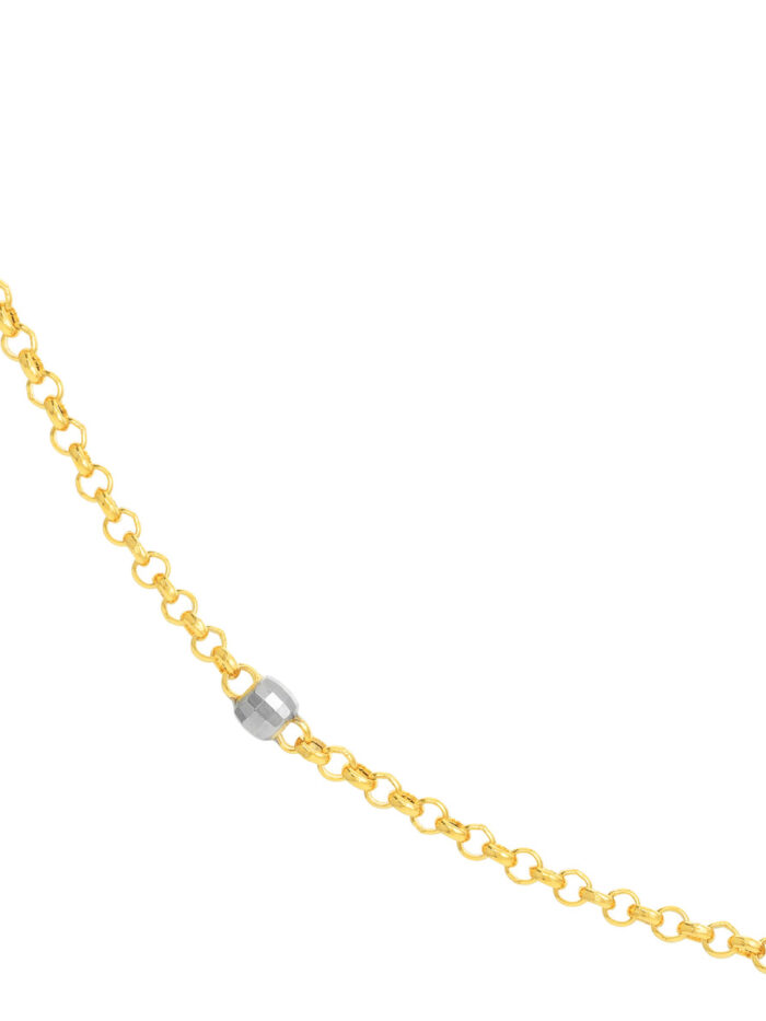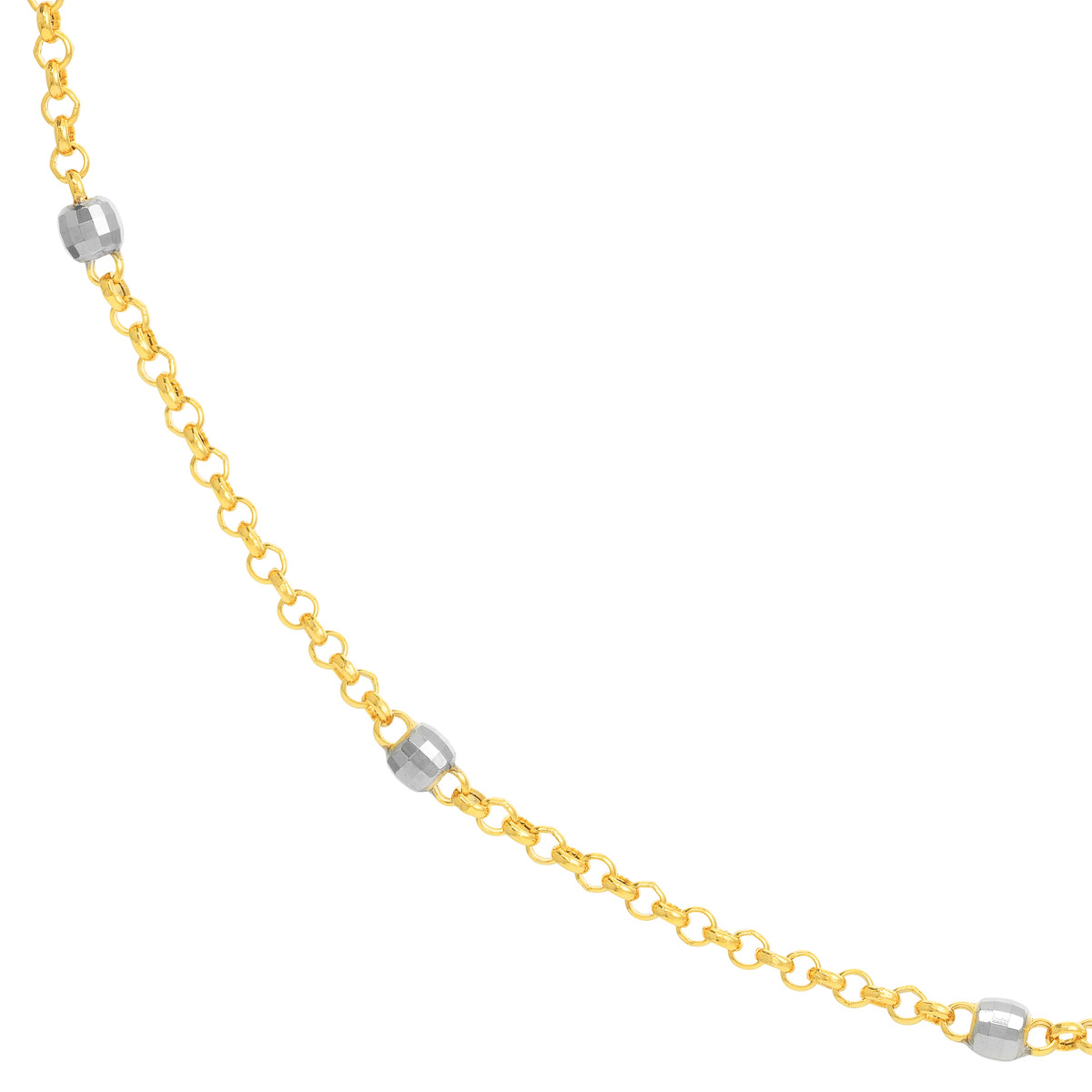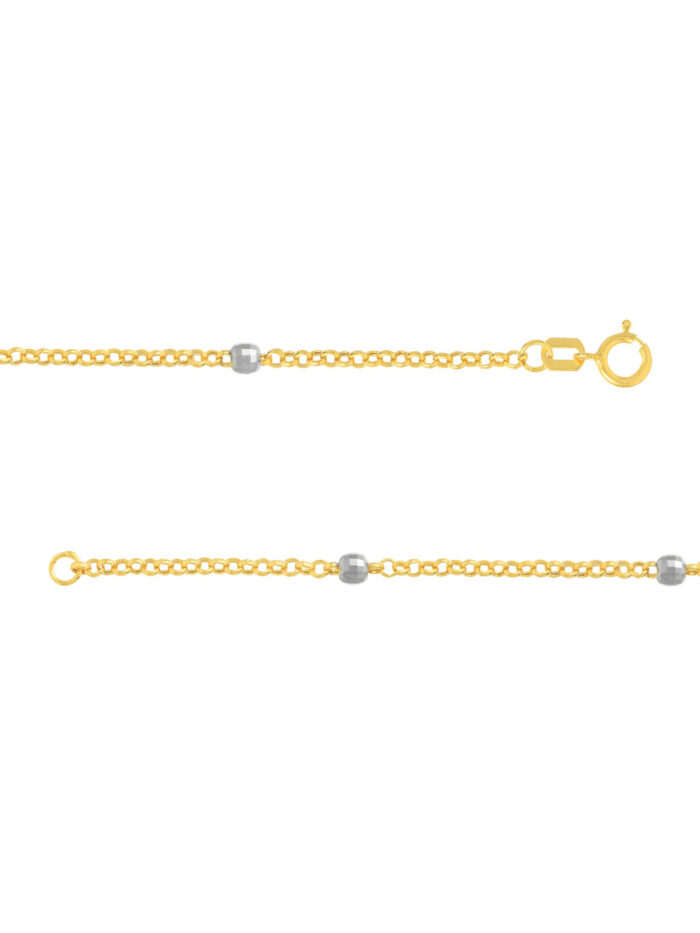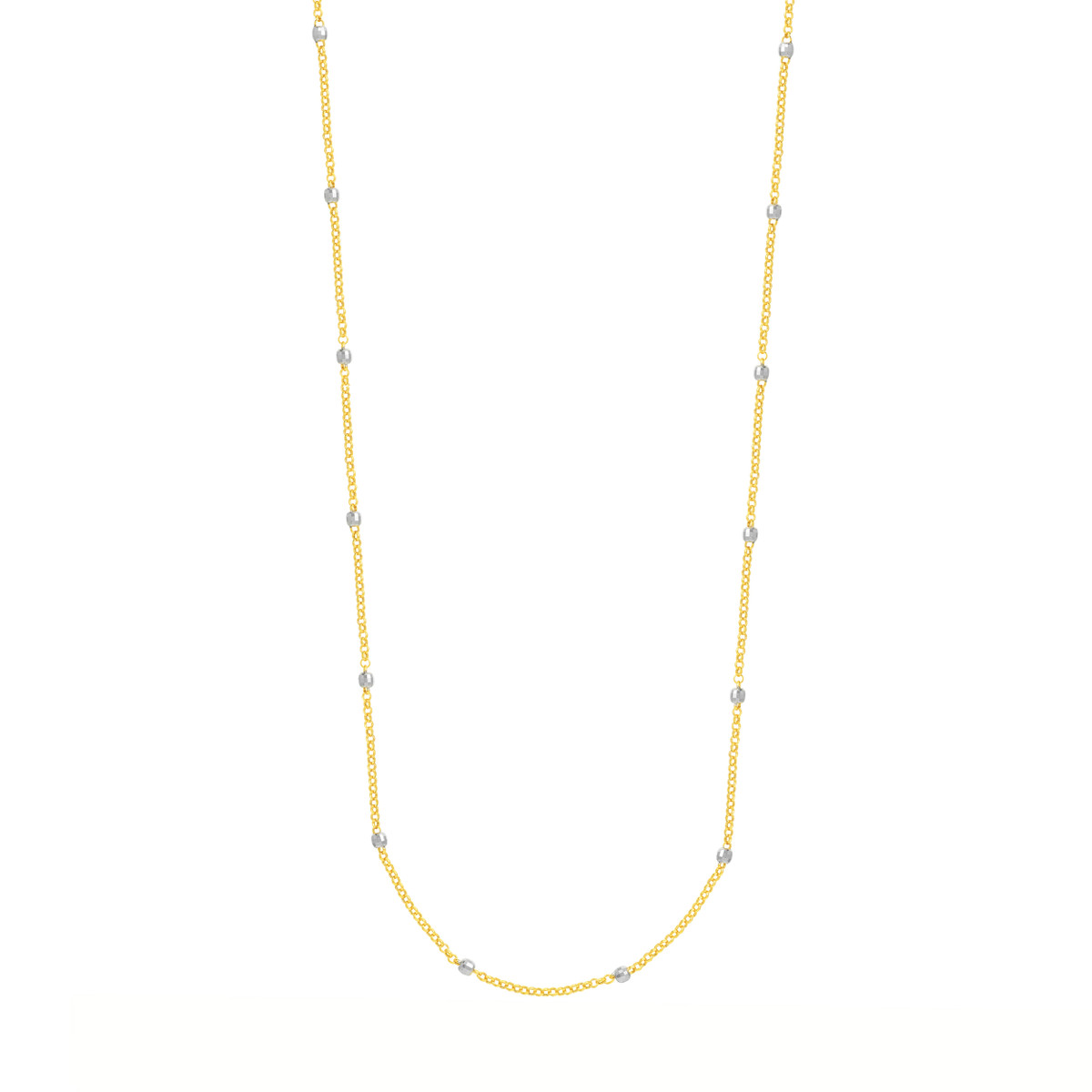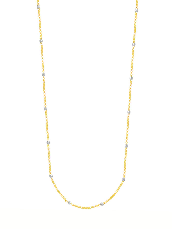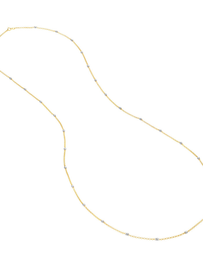 Get ready to shine with the Long & Lovely Two-Tone D/C Bead Station Necklace! This stunning piece features a shimmering combination of 14K yellow and white gold, adorned with beautiful 3mm diamond cut beads on a classic rolo chain. At 36 inches long, it gracefully drapes around your neck, adding a touch of elegance and sophistication to any outfit.