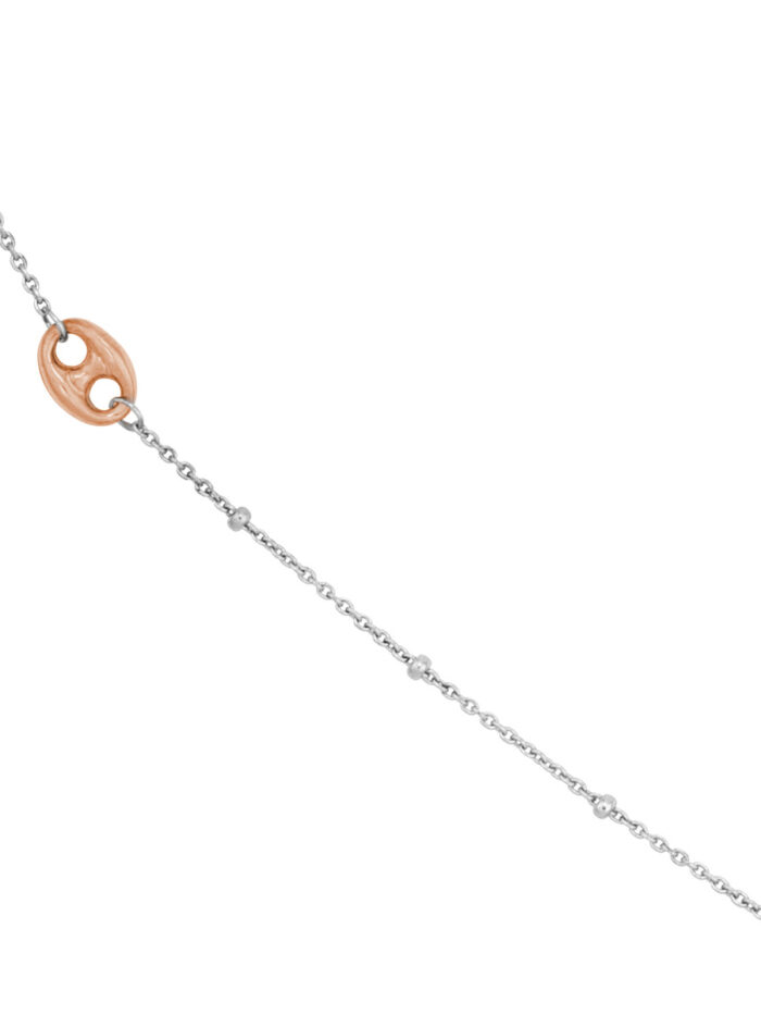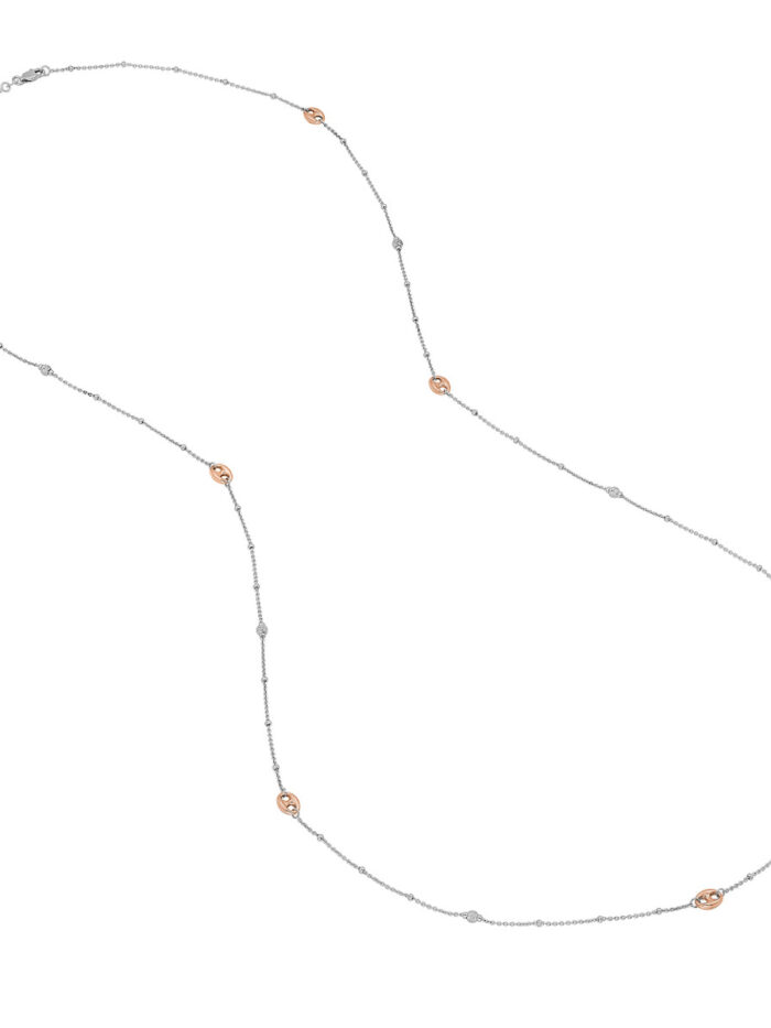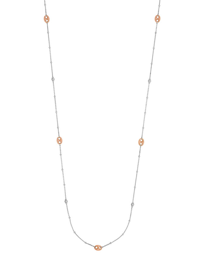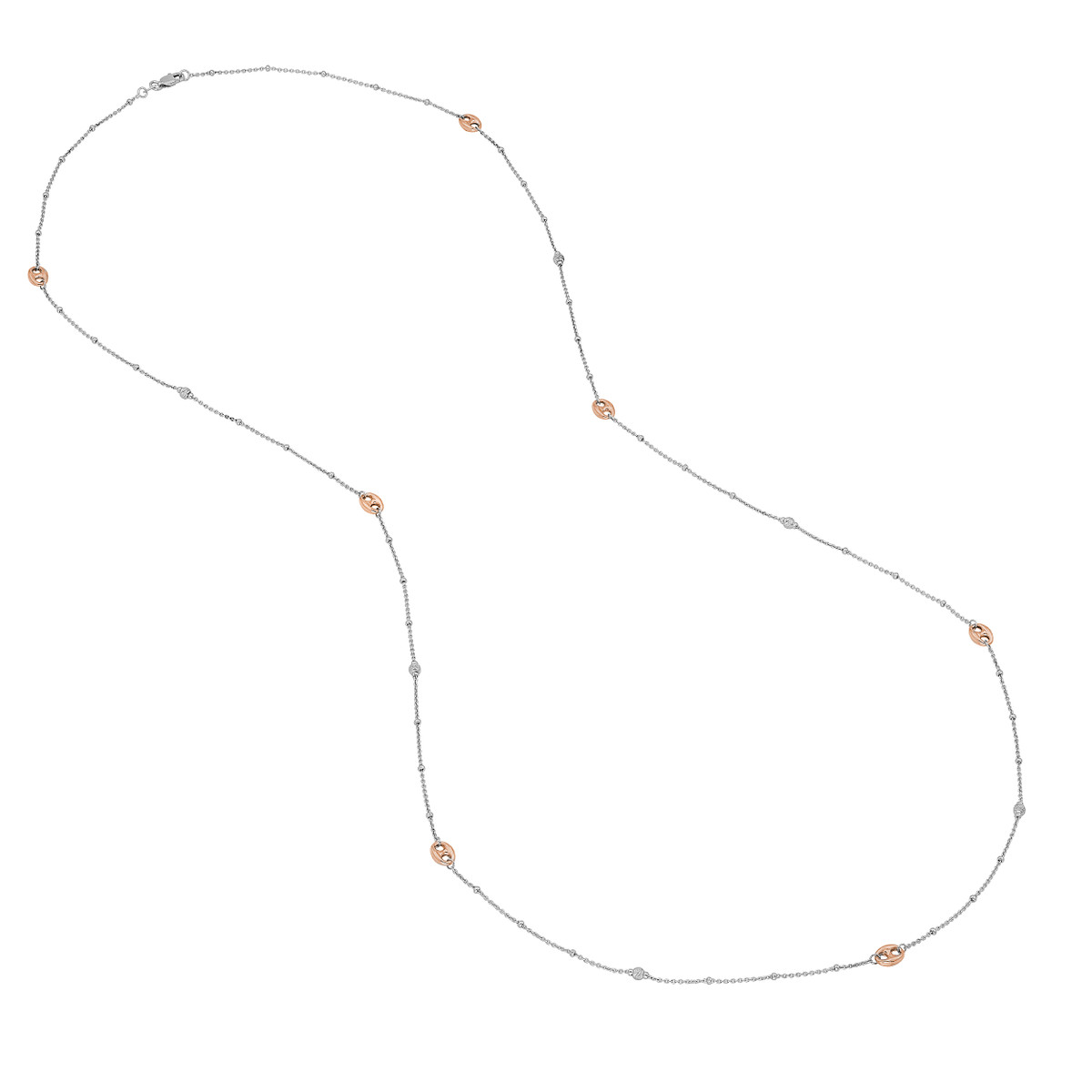 Make a statement with this stunning 36-inch long mariner chain necklace. The classic mariner chain is accented with brilliant diamond-cut beads, adding a touch of sparkle. Crafted from sterling silver and plated in rose gold, this necklace offers a luxurious look and feel. The secure hinge clasp ensures a comfortable and confident wear.