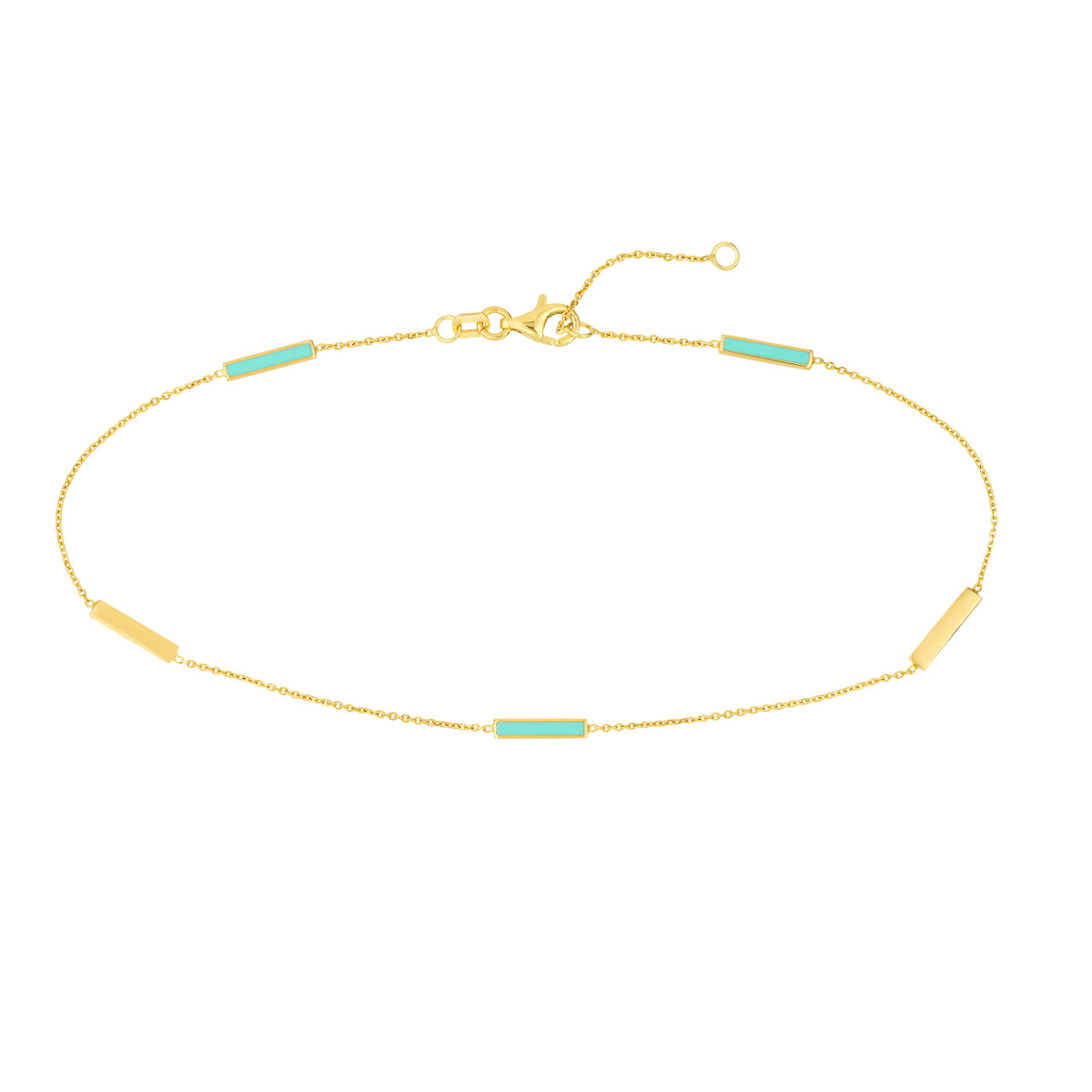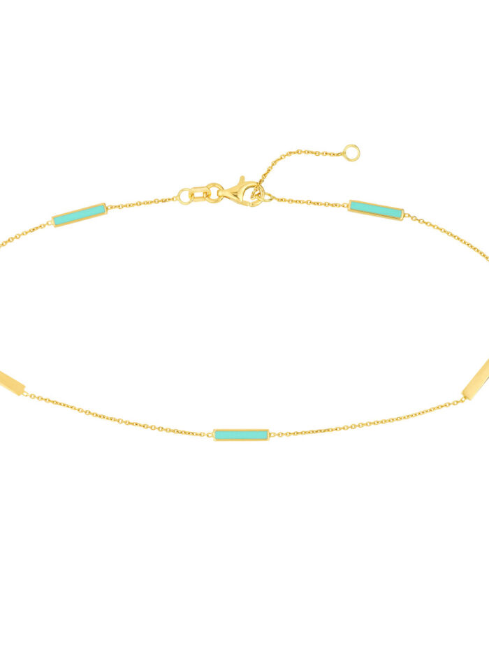 This chic Lt Turquoise Enamel Alternating Bar Anklet is a must-have for warmer weather. Crafted in 14K solid yellow gold, this anklet features alternating turquoise enamel bars and a delicate cable chain design. The 10-inch length ensures a comfortable and stylish fit.
