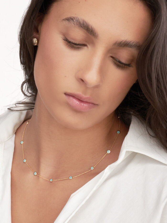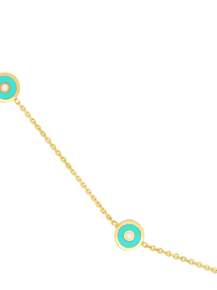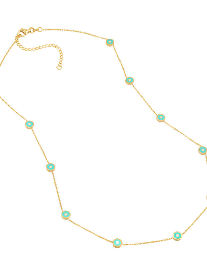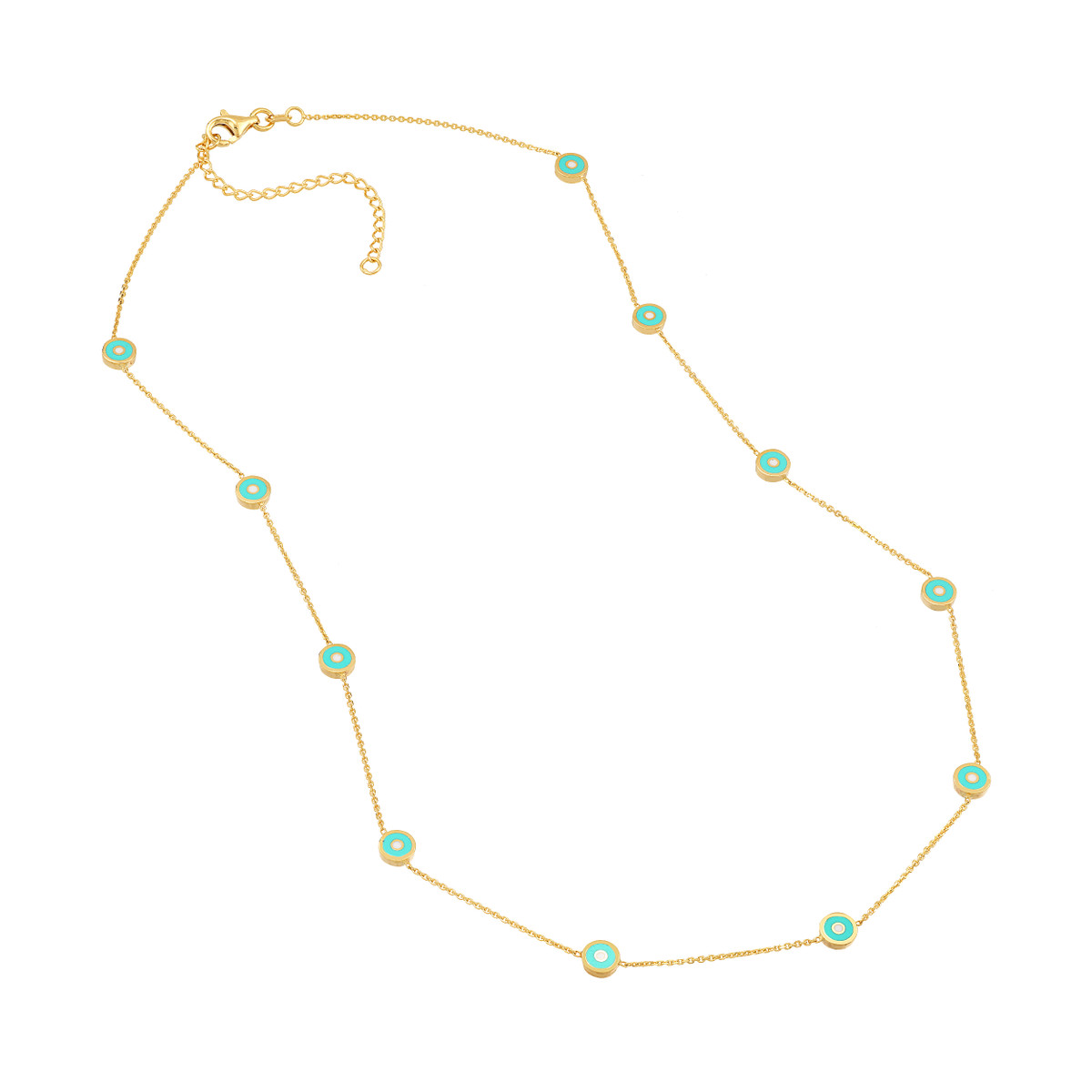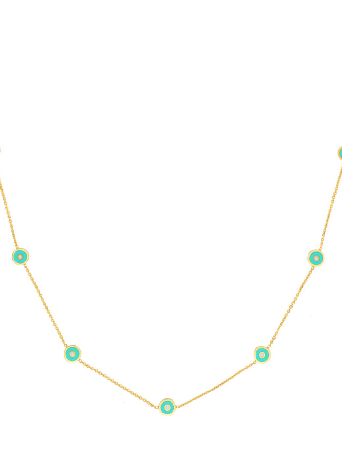 This 14K Yellow Gold Evil Eye Station Necklace is a beautiful piece for everyday wear. The light turquoise enamel adds a touch of elegance, while the evil eye charm offers protection against negativity. This necklace is adjustable from 16 inches to 18 inches, ensuring a perfect fit for any neckline.