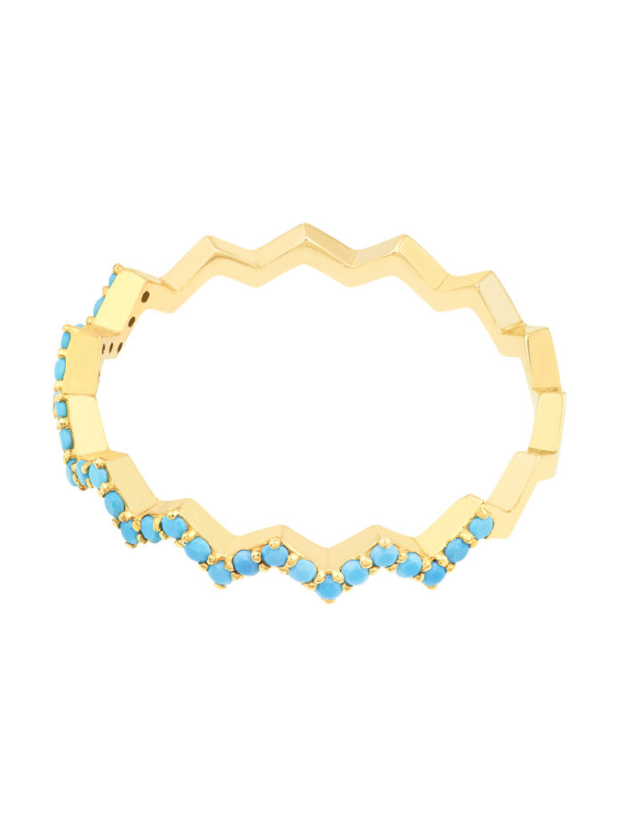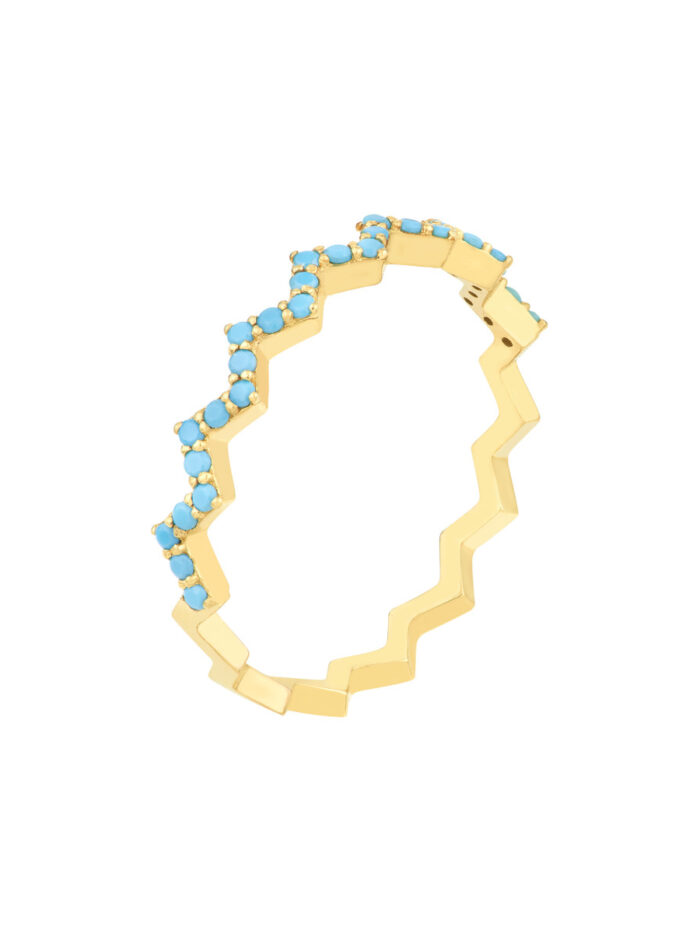 Give the gift of style and beauty with this stunning Lt. Turquoise Stone Zig Zag Ring. Crafted from 14K yellow gold, this ring features a beautiful, shimmering turquoise stone set in a unique zig zag design. Available in sizes 6, 7, or 8, it’s the perfect way to add a touch of elegance to any outfit.