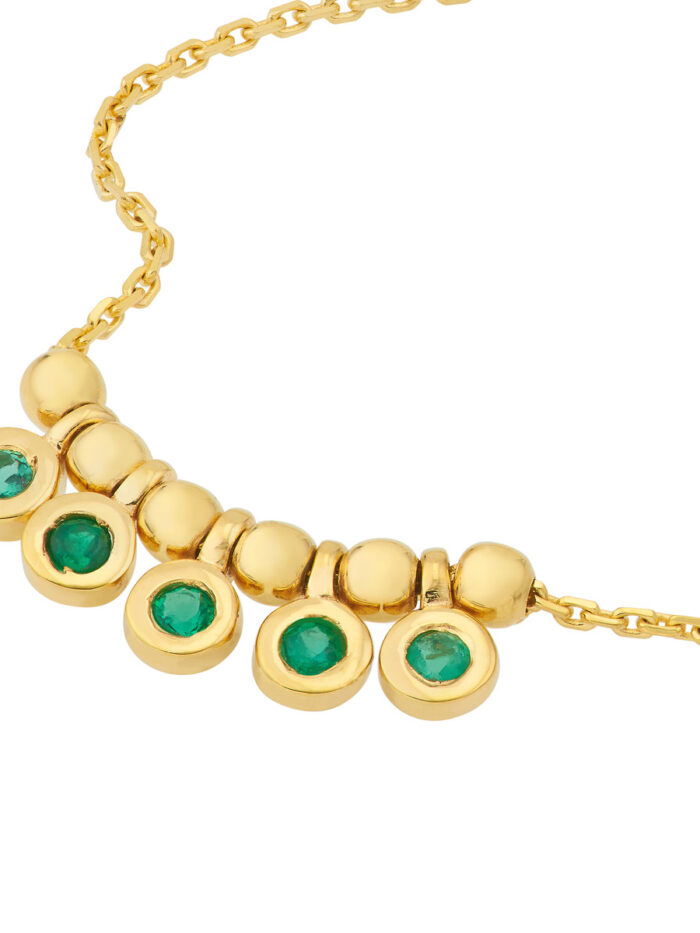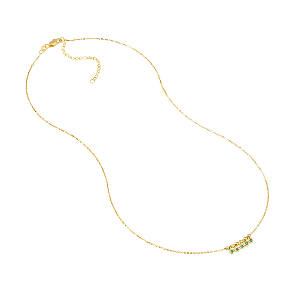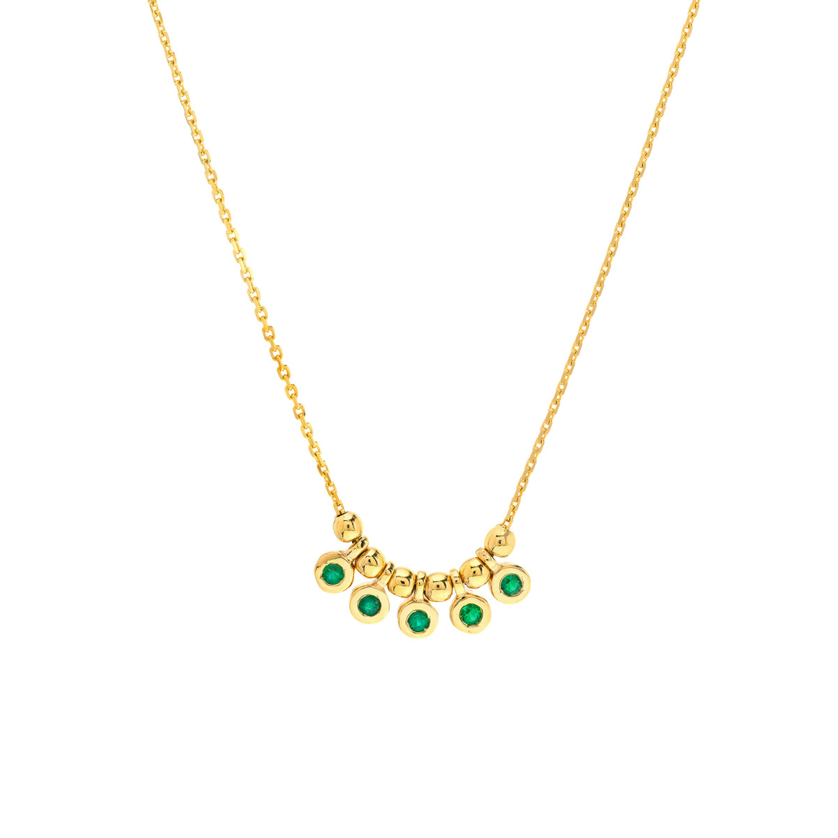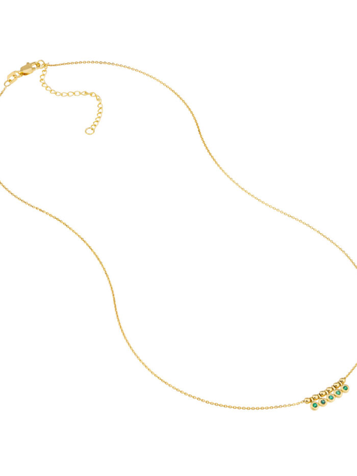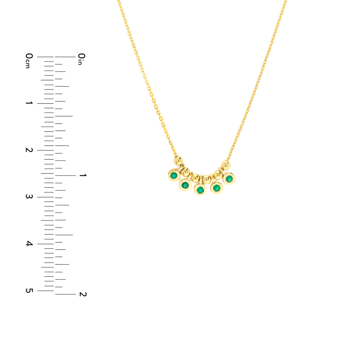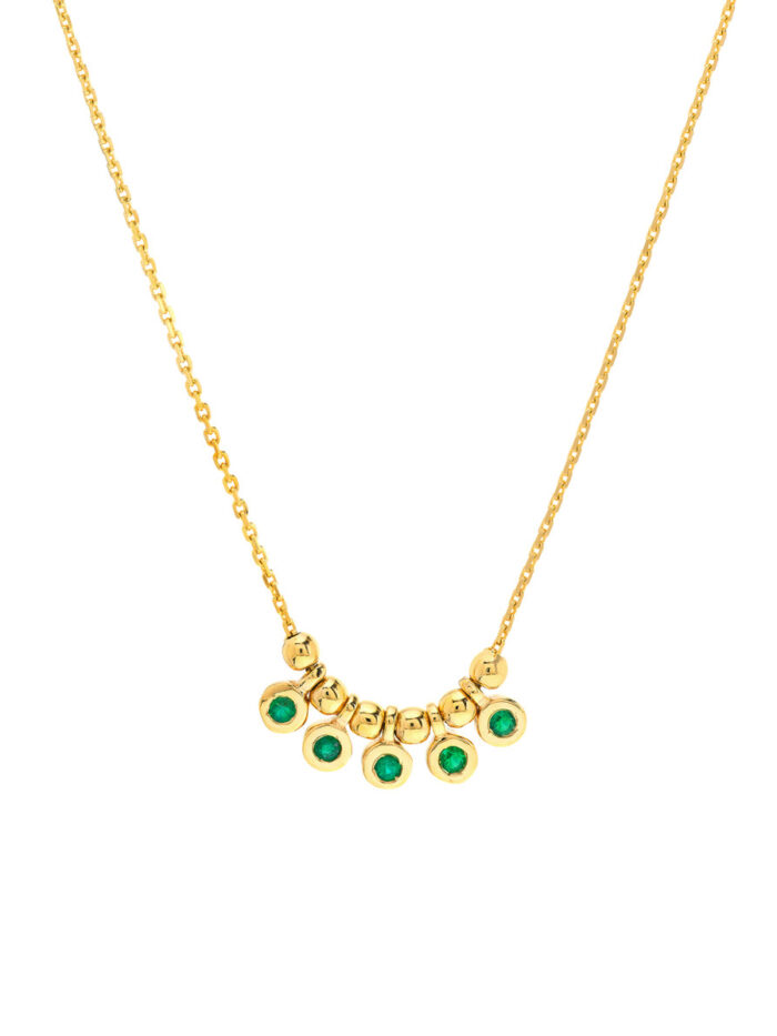 This delicate mini emerald bezel pendant necklace captures the essence of boho chic. Featuring five sparkling emeralds totaling 1/20tcw, this adjustable necklace adds a touch of effortless elegance to any outfit. Crafted in luxurious 14K yellow gold, it drapes beautifully with a 0.8-inch width. Customize the length to suit your style and make it your new go-to accessory.