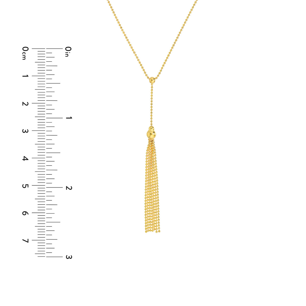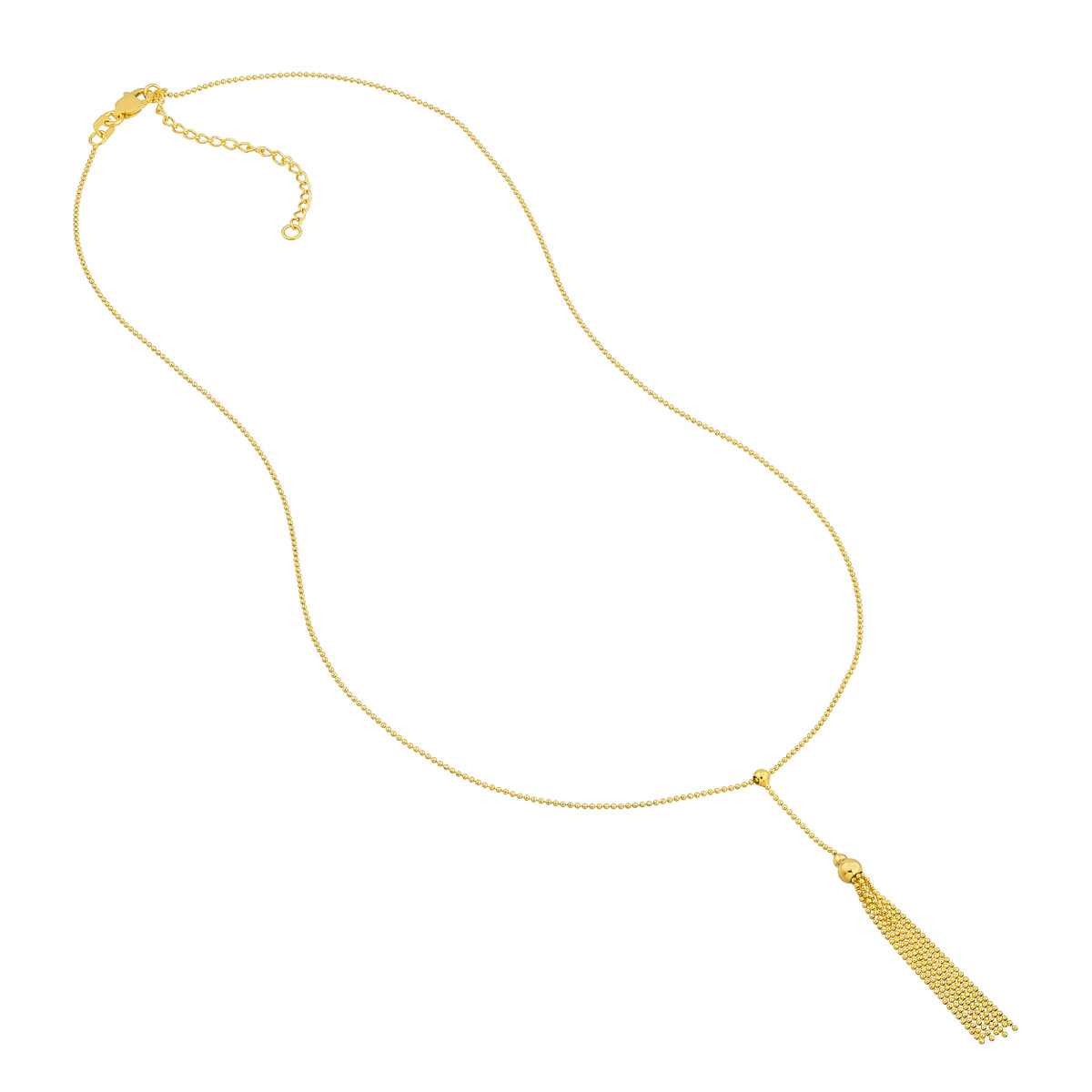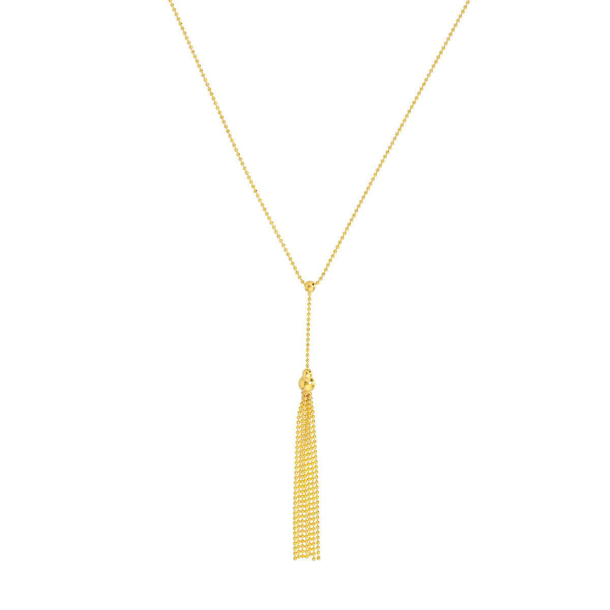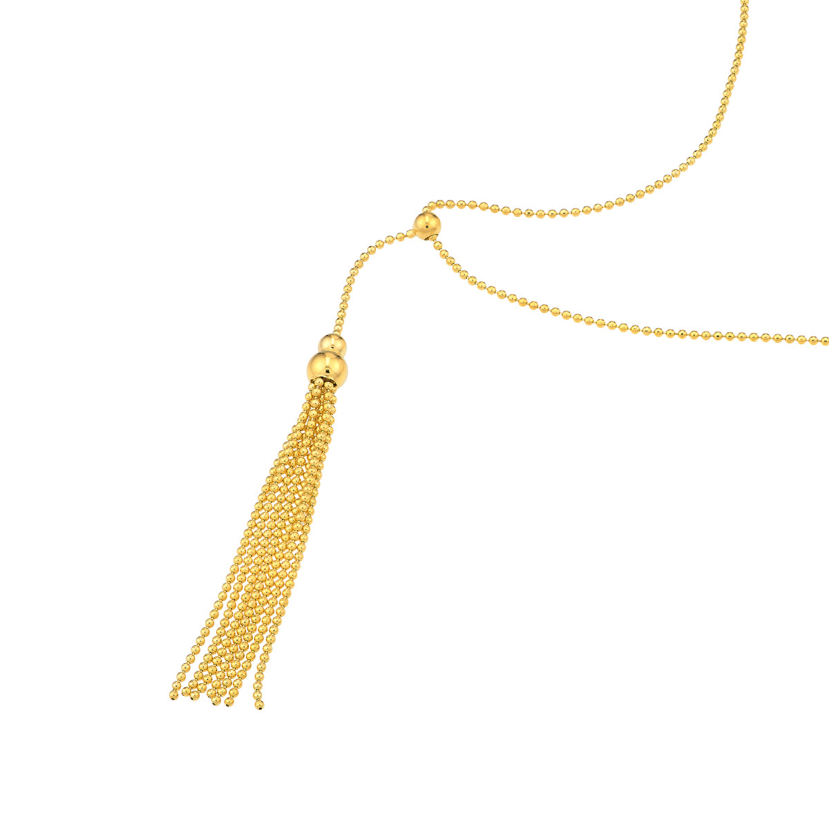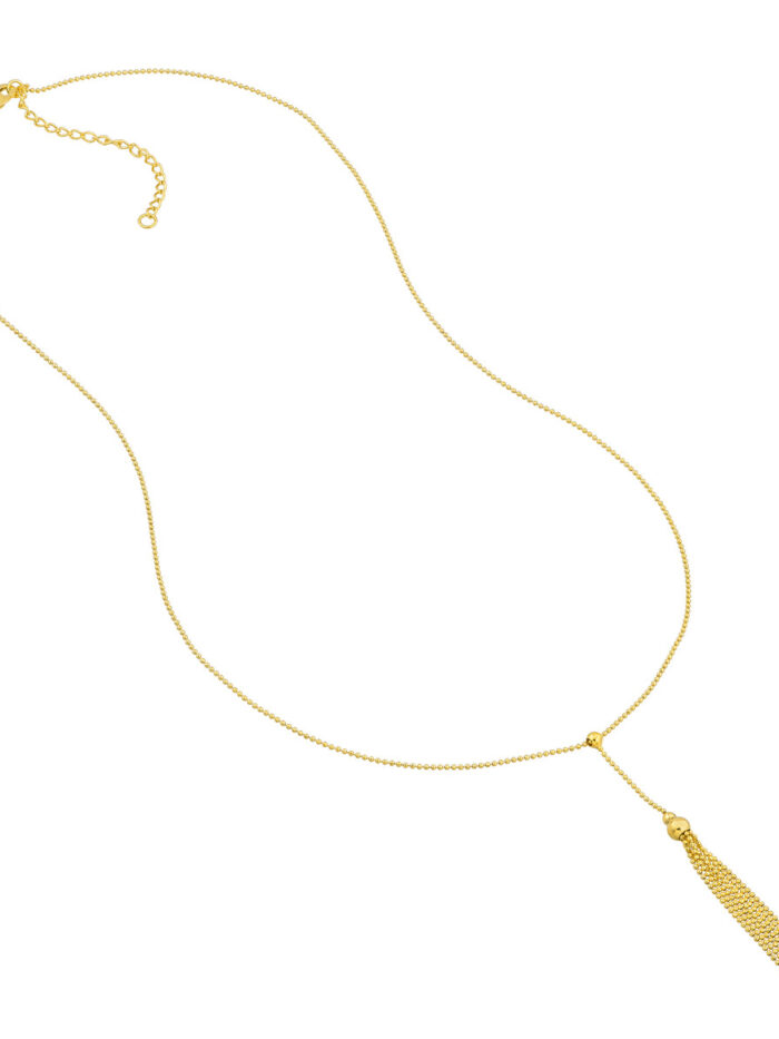 Add a touch of modern elegance to your jewelry collection with this striking lariat necklace. Crafted from lustrous 14K yellow gold, it features a captivating design with movable beads and a delicate tassel that dance gracefully with every movement. The cable chain adds a classic touch, while the lariat style offers versatile styling options.