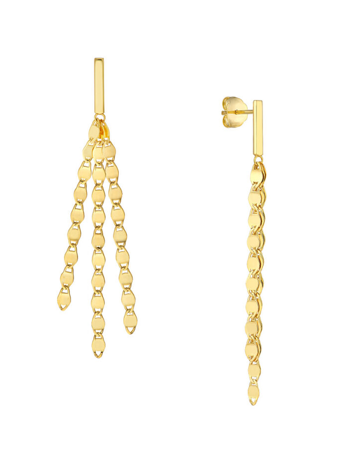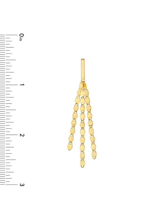 Shine bright with the Dazyle Multi-Strand Valentino Chain Dangle Earrings. These earrings feature a captivating multi-strand design crafted from lustrous 14K yellow gold, creating a beautiful cascade of shimmering chains. The intricate Valentino chain design adds a touch of sophistication and elegance. The secure post & nut closure ensures a comfortable and secure fit. These earrings are the perfect statement piece to elevate your style.
