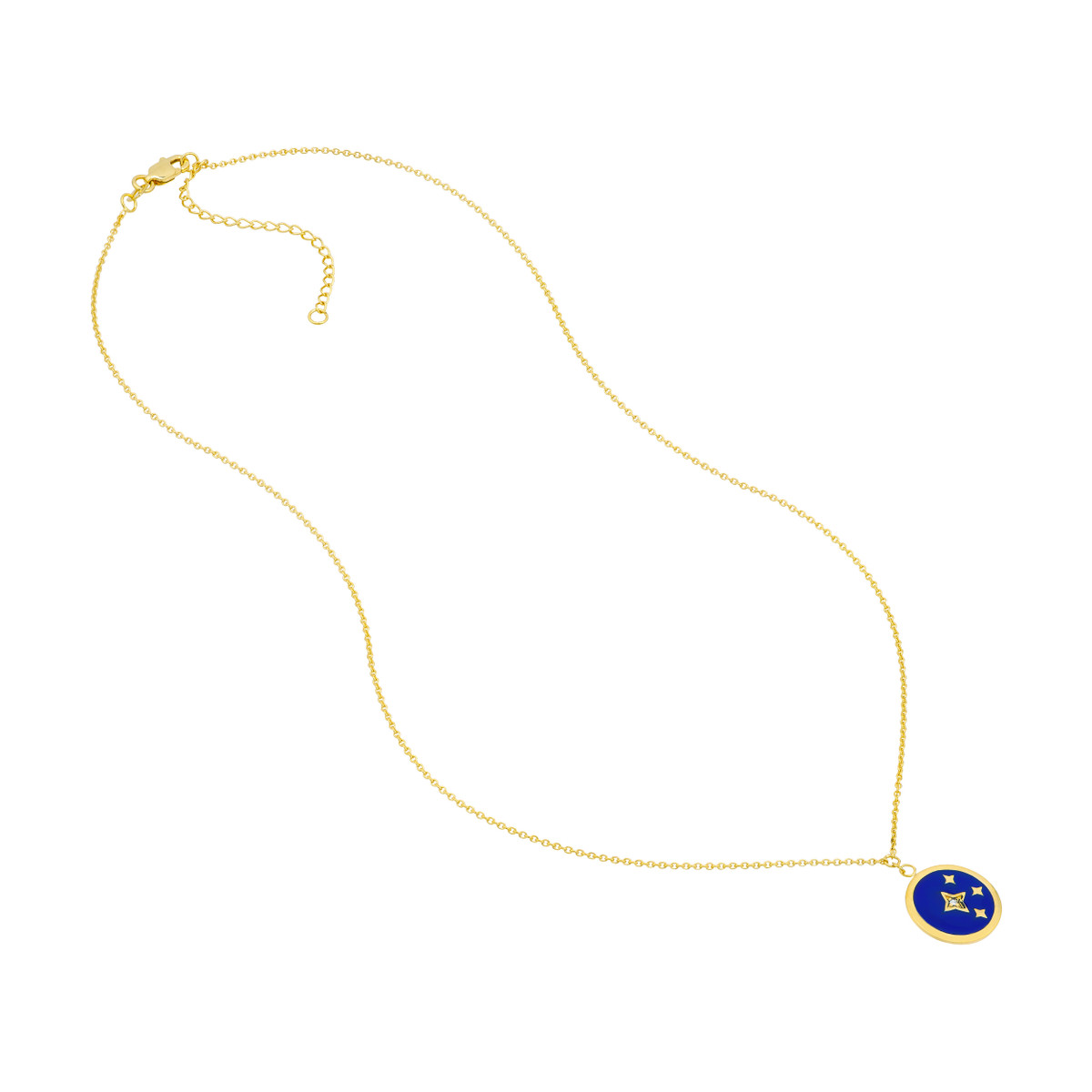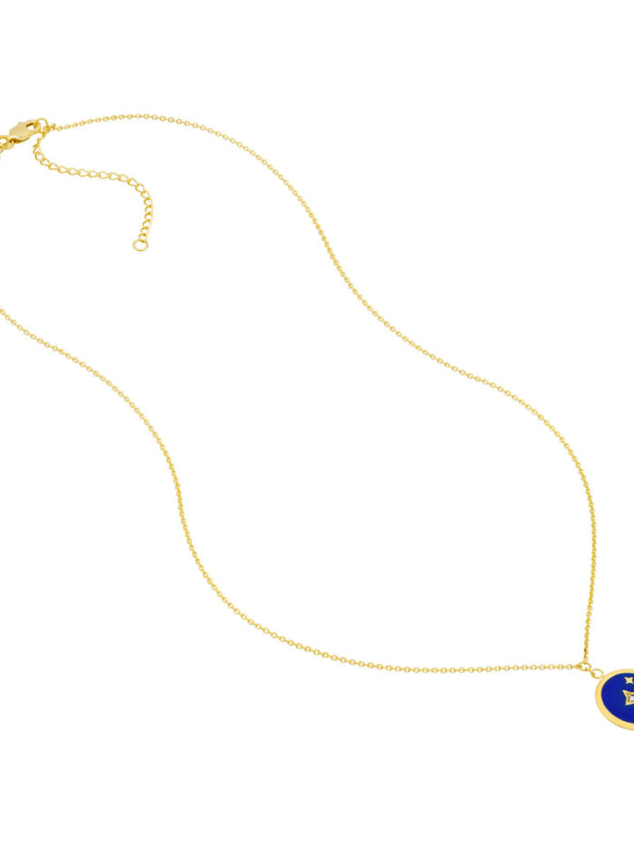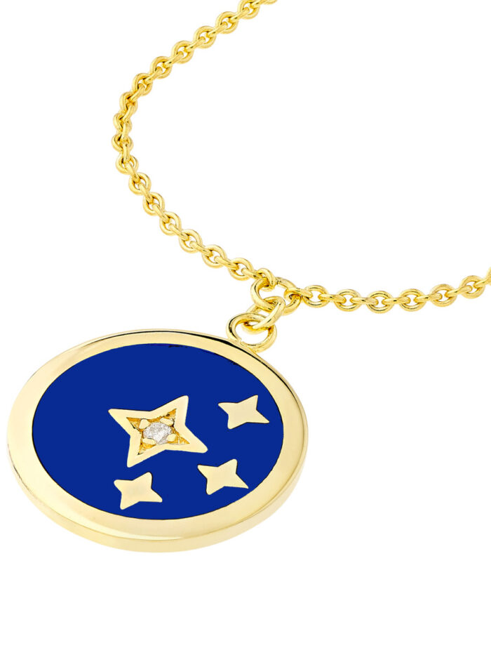 Embrace the magic of the night sky with our navy blue enamel stars medallion necklace. This stunning piece is crafted from lustrous 14K yellow gold and features a captivating design of stars adorned with a rich navy blue enamel. The necklace is elevated by a sparkling 1.3pt diamond, adding a touch of celestial brilliance. The cable chain adds a classic touch to this elegant piece.