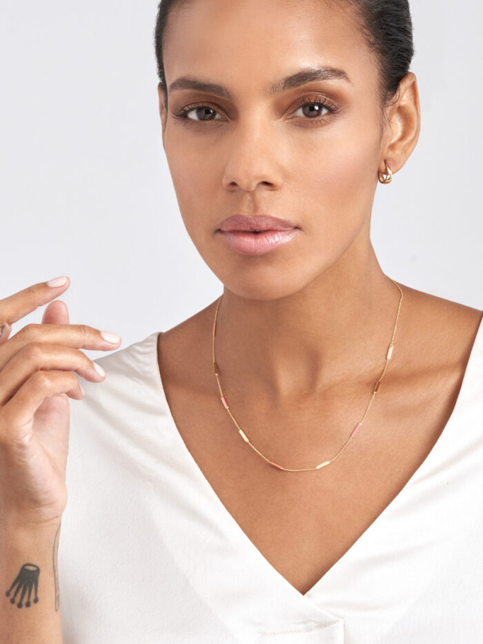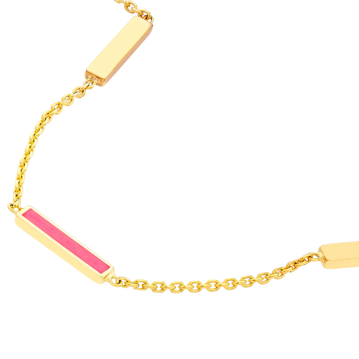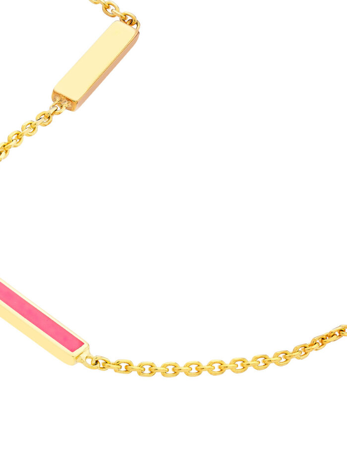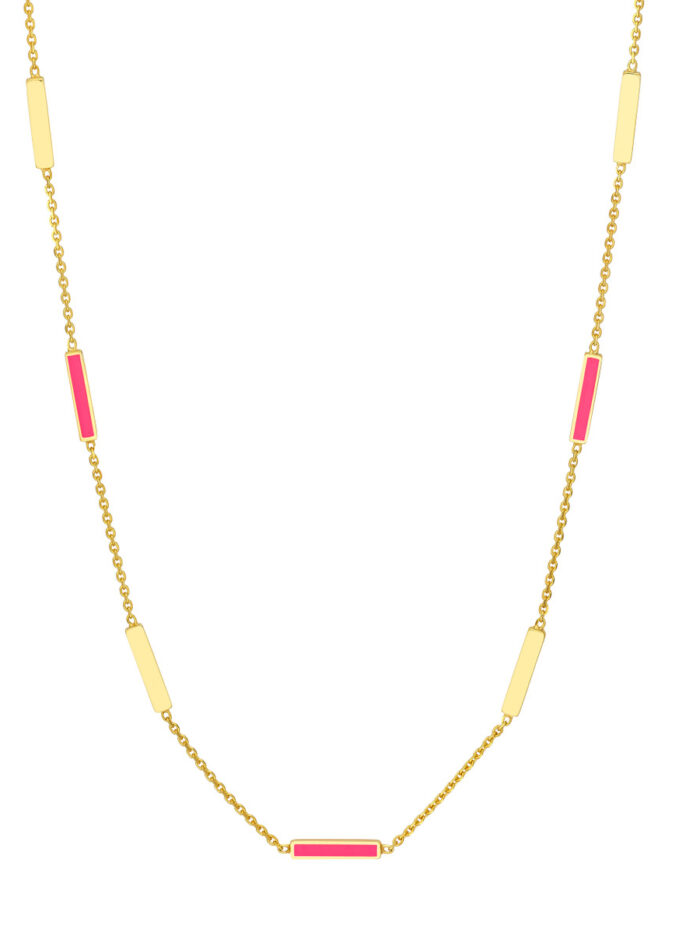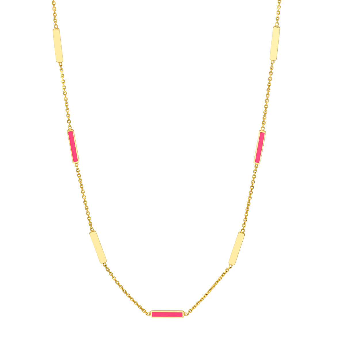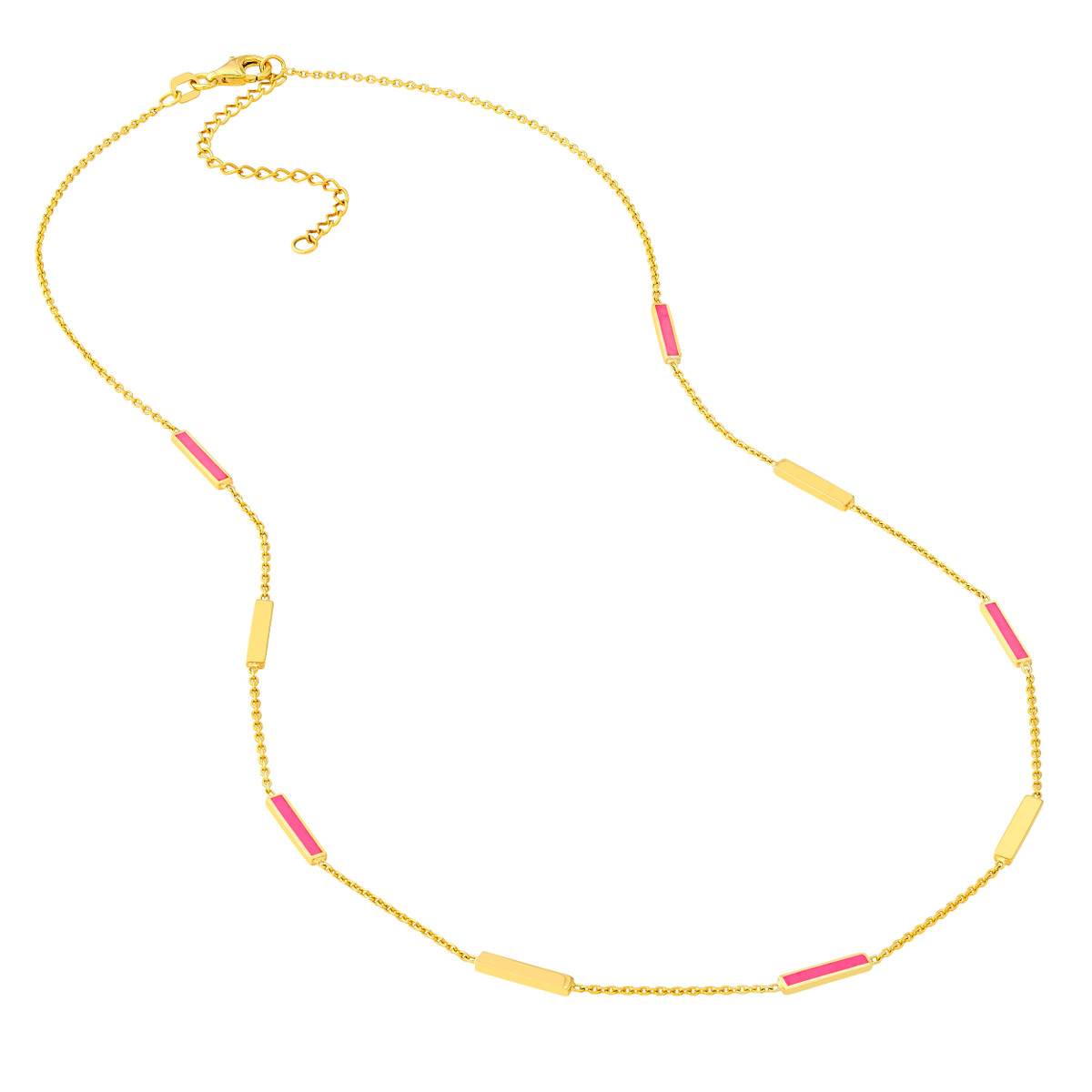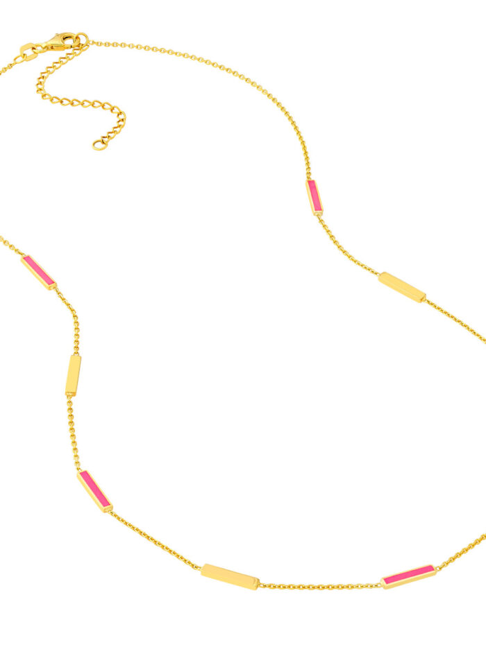Shine bright with this eye-catching neon pink enamel bar necklace. Crafted from gleaming 14K yellow gold, this adjustable necklace features a classic cable chain that gracefully drapes. The 2-inch adjustable length allows you to personalize the fit and style.