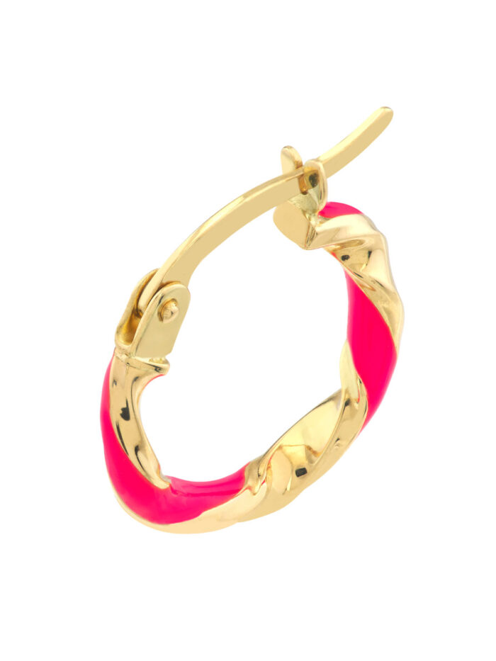 Make a bold statement with these vibrant neon pink enamel twist hoops. Made from 14K yellow gold, these medium-sized hoops radiate energy and style. The unique twist design adds a playful touch, making them perfect for adding a pop of personality to any outfit.