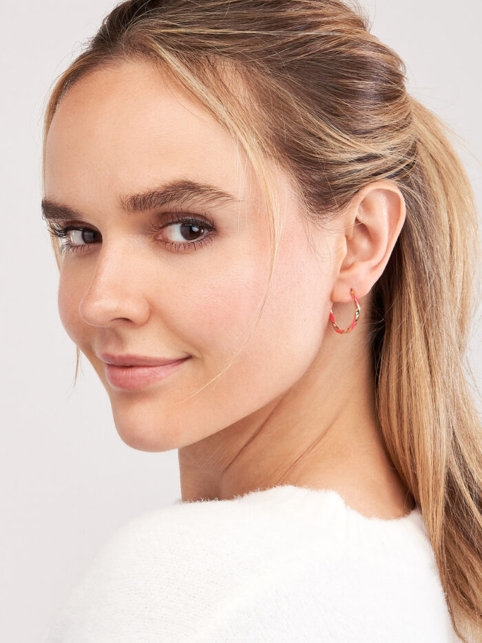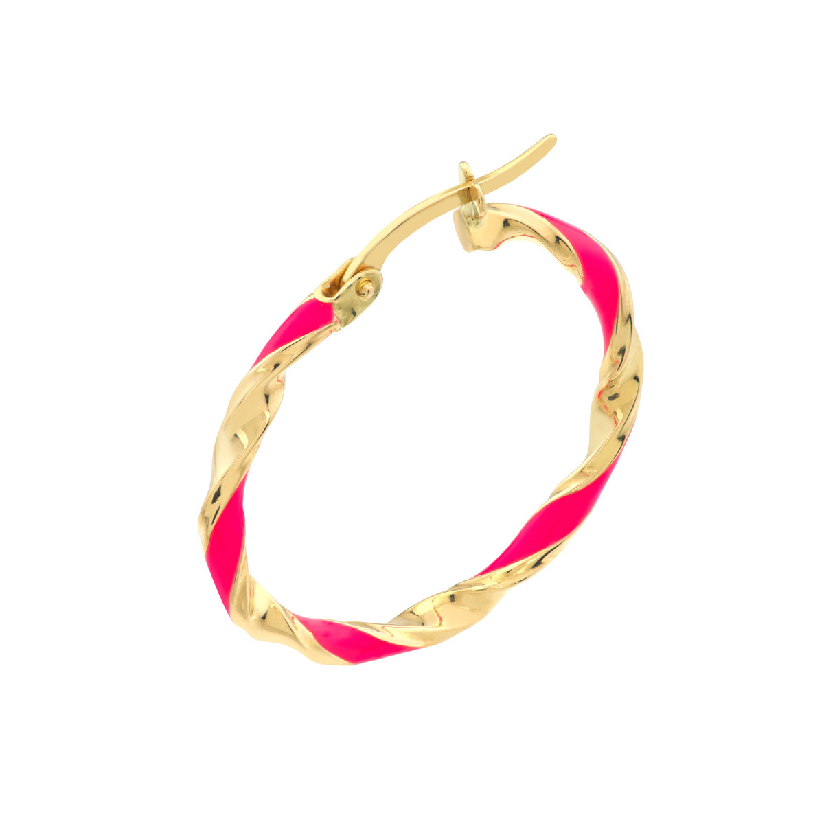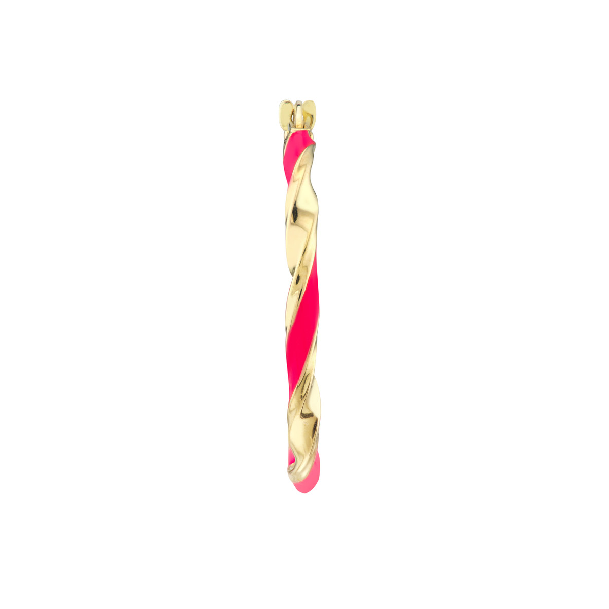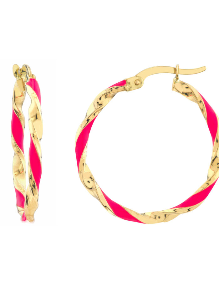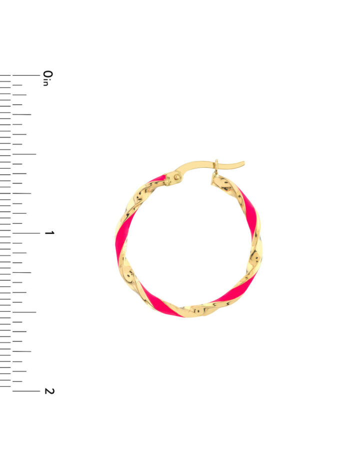 Make a bold statement with these dazzling Neon Pink Enamel Round Twist Hoops. Crafted from gleaming 14K yellow gold, these 20x2mm hoops boast a vibrant neon pink enamel that’s sure to turn heads. The round twist design adds a touch of playful sophistication, making these hoops a fun and eye-catching accessory for any occasion.