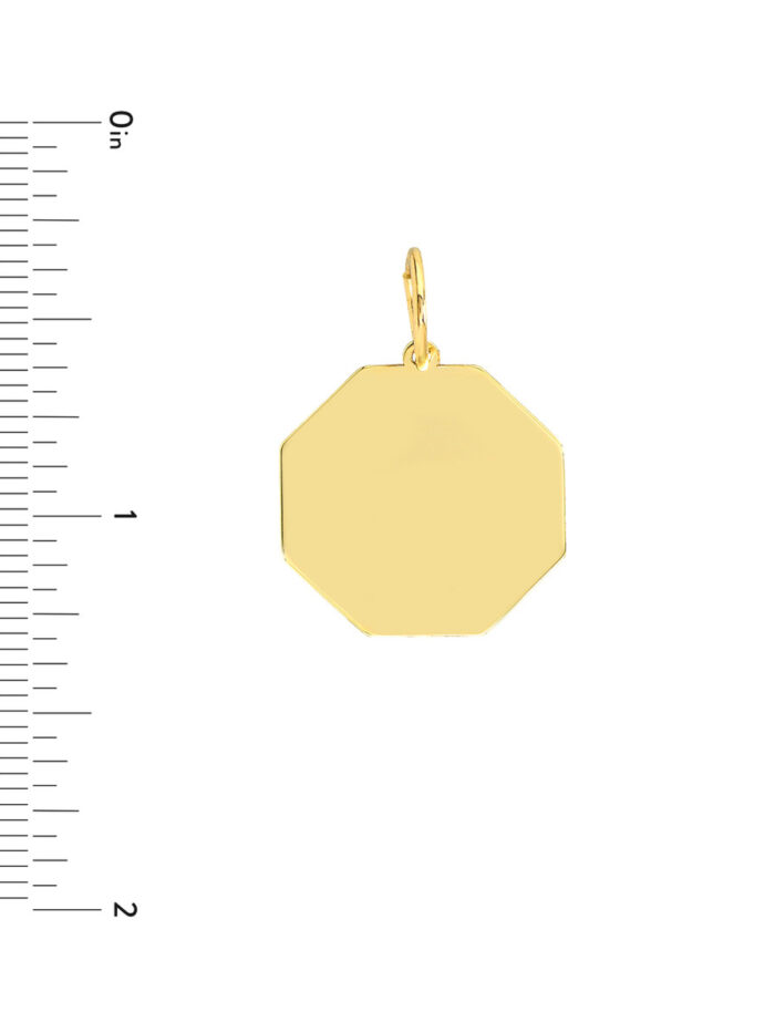 Make a bold statement with this chic 14K Yellow Gold Octagon Engravable Charm. Measuring 17x17mm, its geometric shape adds a touch of modern sophistication. Engrave it with a special date, a significant symbol, or a meaningful message to create a piece that is truly personal. The jump ring closure allows for easy attachment to a chain, completing a stylish and eye-catching accessory.