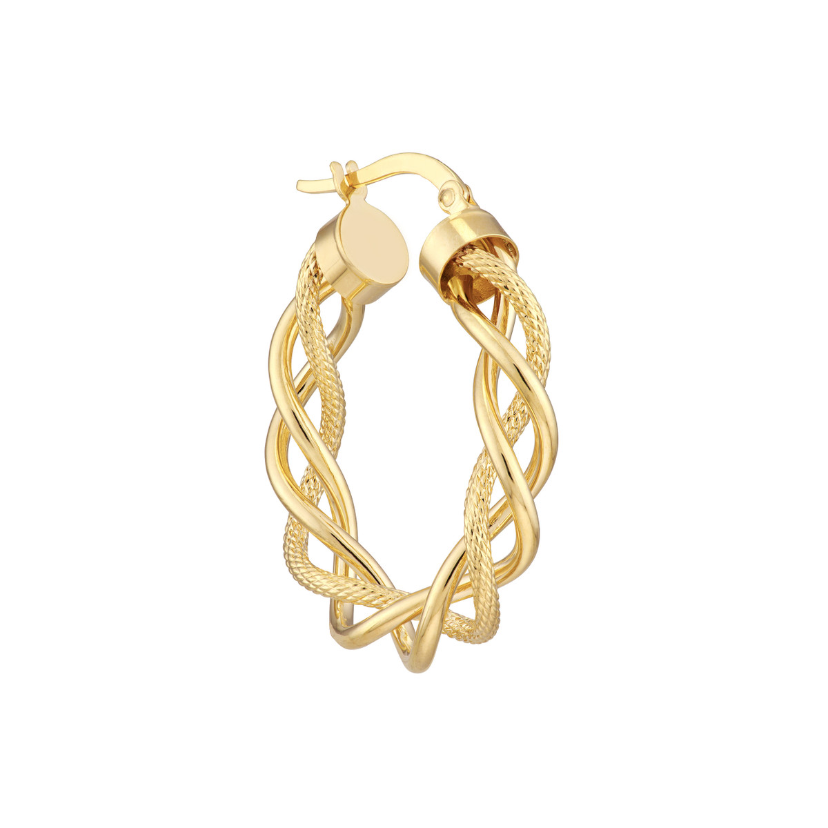 Elevate your style with these stunning open braided hoop earrings. Crafted in luxurious 14K yellow gold, the interwoven polished and diamond-cut strands create a delicate and eye-catching design. The hinged closure ensures a secure and comfortable fit. These earrings are the perfect way to add a touch of feminine romance to any outfit.