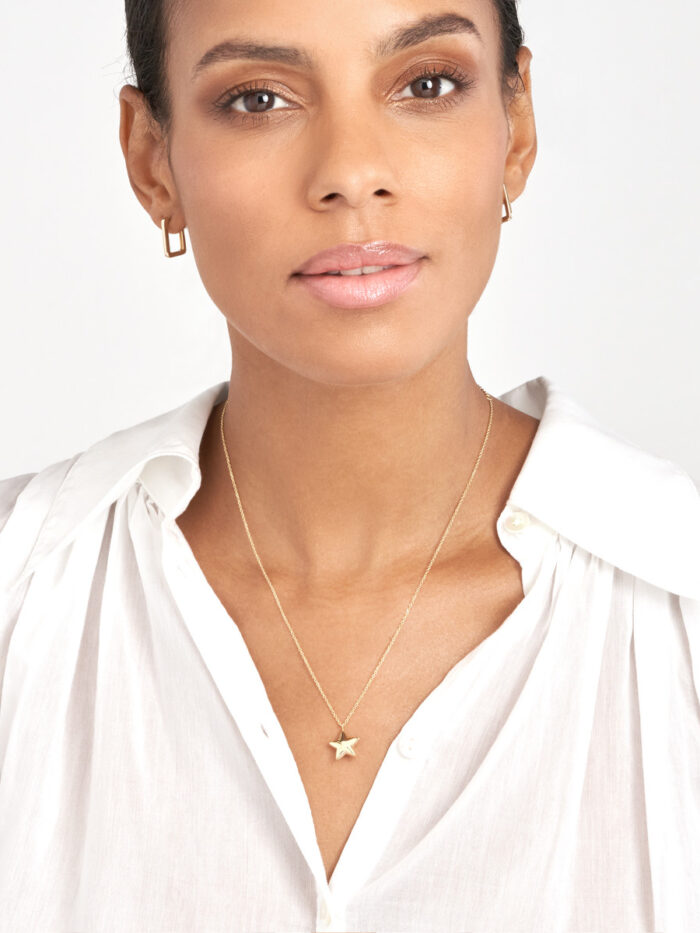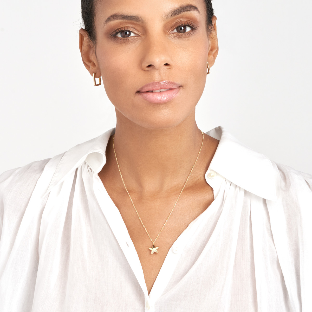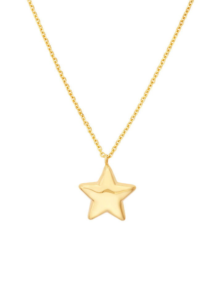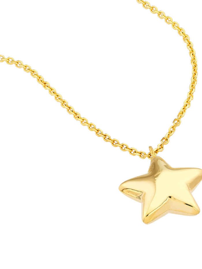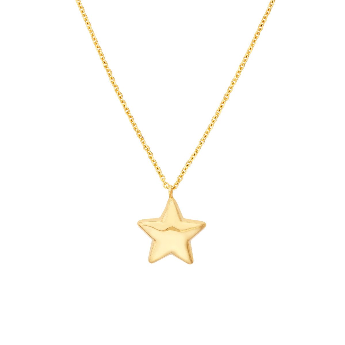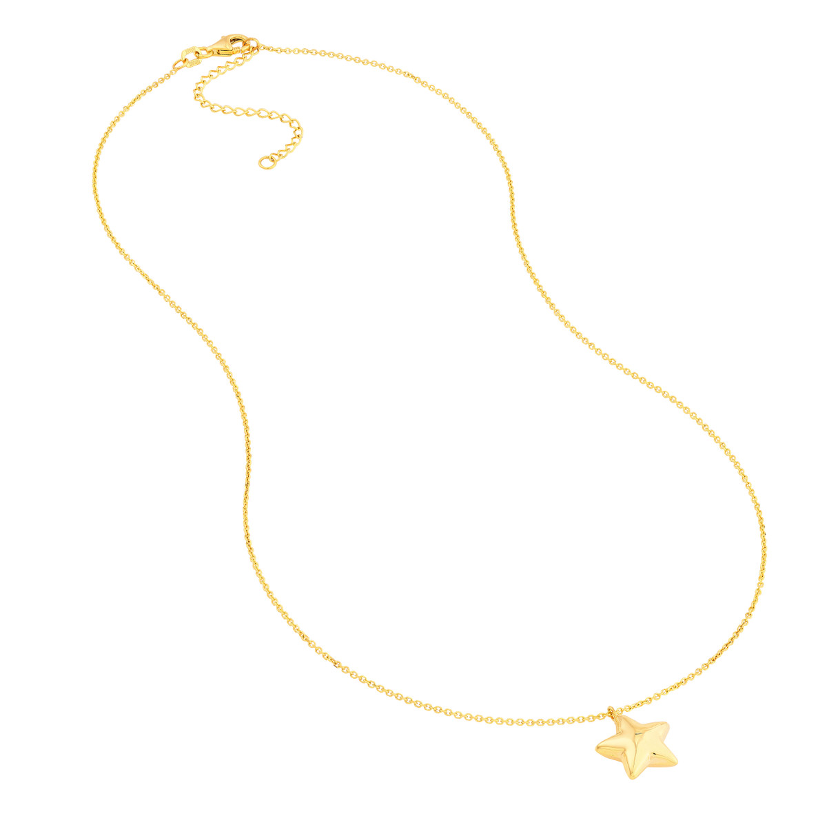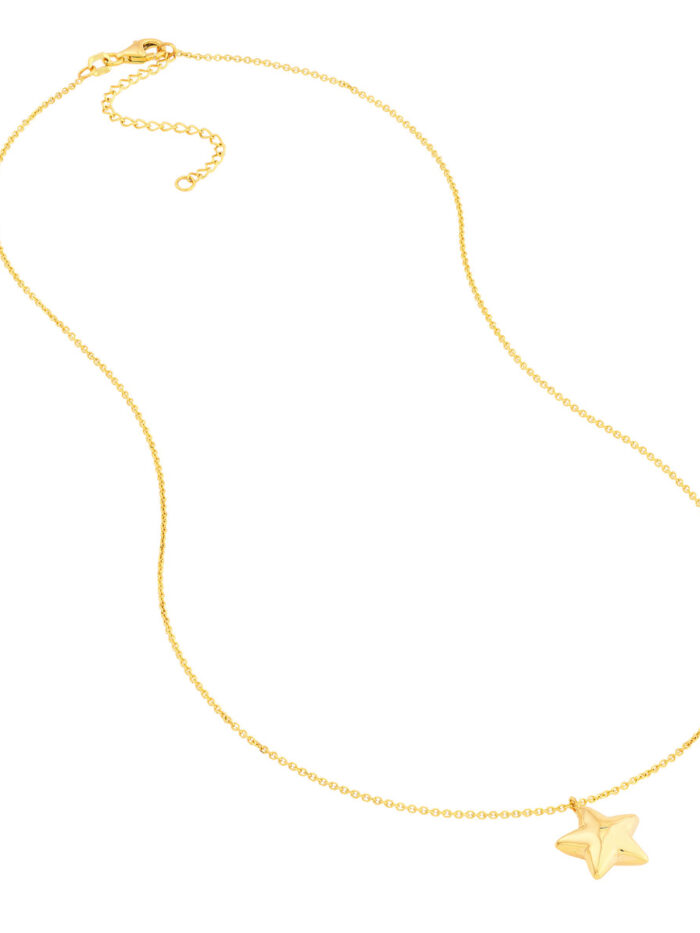 Shine bright with this captivating puff star necklace. The 12 x 4.75mm star pendant adds a touch of celestial charm, while the 14K yellow gold construction ensures lasting quality. The 2-inch adjustable diamond cut baby curb chain allows for a perfect fit, making this necklace a versatile and stylish addition to your jewelry collection.