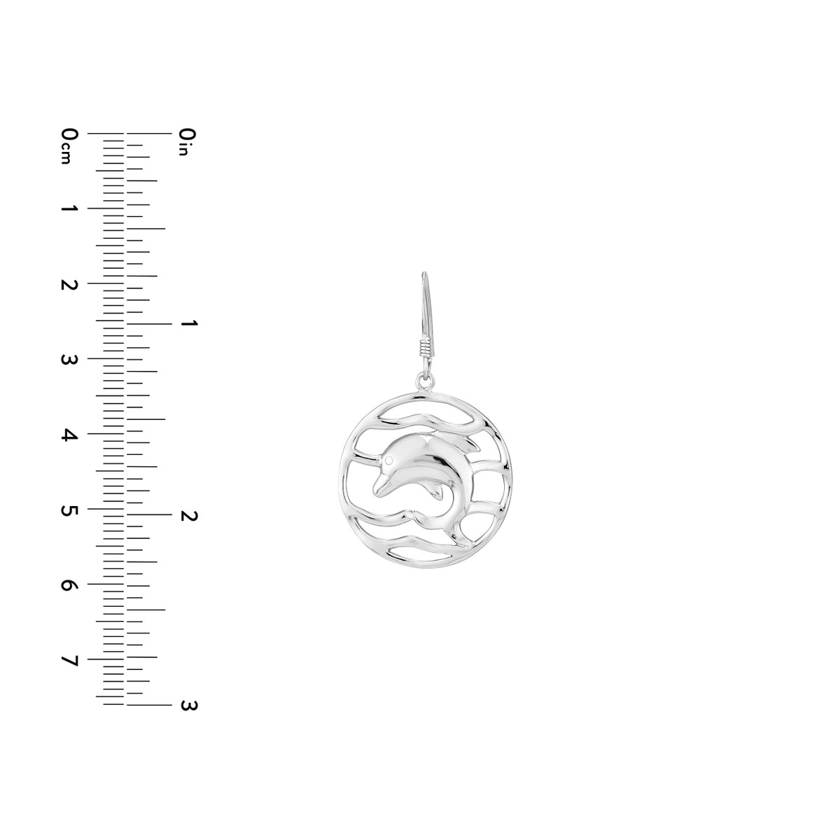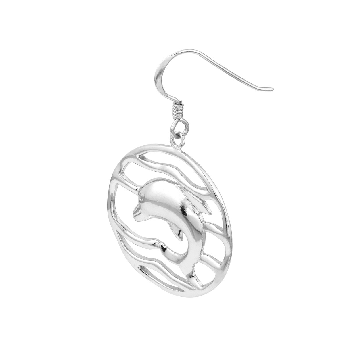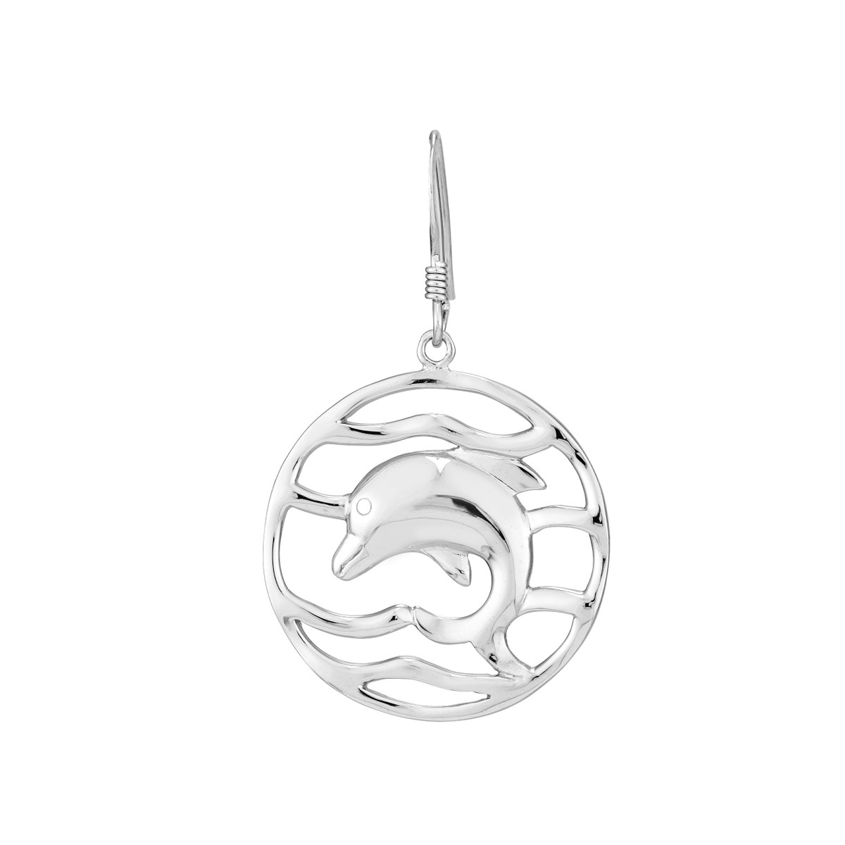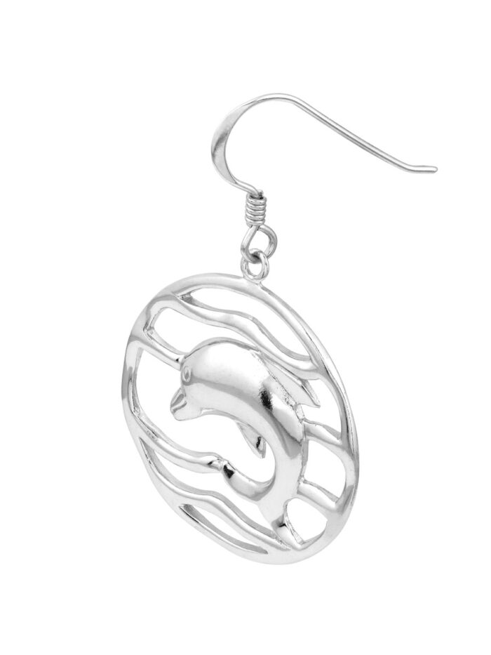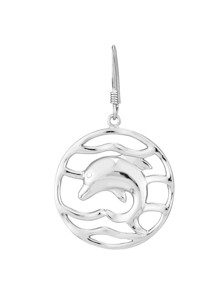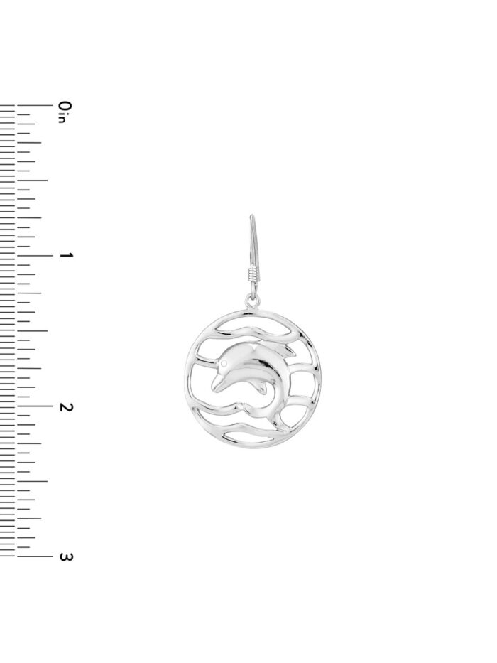 Make a statement with these elegant rhodium-plated sterling silver dolphin drop earrings. The rippled circle design adds a touch of sophistication, while the durable fish hook closure ensures a secure and comfortable fit. Crafted from high-quality sterling silver, these earrings are a timeless and versatile accessory that will elevate any outfit.