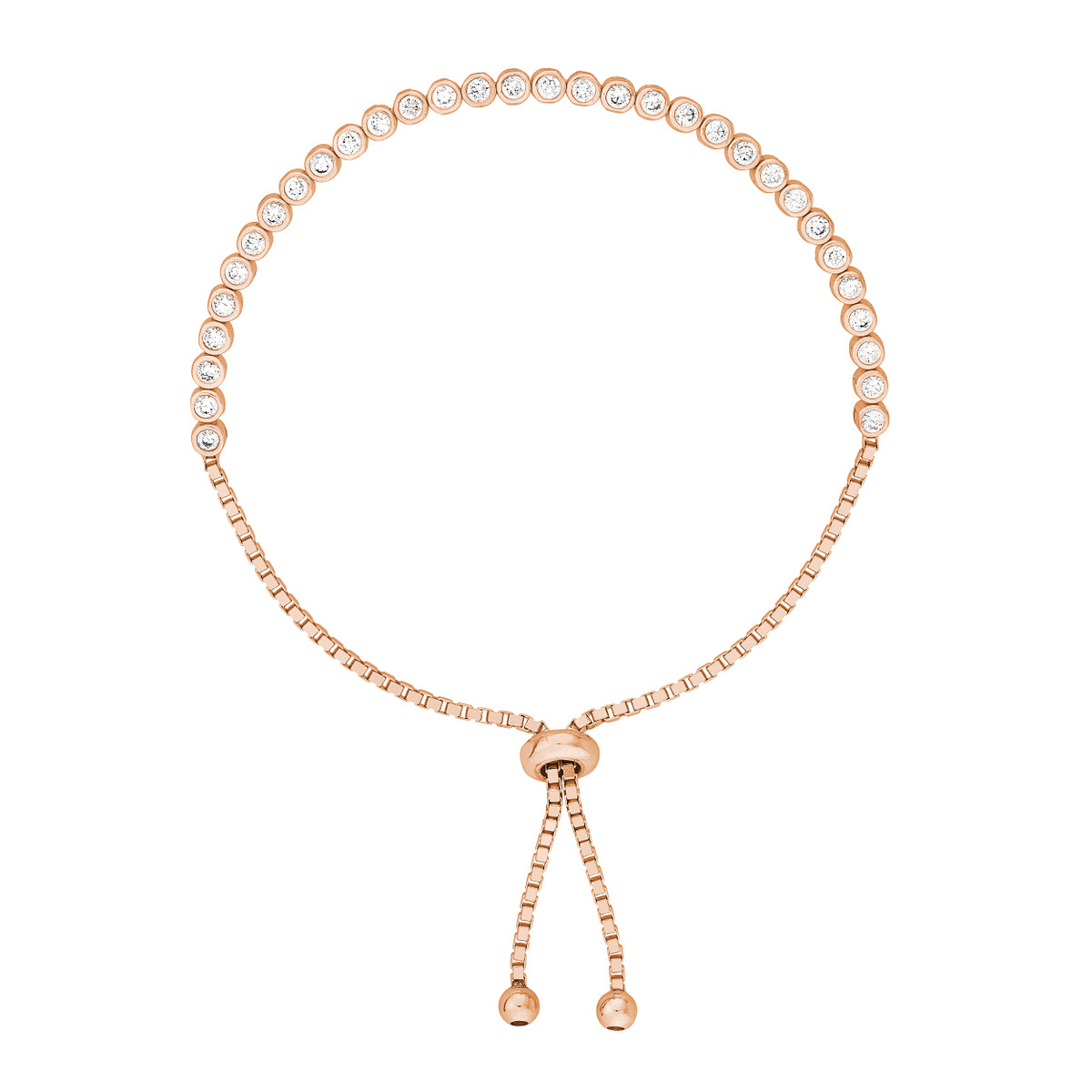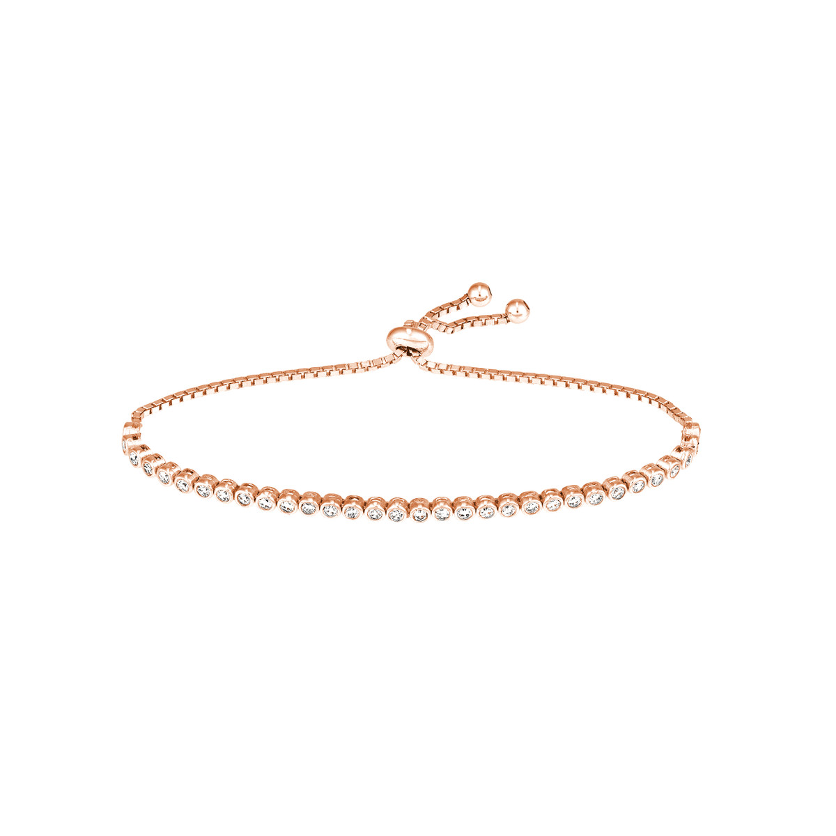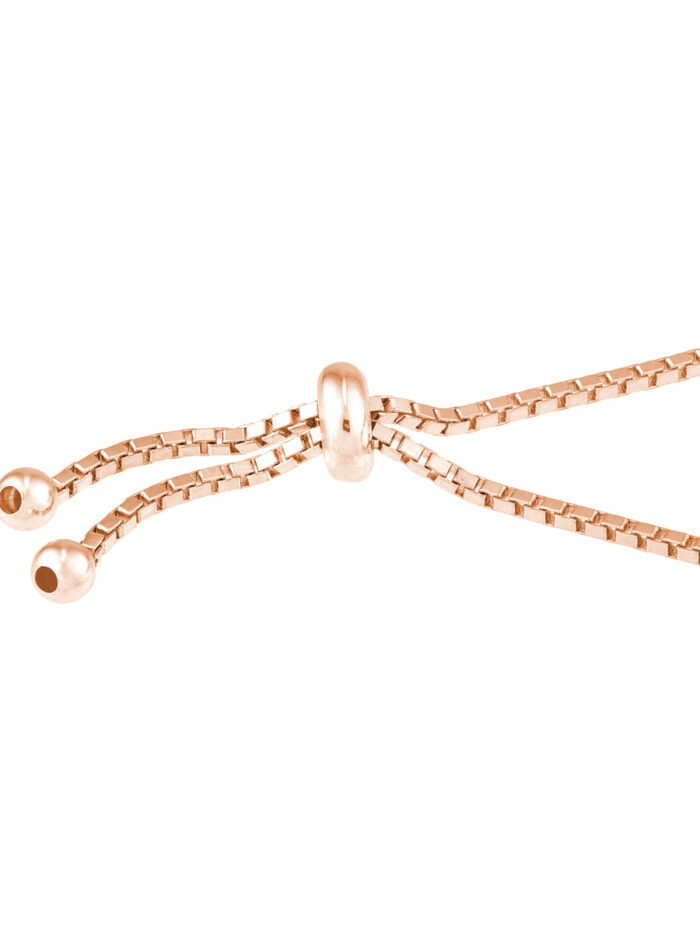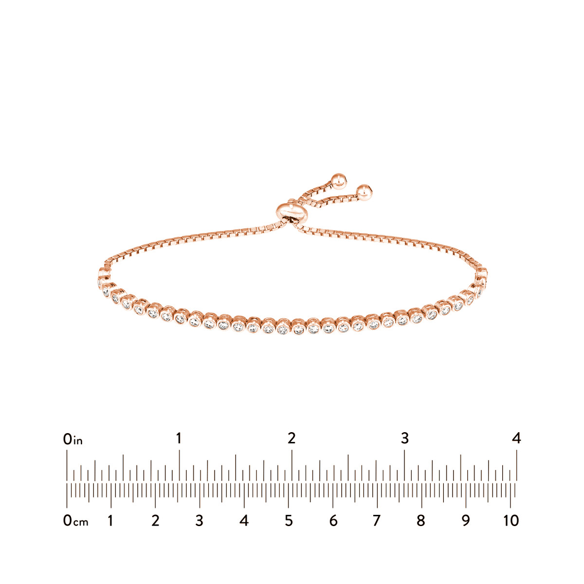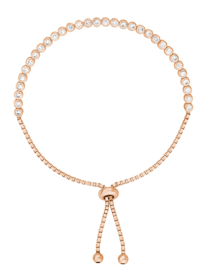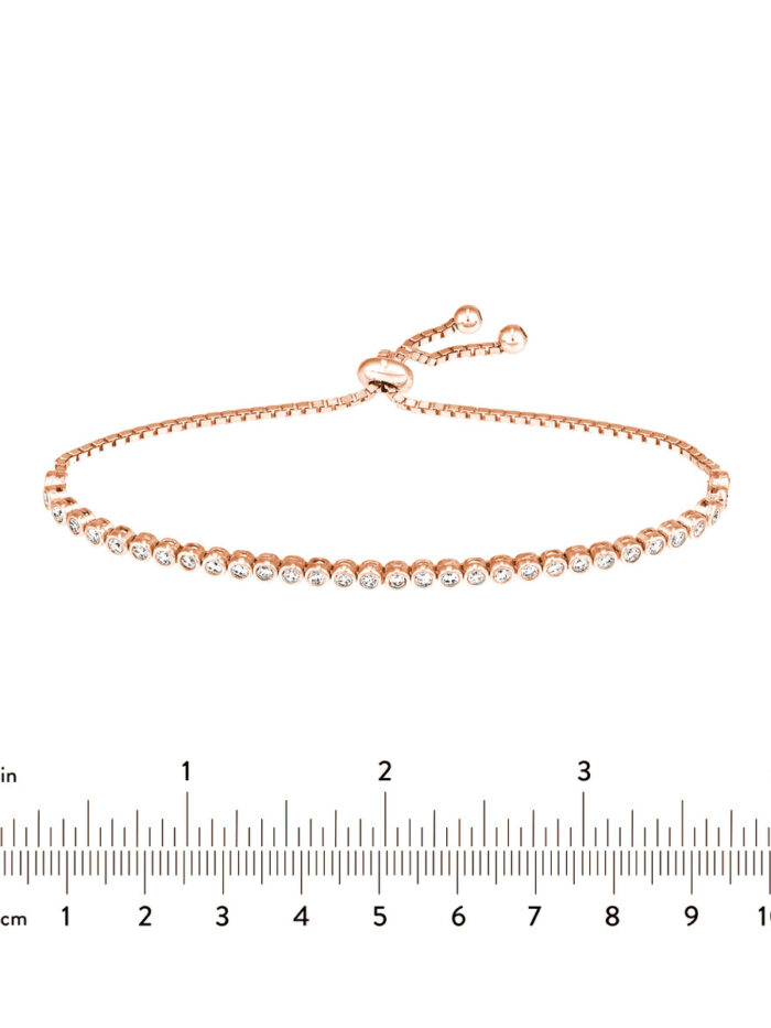 Shine bright with this elegant Rose Gold Plated Sterling Silver tennis bracelet. Featuring dazzling CZ accents, this bracelet is adorned with a timeless tennis bracelet design. The adjustable silicon bead closure ensures a comfortable and secure fit.