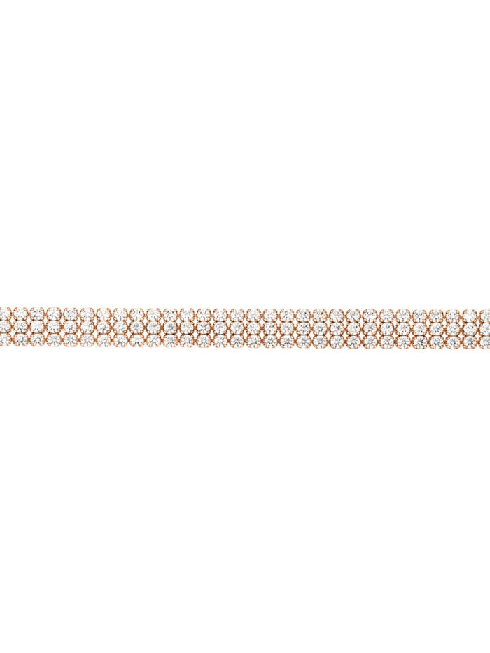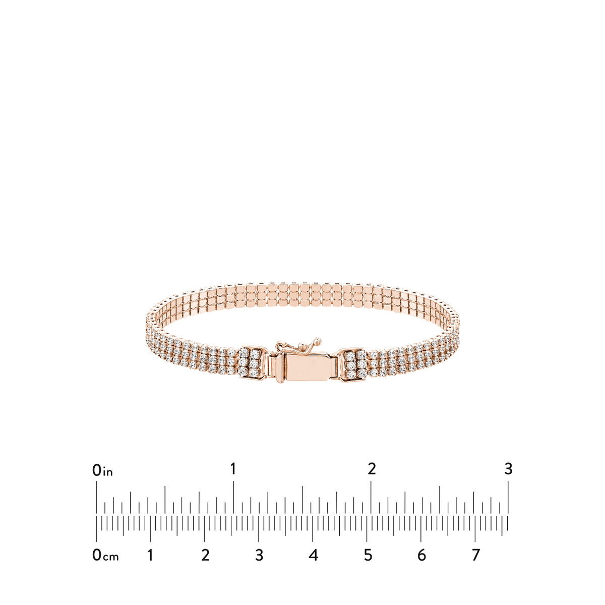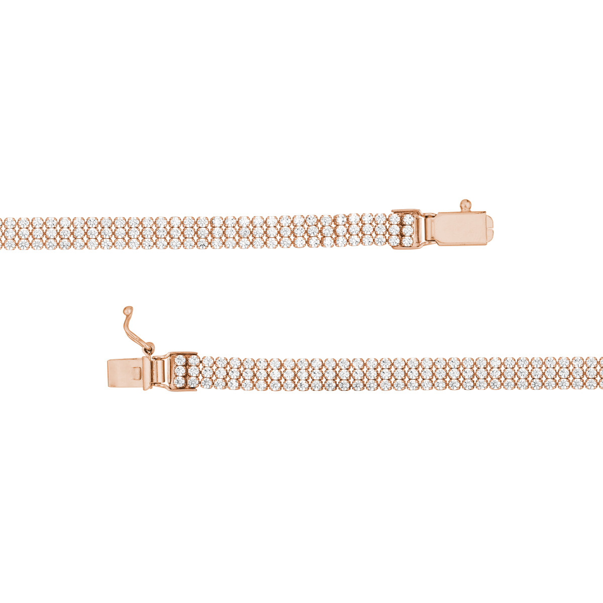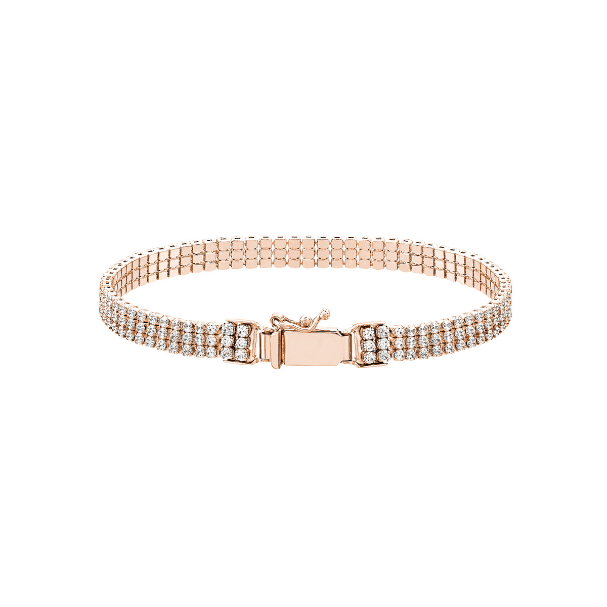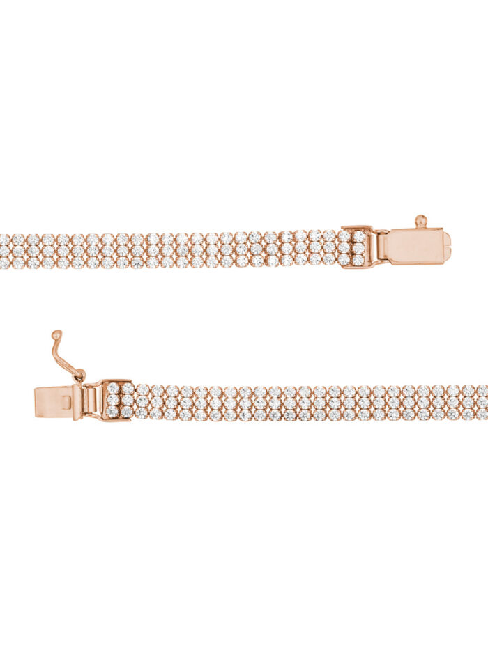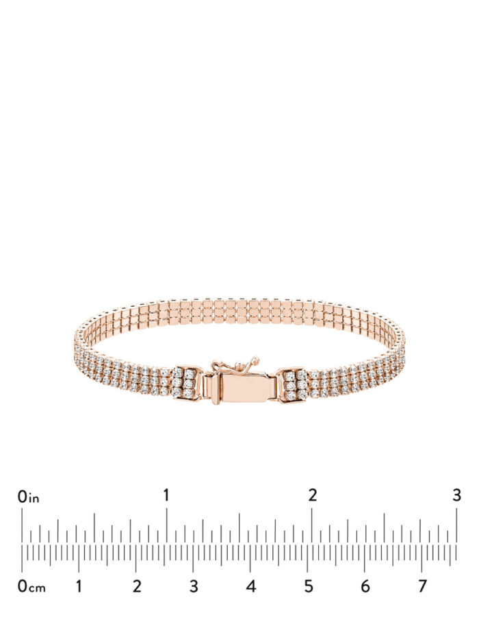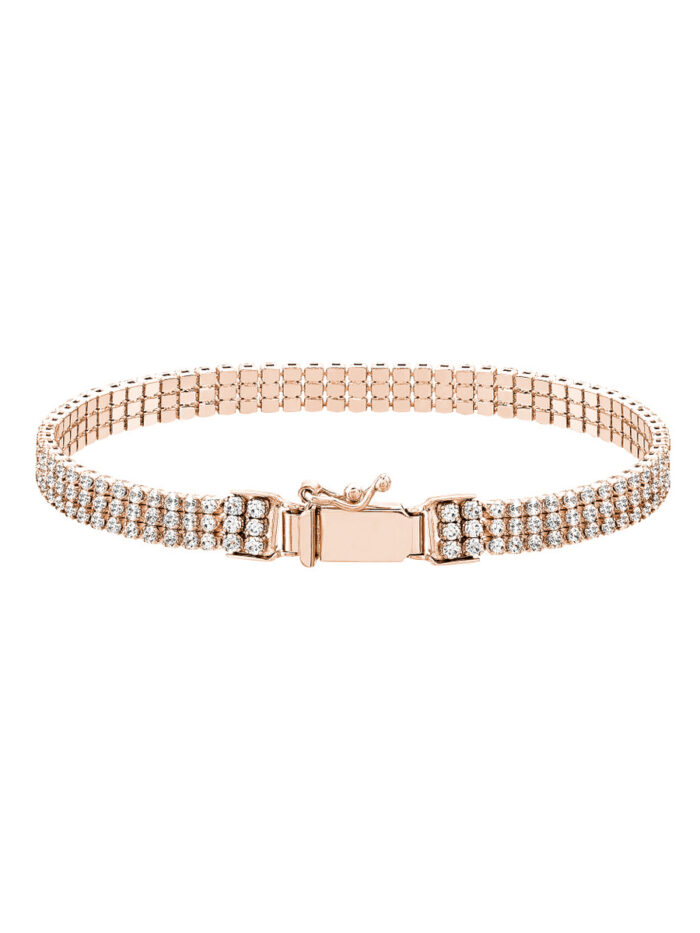Sparkle and shine with this unique rose gold plated sterling silver bracelet. Featuring three dazzling rows of cubic zirconia stones, this bracelet is sure to make a statement. The secure box lock closure ensures a comfortable and safe fit. At 7.25 inches in length, this bracelet is perfect for adding a touch of elegance to any outfit.