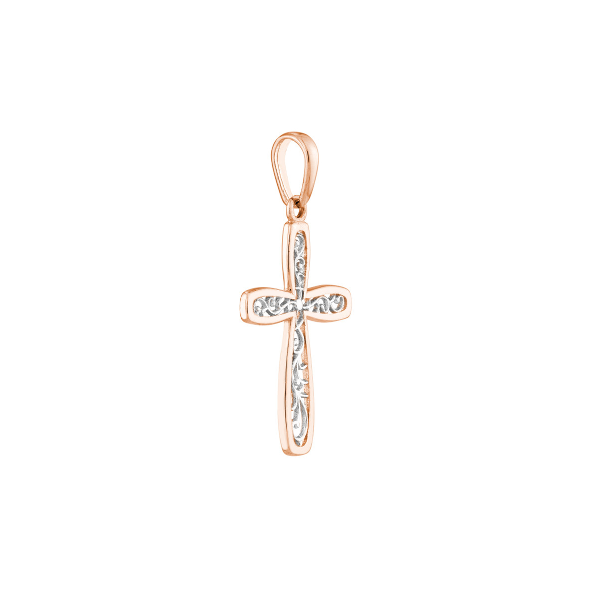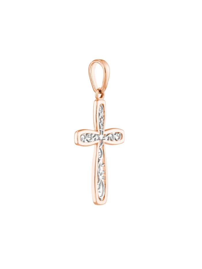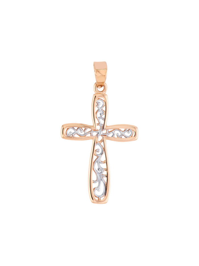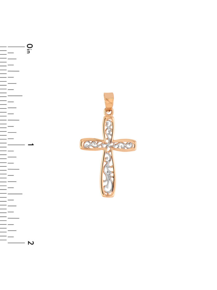 This delicate vine cross pendant is a stunning example of craftsmanship. Crafted from 14K rose and white gold, it features a dainty framed design that captures both elegance and grace. It makes a thoughtful and meaningful gift for any occasion, especially religious holidays and celebrations.