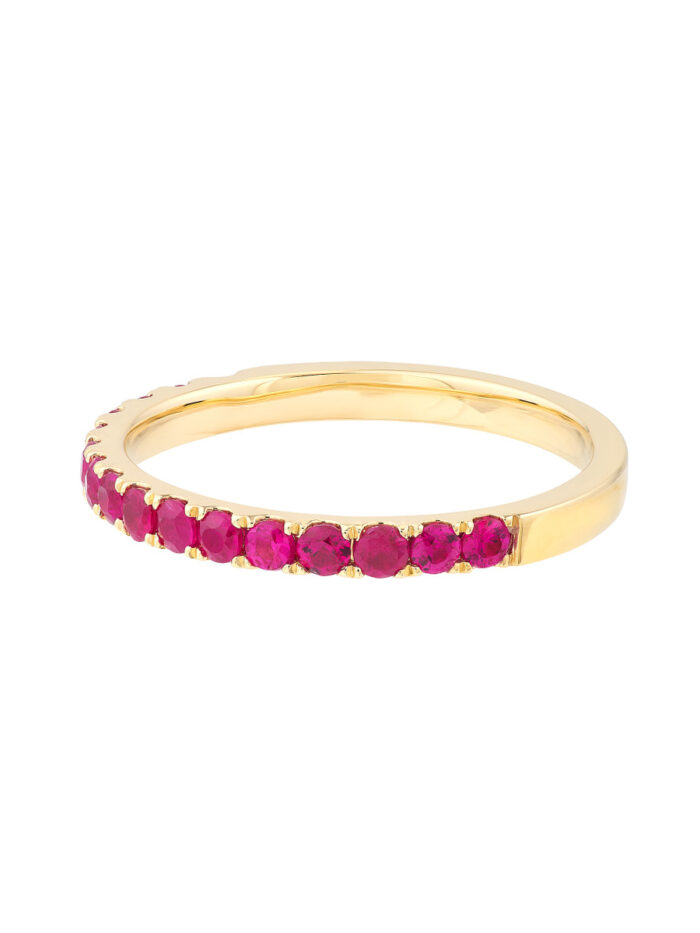 Add a touch of vibrant color to your stack with the Ruby Gemstone Stackable Band. This beautiful 2mm wide band features sparkling ruby gemstones strategically placed along half the band, creating a dazzling and eye-catching design. Crafted from 14K yellow gold, this stackable ring is a timeless piece that will complement any style. The perfect way to add a personal touch to your jewelry collection.