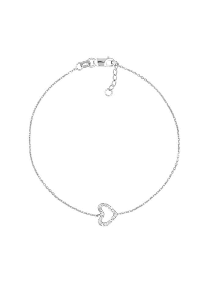 Adorn your wrist with the subtle charm of this sideways mini CZ heart bracelet. Crafted from Sterling Silver and featuring a delicate open heart design accented with sparkling CZ stones, this bracelet is a timeless reminder of love and affection. The adjustable cable chain ensures a comfortable and personalized fit.