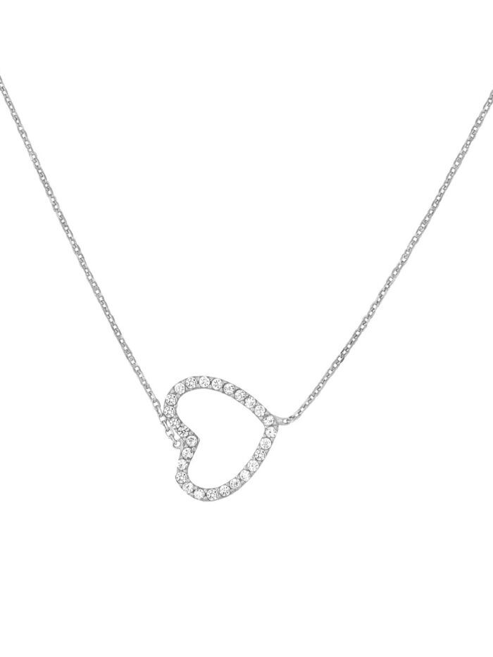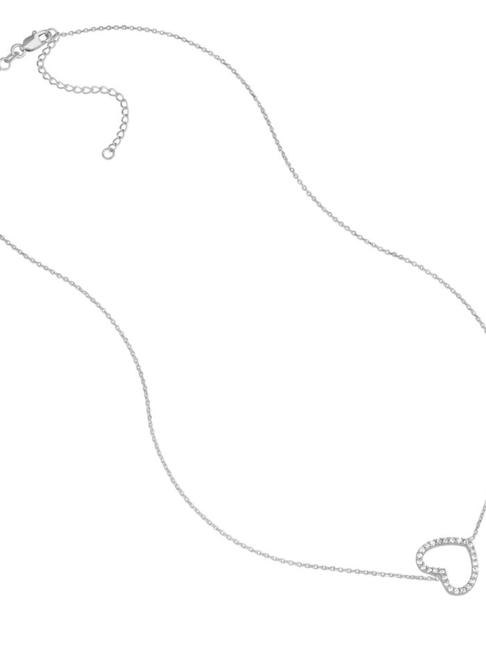 Capture the essence of love with this graceful sideways CZ heart necklace. Crafted from Sterling Silver and featuring a delicate open heart design adorned with sparkling CZ stones, this necklace is a timeless symbol of affection. The adjustable cable chain allows for a personalized fit, making it perfect for layering or wearing solo.