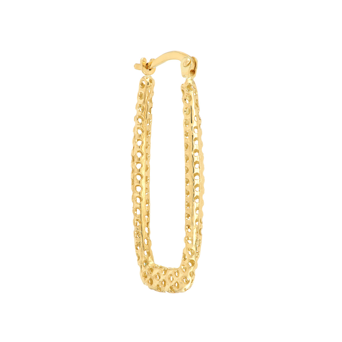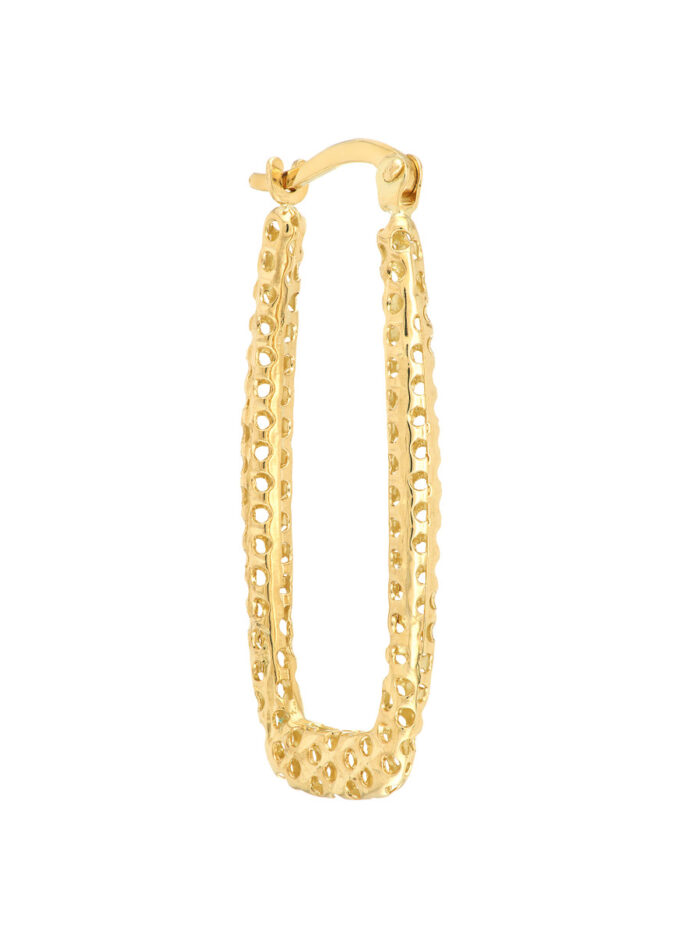 These square laser hoop earrings offer a contemporary twist on a traditional design. Crafted from 14K yellow gold, the laser-cut squares create a unique and eye-catching pattern. The secure hinge closure ensures comfortable wear throughout the day, making them perfect for both casual and dressy occasions.