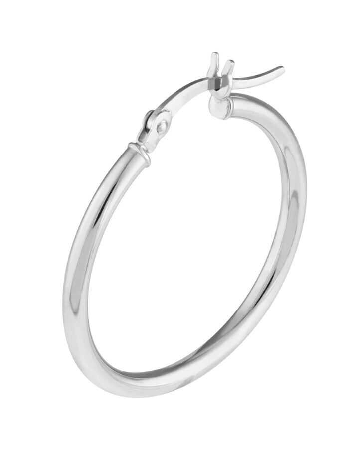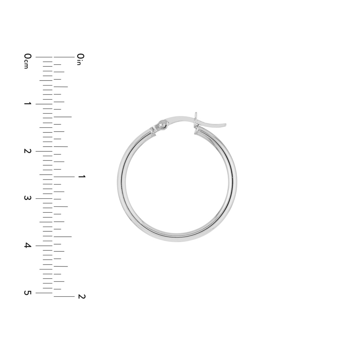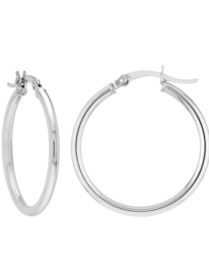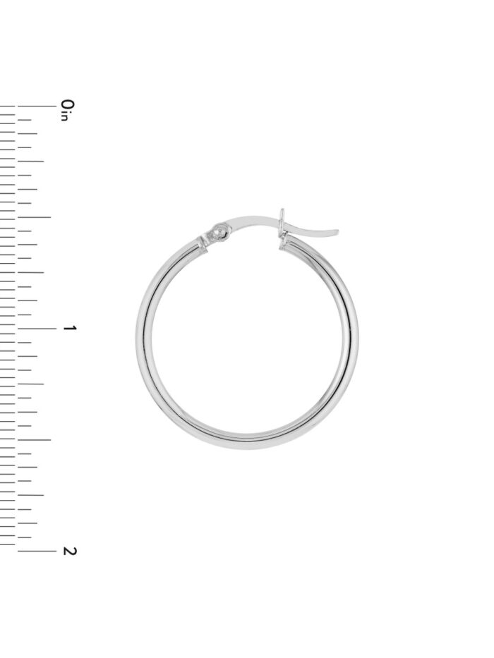 These minimalist Sterling Silver polished hoop earrings are the perfect everyday accessory. Crafted from rhodium plated Sterling Silver, they feature a sleek, polished finish and a secure hinge closure for effortless wear. Measuring 2mm wide and 25mm in diameter, these hoops offer a subtle yet stylish touch to any outfit. Add a touch of elegance to your look with these timeless earrings.