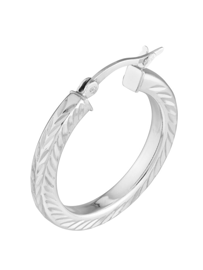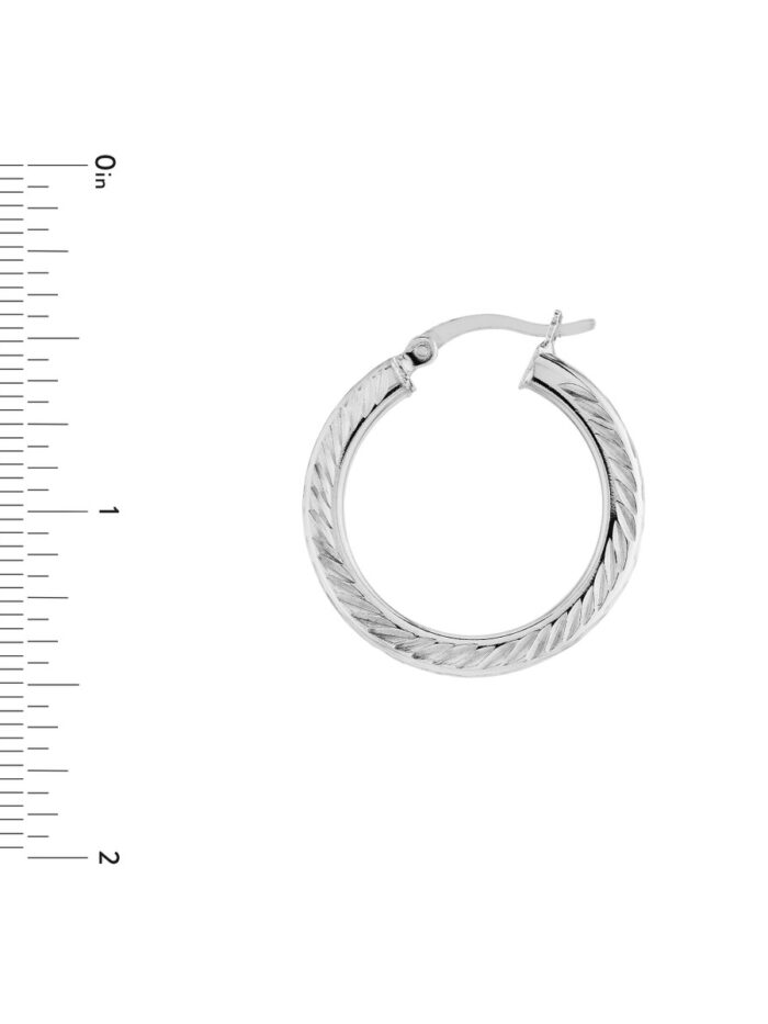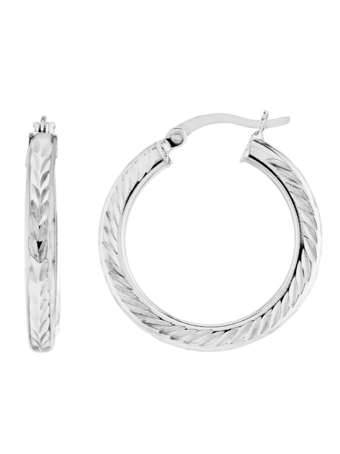 Add a touch of sparkle to your everyday look with these Sterling Silver Diamond-Cut Hoop Earrings. The classic hoop shape is elevated by a shimmering diamond-cut design, creating a look that is both stylish and timeless. The rhodium plating adds a lustrous finish and ensures these earrings will stay bright for years to come.