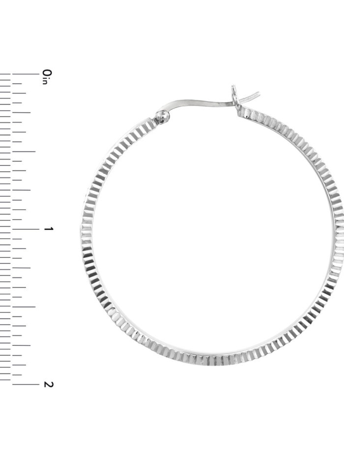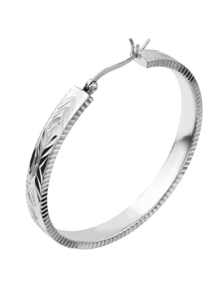 Make a bold statement with these Sterling Silver diamond-cut patterned hoop earrings. The intricate patterned design adds a touch of sophistication and individuality to your look. Crafted from durable Sterling Silver, these earrings are both stylish and comfortable to wear. The secure hinge closure ensures they stay in place all day long.