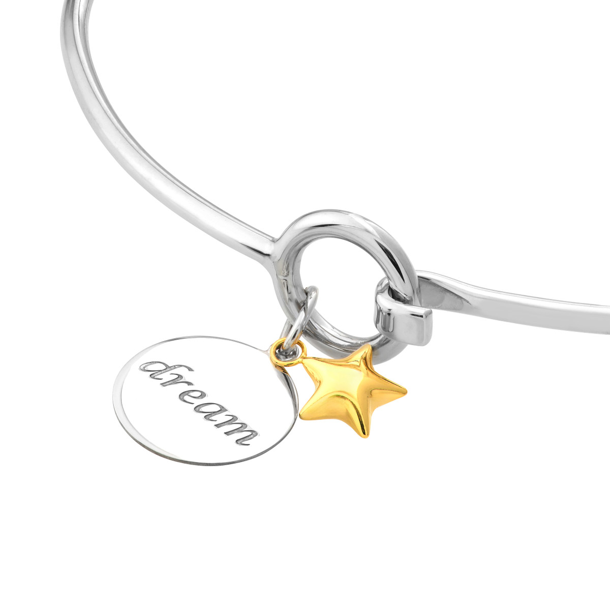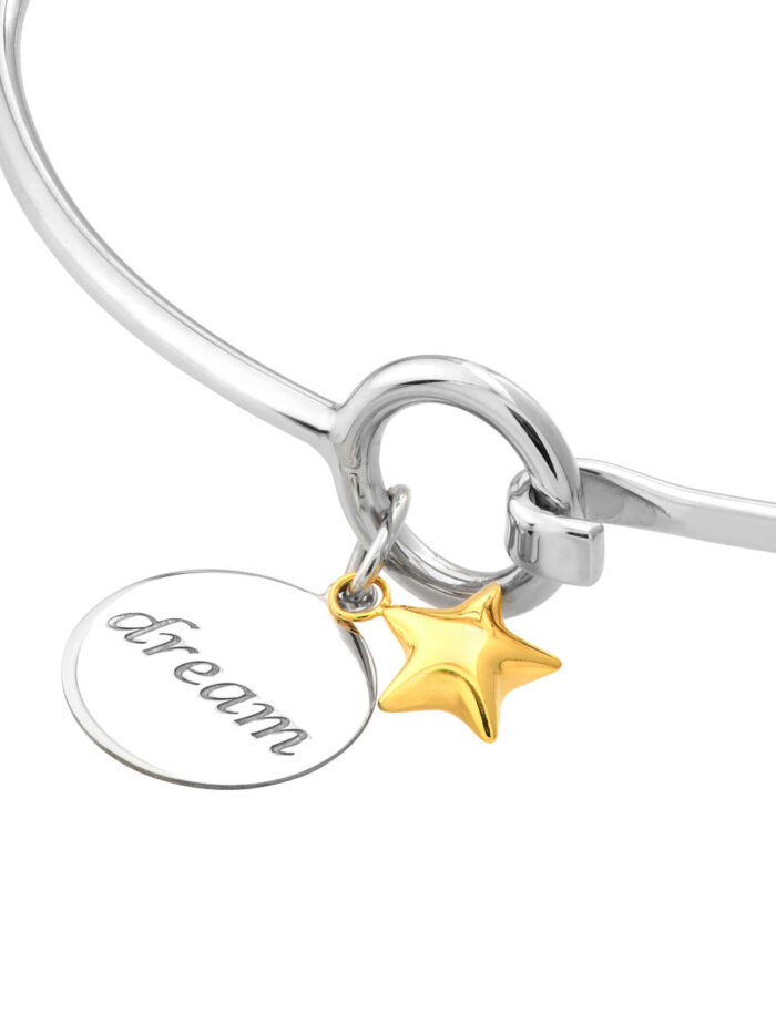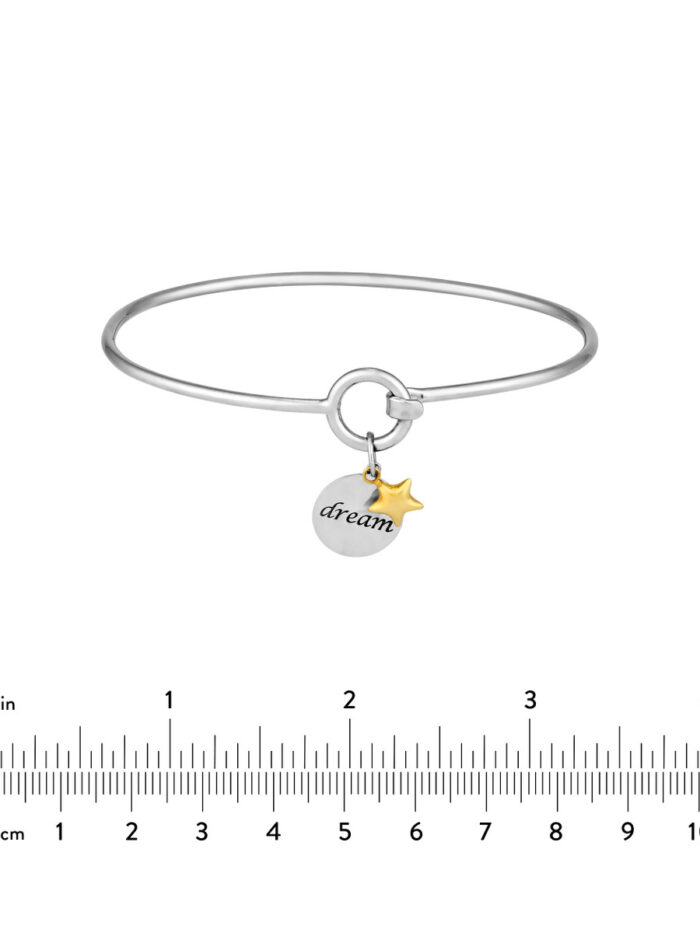 This sweet and delicate sterling silver bangle is the perfect gift to inspire dreams. The bangle features a beautifully engraved charm with the word “dream” and is topped off with a sparkling 14K gold star dangle. A touching reminder of hope and aspirations, it makes a lovely everyday accessory or a thoughtful present for a loved one.