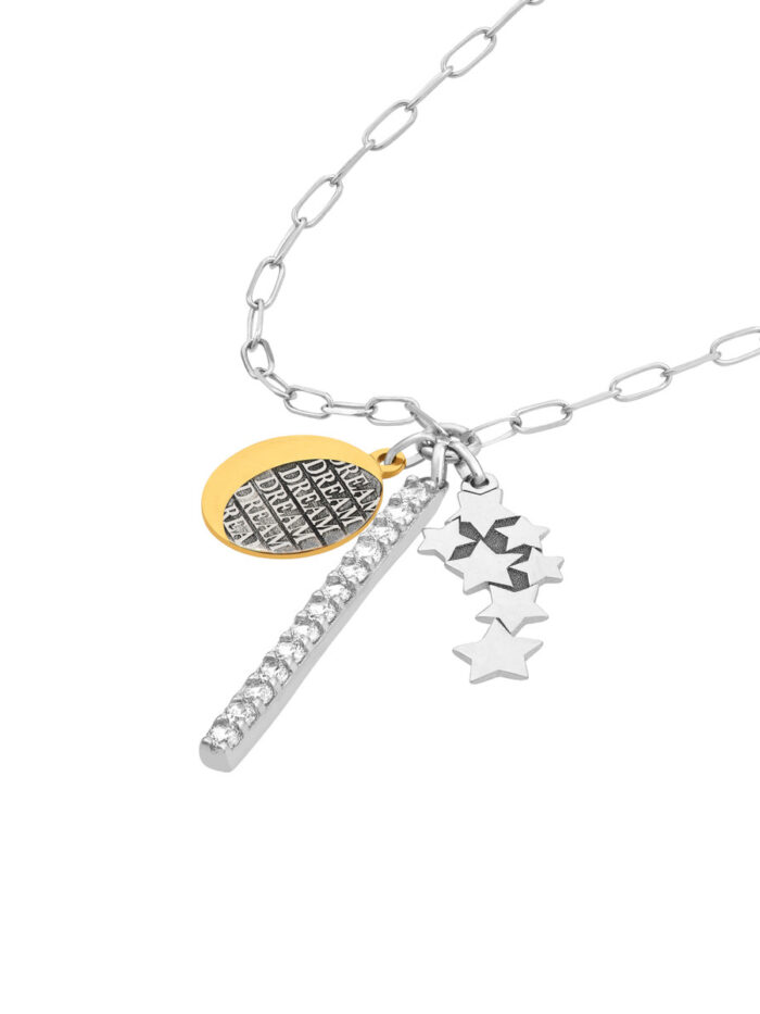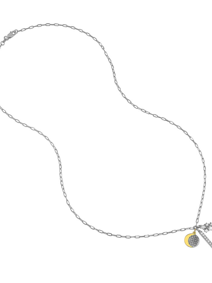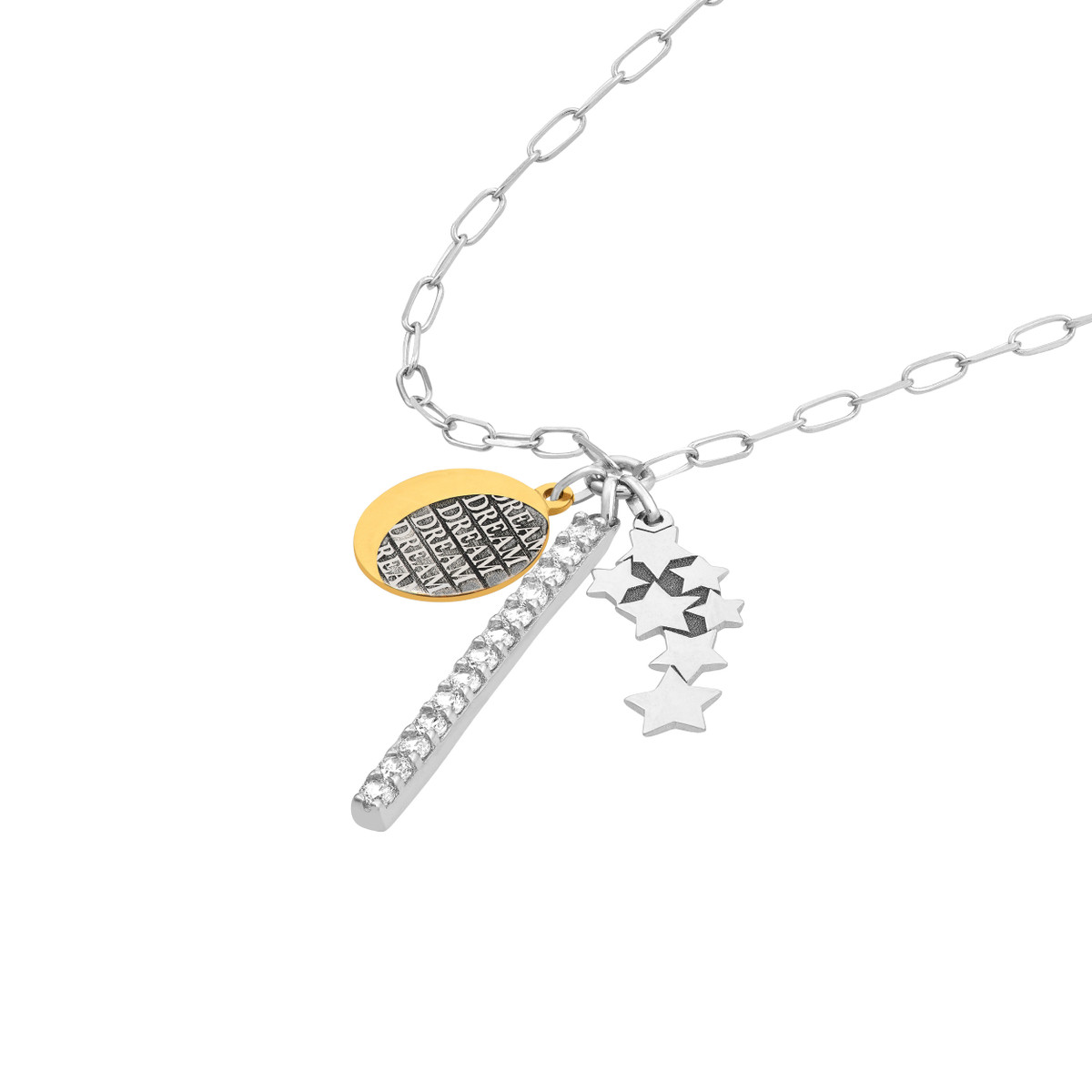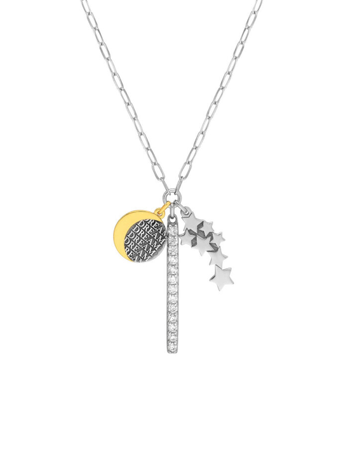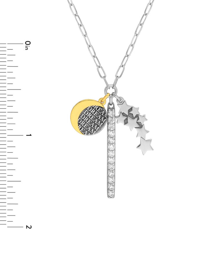 Embrace your dreams with this enchanting Sterling Silver necklace. Featuring a Paper Clip Chain and a gorgeous CZ bar adorned with celestial dream charms, it’s a truly unique and inspiring piece. The rhodium and yellow gold plating adds a touch of luxury and shine, making it perfect for both everyday wear and special occasions. This 20-inch fixed length necklace is a beautiful reminder to always follow your dreams.