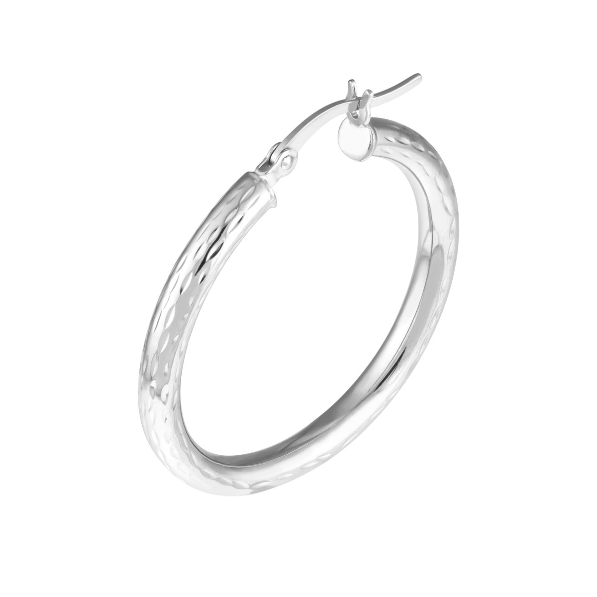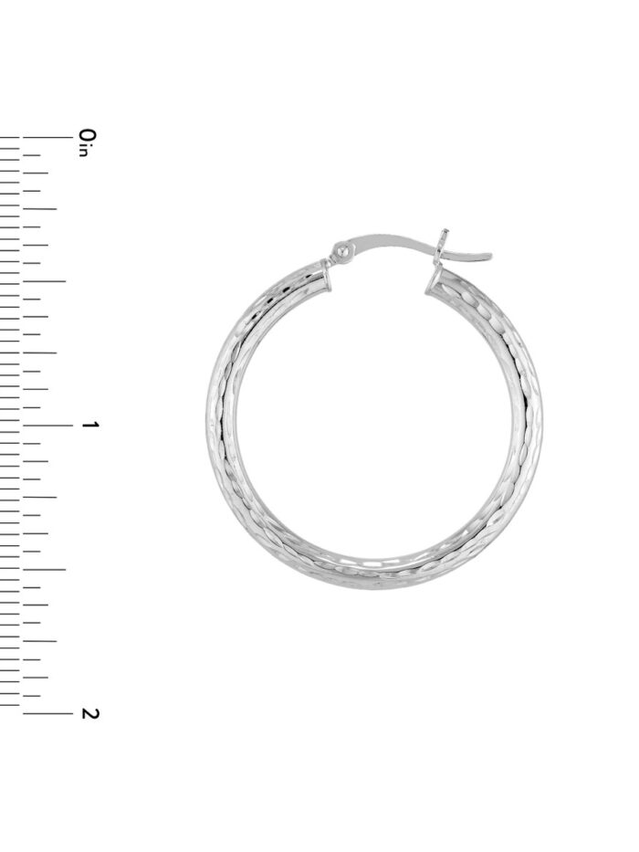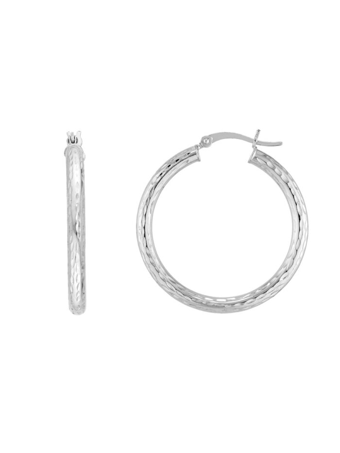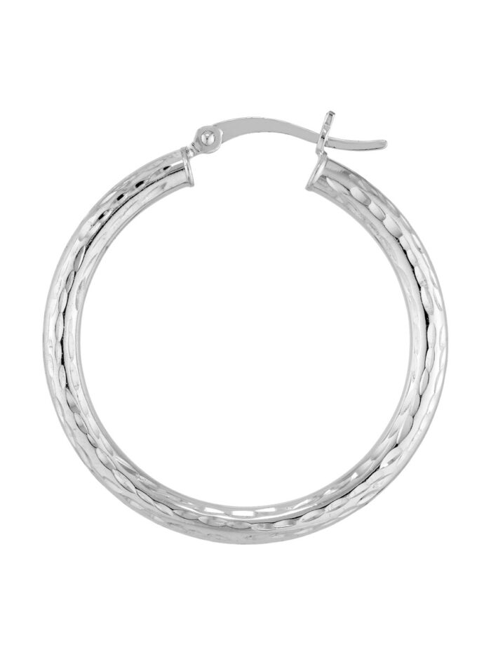 Shine bright with these dazzling Sterling Silver diamond-cut hoop earrings. Measuring 3mm in width and 30mm in length, these hoops feature a captivating diamond-cut pattern that catches the light with every movement. The rhodium plating adds a touch of brilliance and protects the silver, ensuring lasting beauty. Crafted from high-quality sterling silver, these earrings are both stylish and durable, making them a timeless addition to your jewelry collection.
