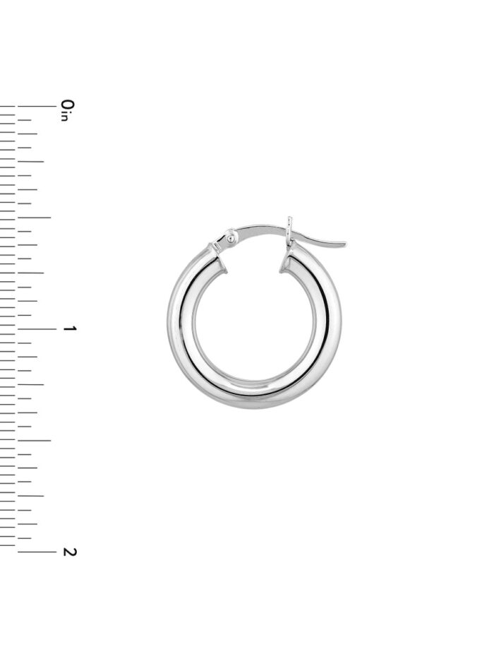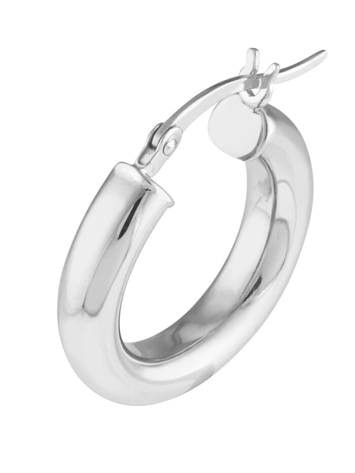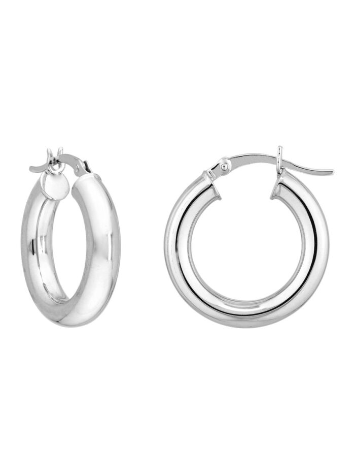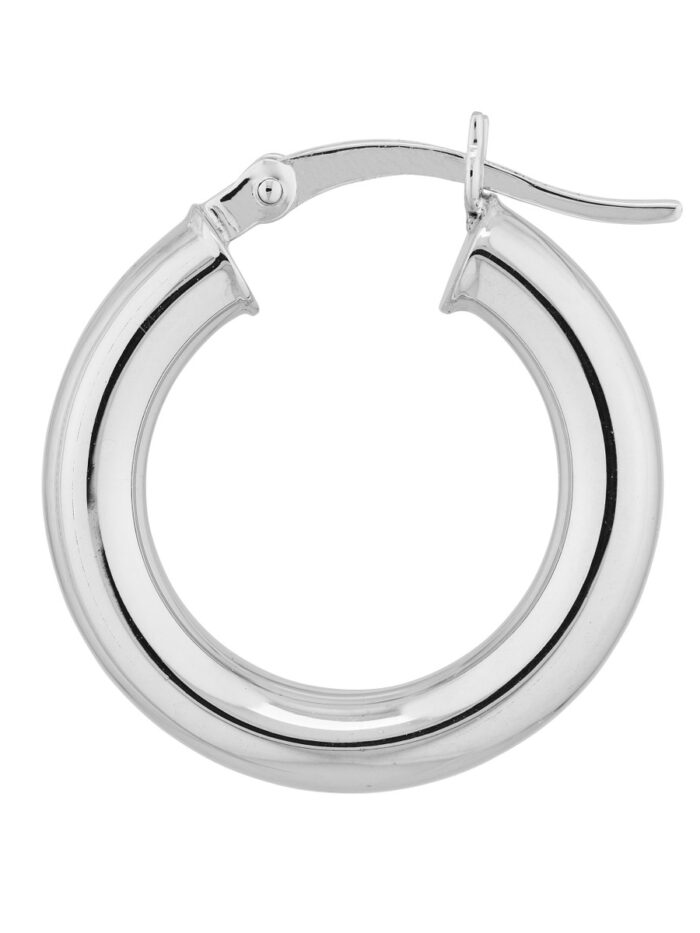 These Sterling Silver hoop earrings are a timeless and versatile accessory. Crafted with a smooth, polished finish and rhodium plating for a luxurious shine, they add a touch of elegance to any look. Measuring 4mm in width and 20mm in length, these hoops are comfortable to wear and perfect for everyday wear.