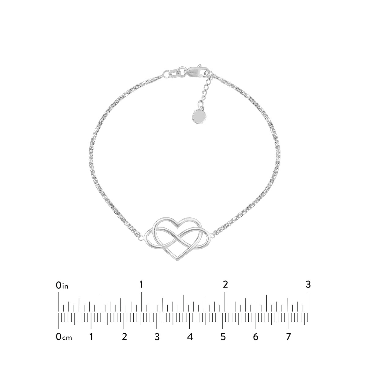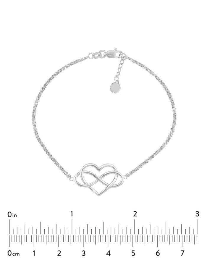Make a statement with this rhodium-plated sterling silver infinity heart bracelet. Its sleek and modern design adds a touch of sophistication to any wrist. The adjustable chain (7.5 inches) allows for a customizable fit. The secure lobster closure ensures the bracelet stays in place all day long.