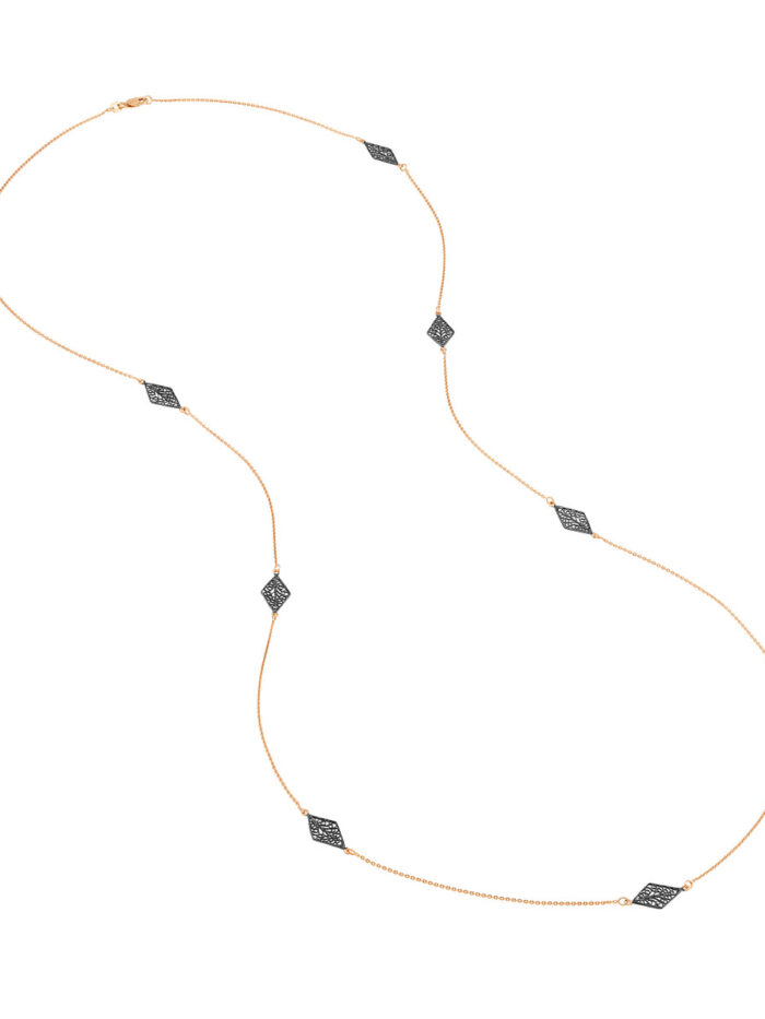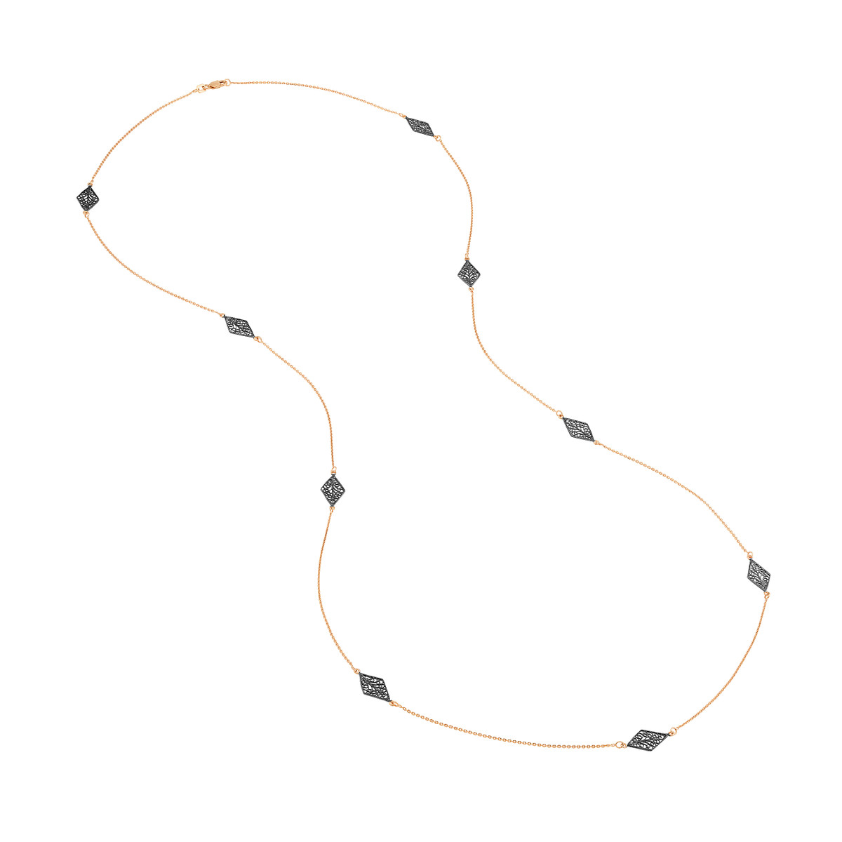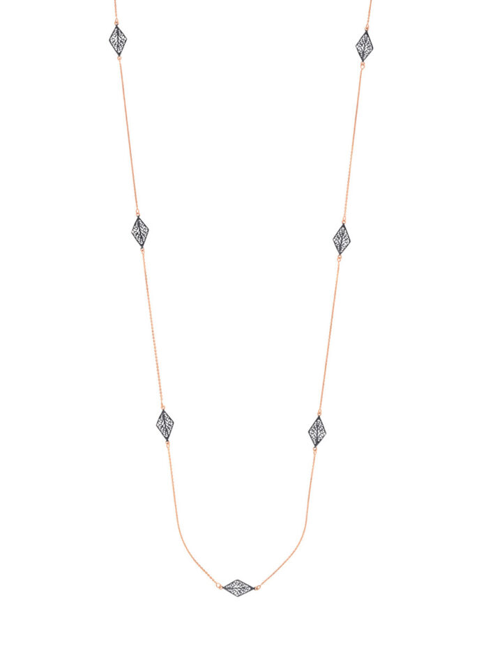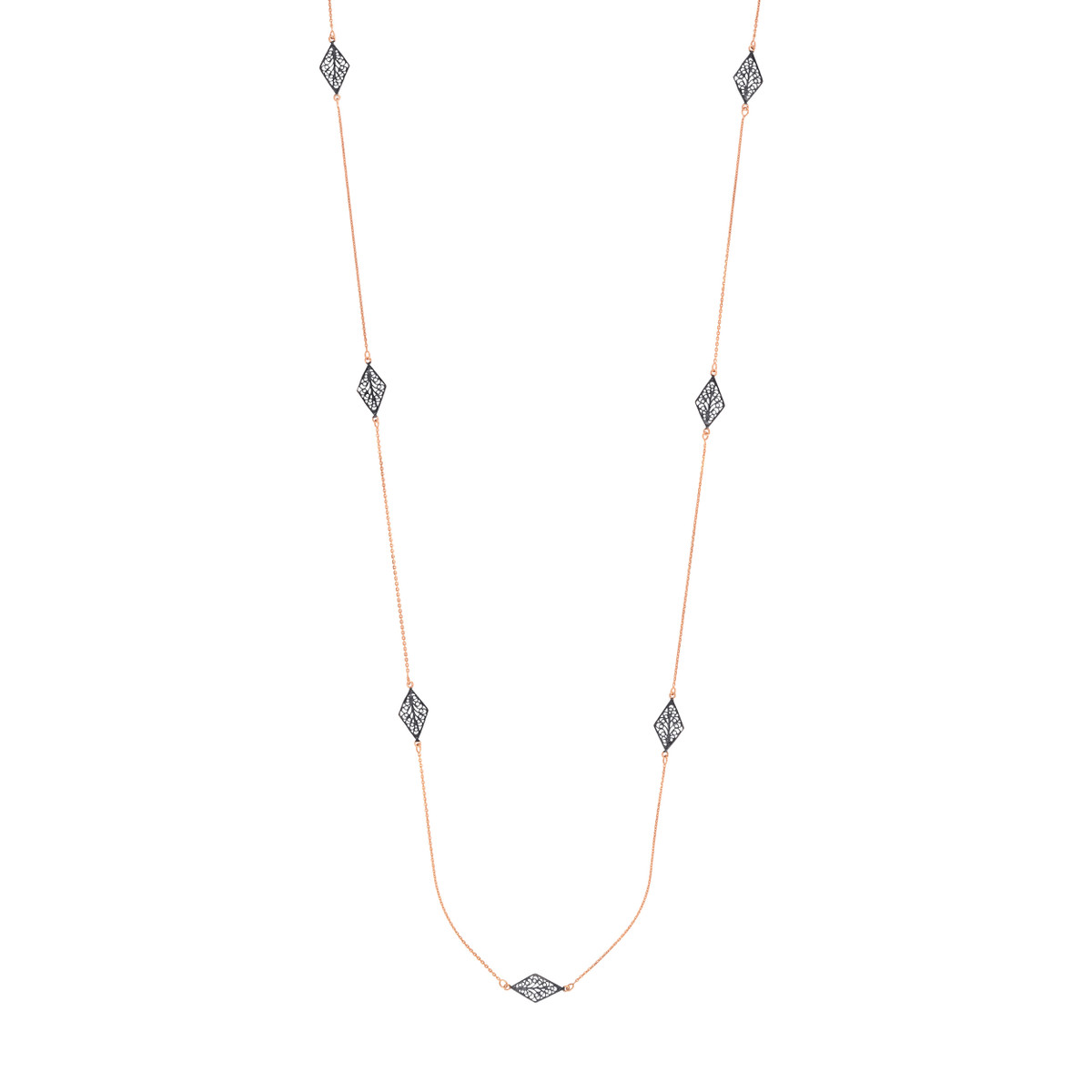 Add a touch of regal charm to your ensemble with this exquisite 36-inch long necklace. Crafted from sterling silver and plated in rose gold, it features intricately detailed black rhodium-plated kite-shaped filigree stations that gracefully adorn the cable chain. This necklace is a stunning statement piece, perfect for elevating your style for special occasions or adding a touch of sophistication to everyday wear.