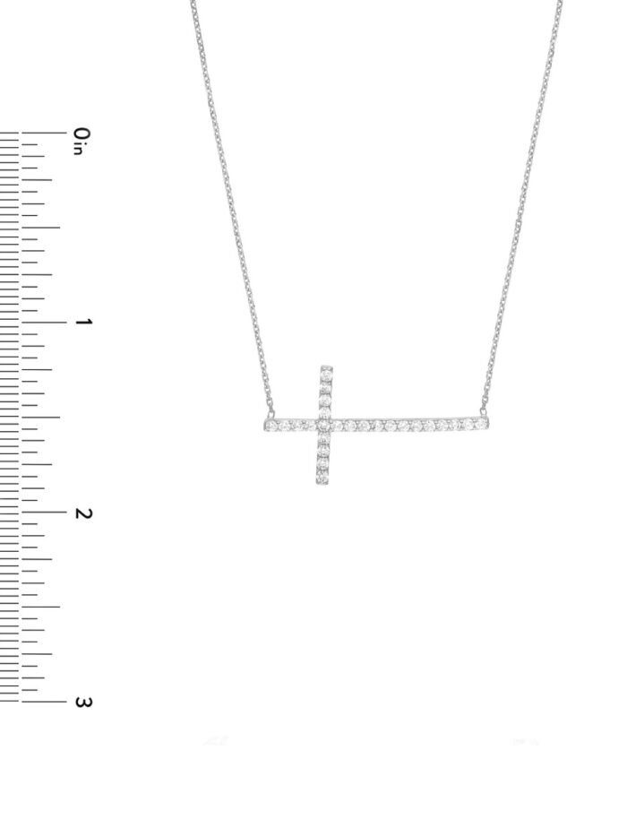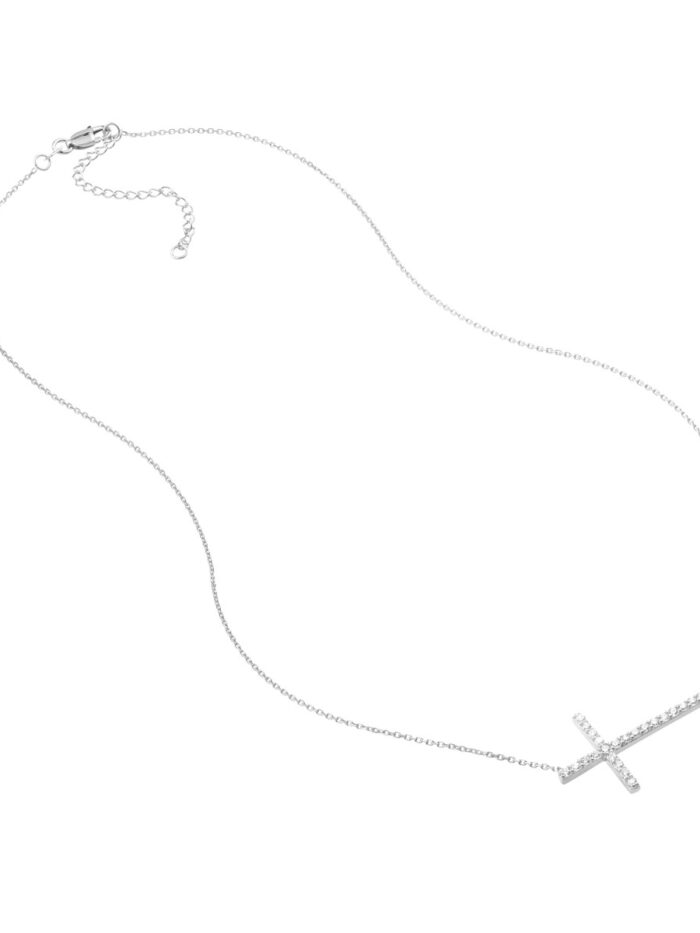 Make a classic statement with this timeless sideways cross necklace. Crafted from sterling silver and adorned with sparkling cubic zirconia accents, it exudes understated elegance. The delicate cable chain complements the cross design, creating a harmonious and sophisticated look. At 18 inches in length, it gracefully rests on your collarbone, making a subtle yet meaningful statement.