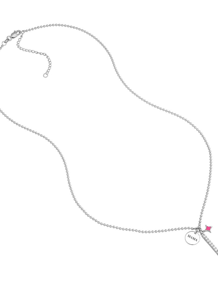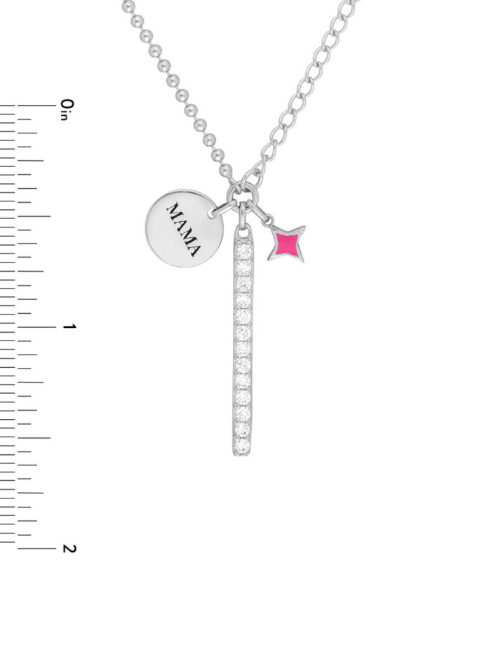 Express your love with this charming Sterling Silver necklace. Featuring a delicate CZ bar engraved with ‘Mama’, it’s adorned with sparkling pink enamel star charms, making it a truly special piece. Crafted from high-quality Sterling Silver, this necklace is both elegant and enduring. Its adjustable 20-inch chain allows for a perfect fit, making it a thoughtful gift for any mother or woman who cherishes her family.