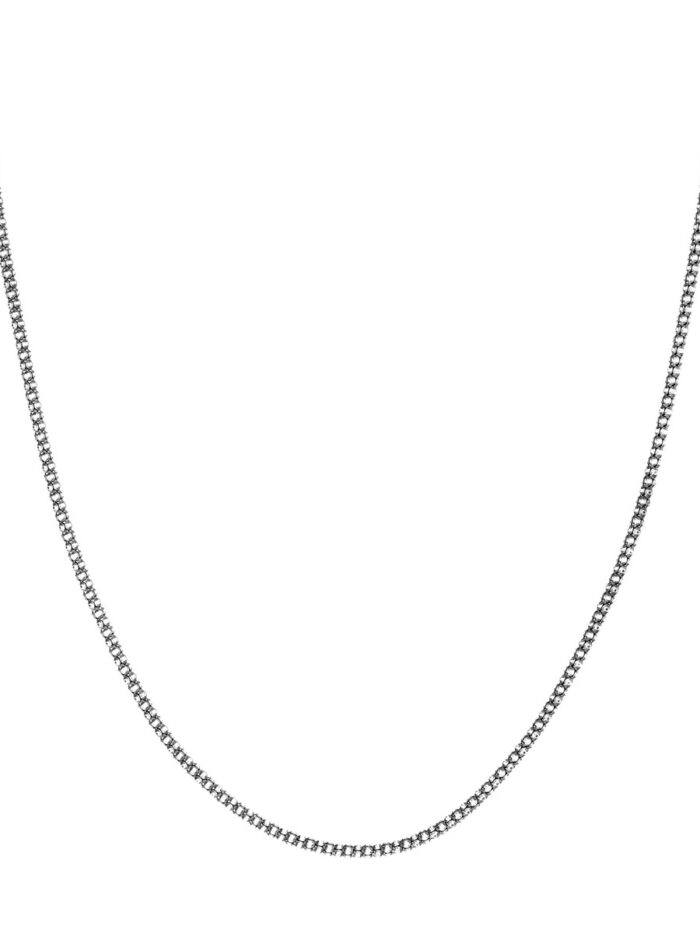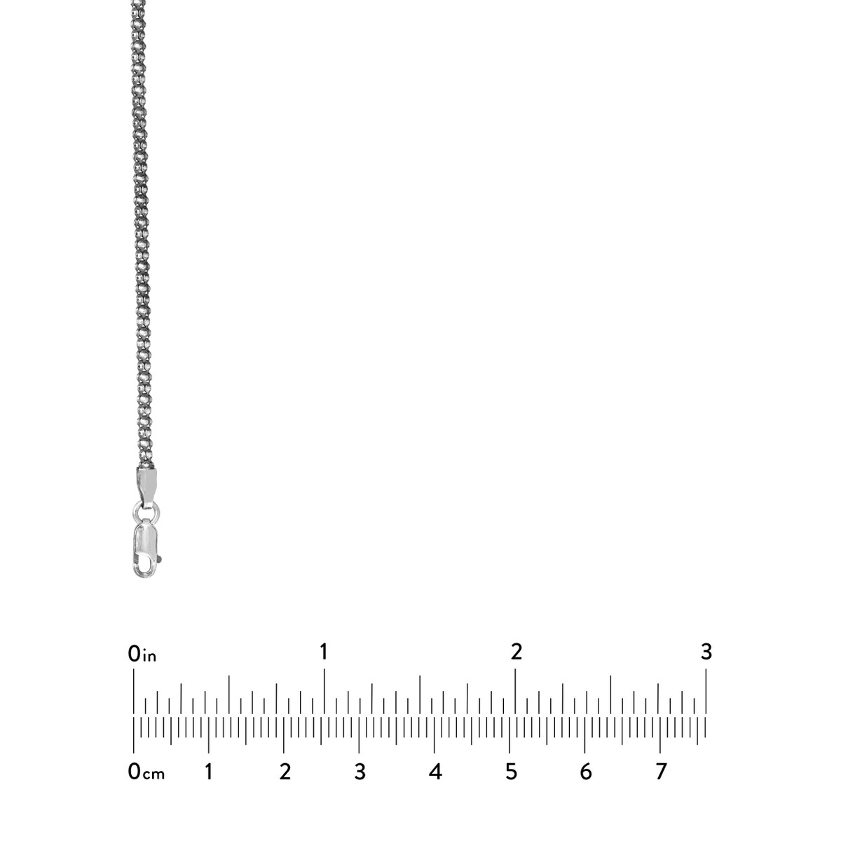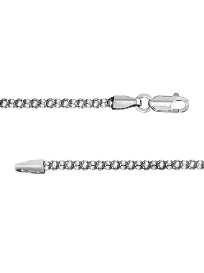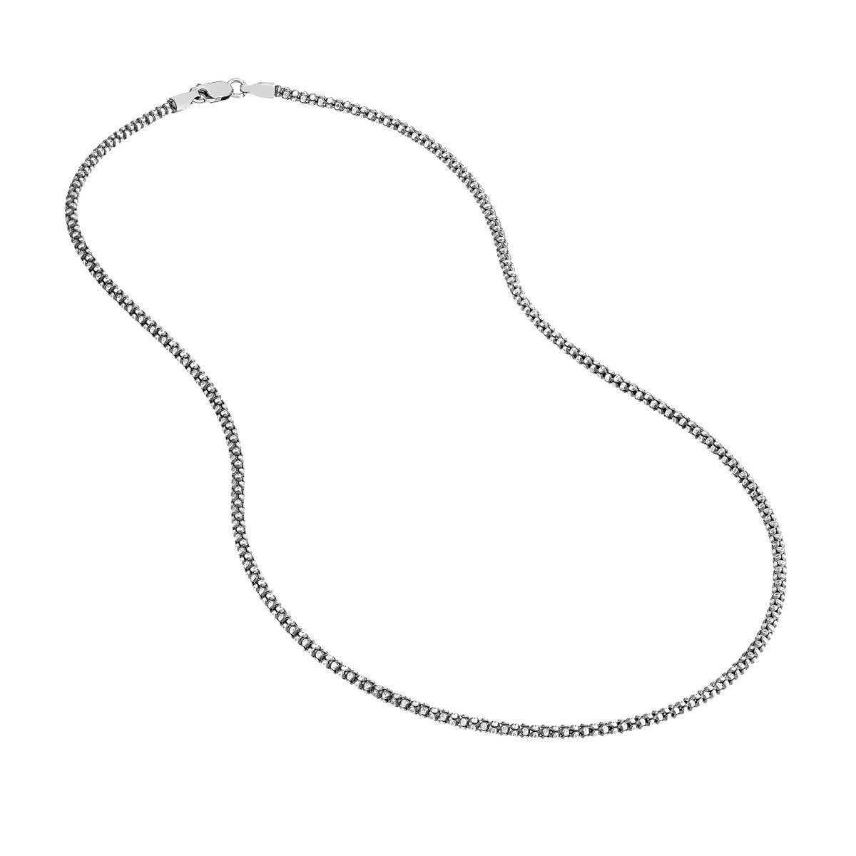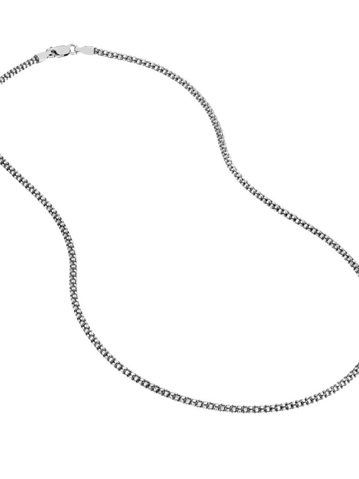 Embrace a touch of antique charm with this Sterling Silver Oxidized Popcorn Chain. Crafted from durable sterling silver, this unique chain features a popcorn design with a striking oxidized finish, giving it a vintage and rebellious allure. The 2.3mm width adds a subtle dimension, making it a stylish statement piece. The secure lobster clasp ensures comfortable wear, while the 16-inch length is perfect for a layered look or worn solo.