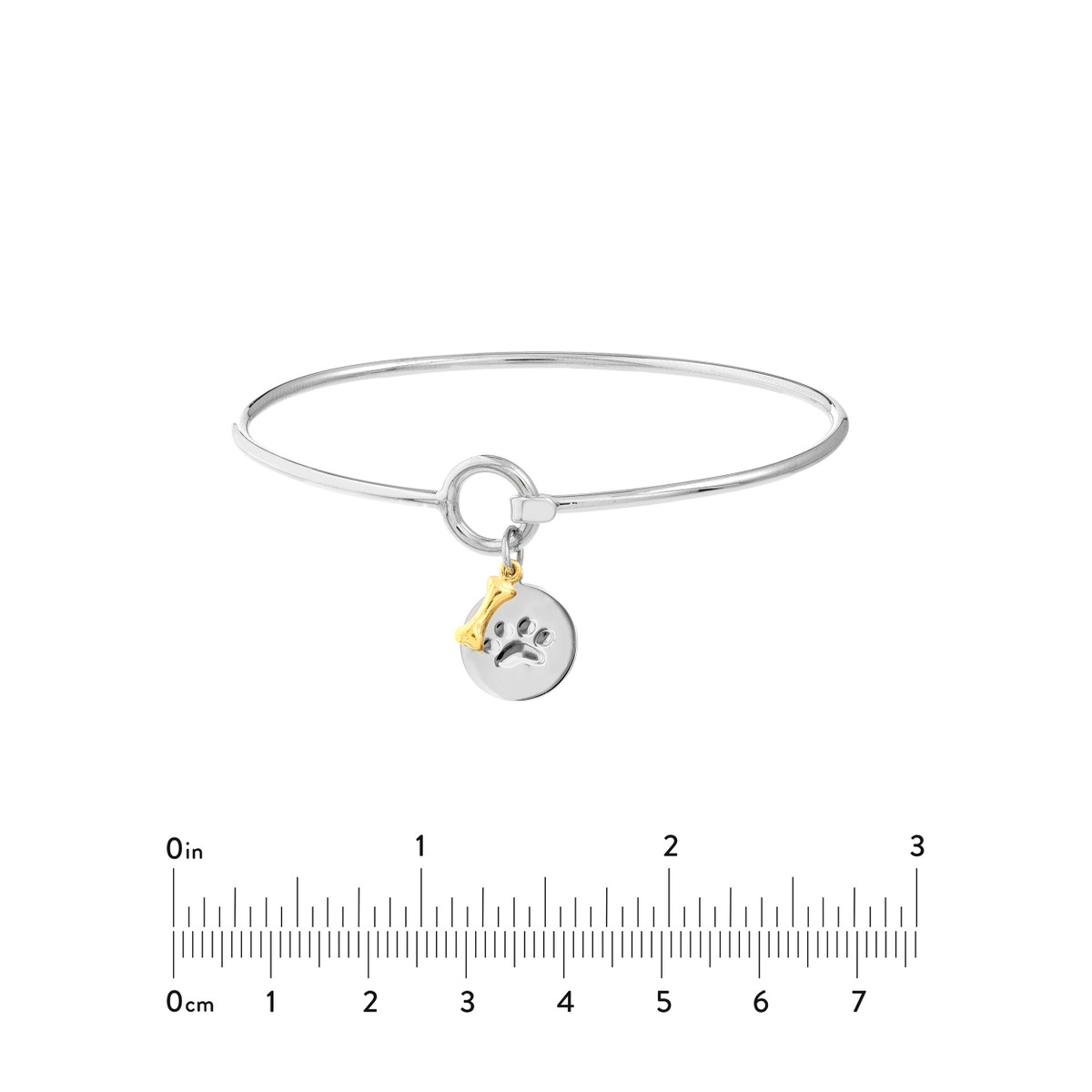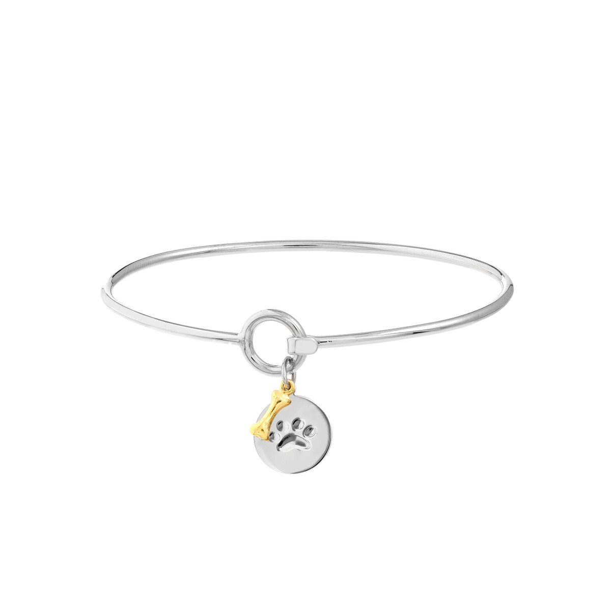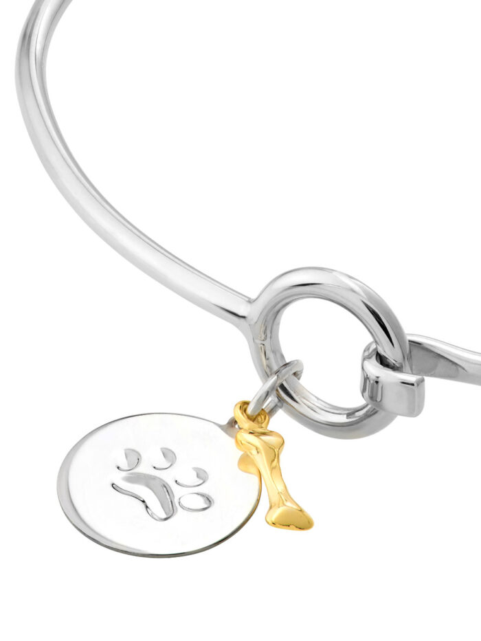 Celebrate your love for your furry companion with this adorable sterling silver bangle. The bangle features a sweet paw print engraved charm and is topped off with a charming 14K gold dog bone dangle. This playful and meaningful bracelet makes a wonderful gift for any dog lover or a special way to remember a beloved pet.