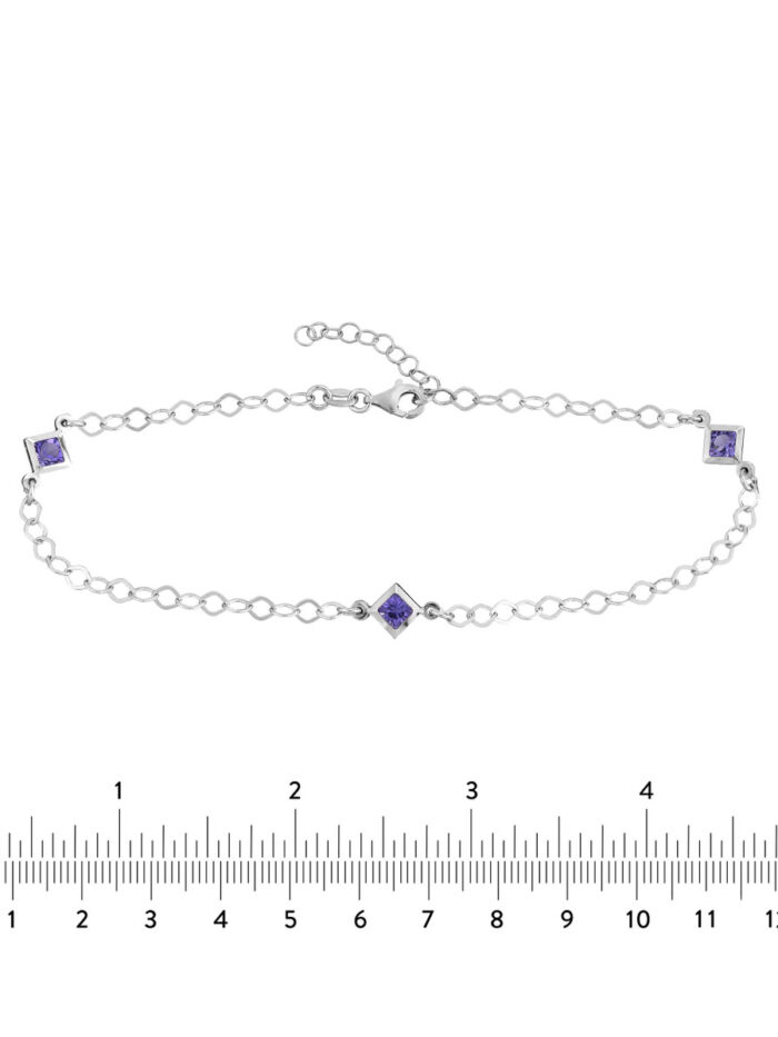 Add a touch of purple glamour to your look with this Sterling Silver Purple CZ Rhombus Stations Anklet. The vibrant purple CZ stones add a pop of color, while the cable chain creates a delicate and feminine look. The anklet is adjustable from 9 to 10 inches for a perfect fit. Rhodium plating provides extra shine and protection.
