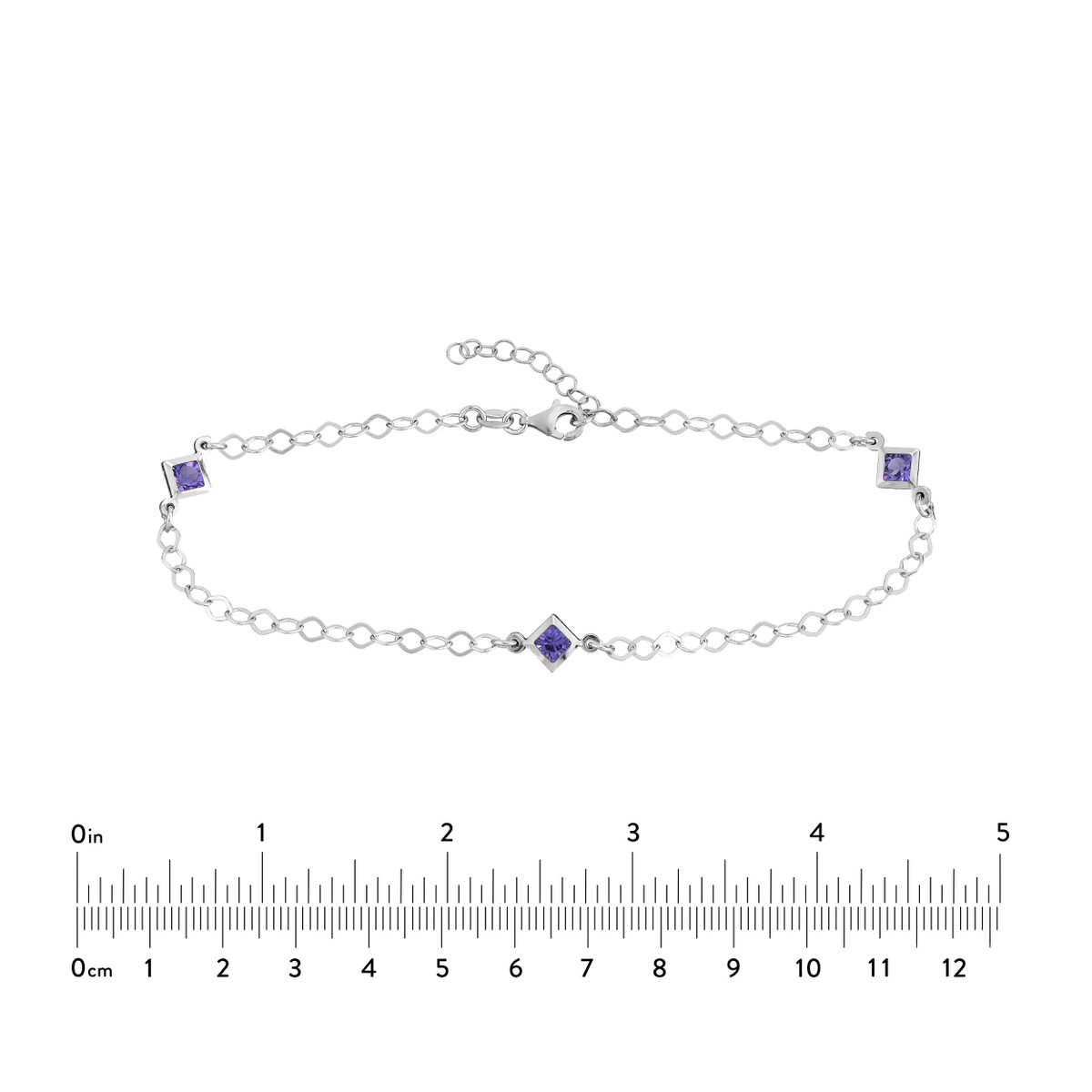 Add a touch of purple glamour to your look with this Sterling Silver Purple CZ Rhombus Stations Anklet. The vibrant purple CZ stones add a pop of color, while the cable chain creates a delicate and feminine look. The anklet is adjustable from 9 to 10 inches for a perfect fit. Rhodium plating provides extra shine and protection.